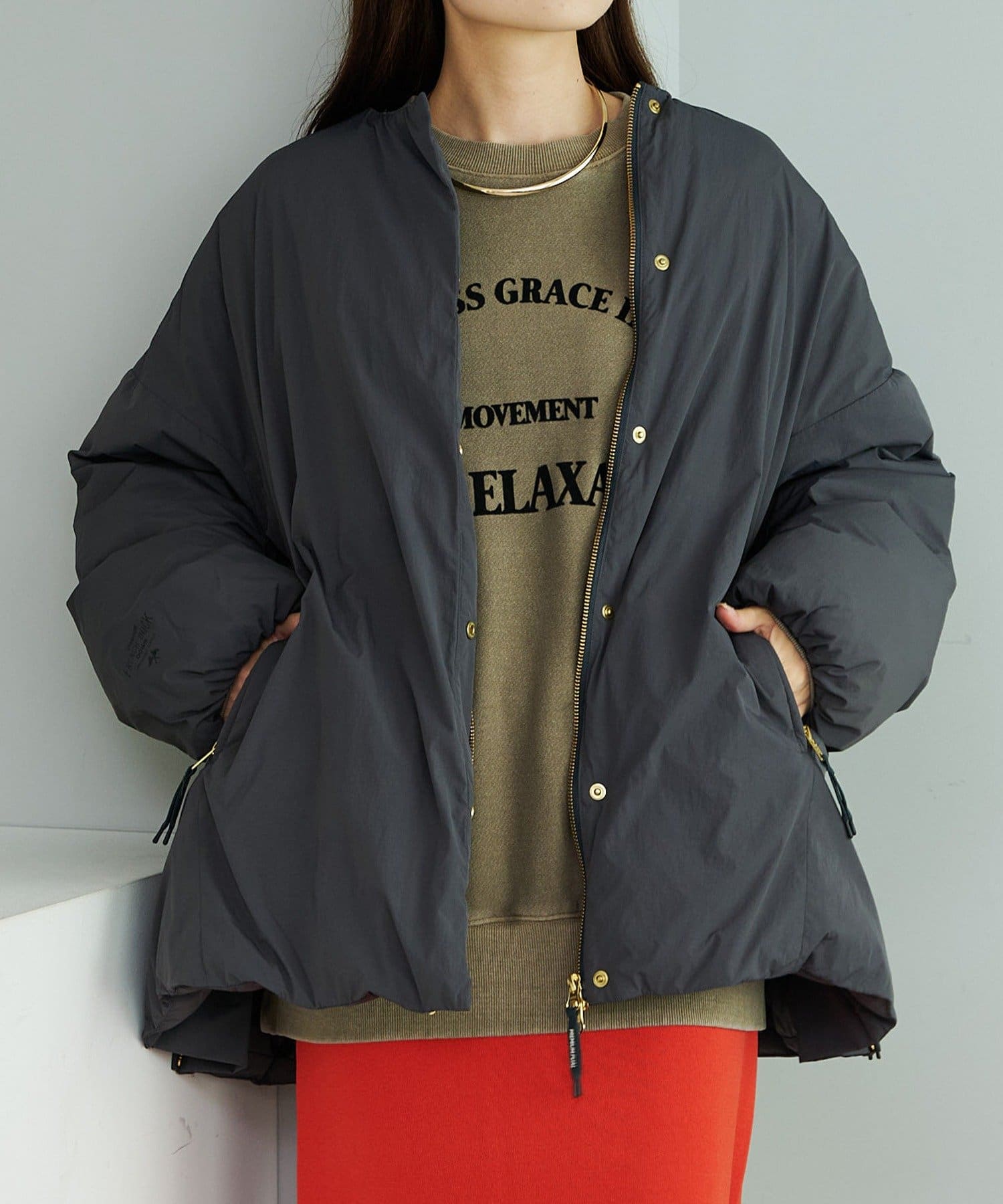 腰回りをすっぽりと覆う丈感で、身幅も腕回りもゆったりしているので、