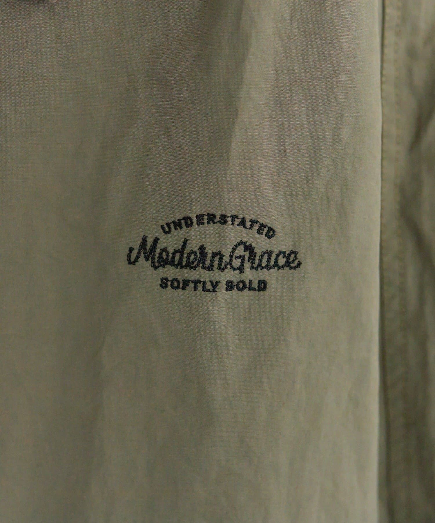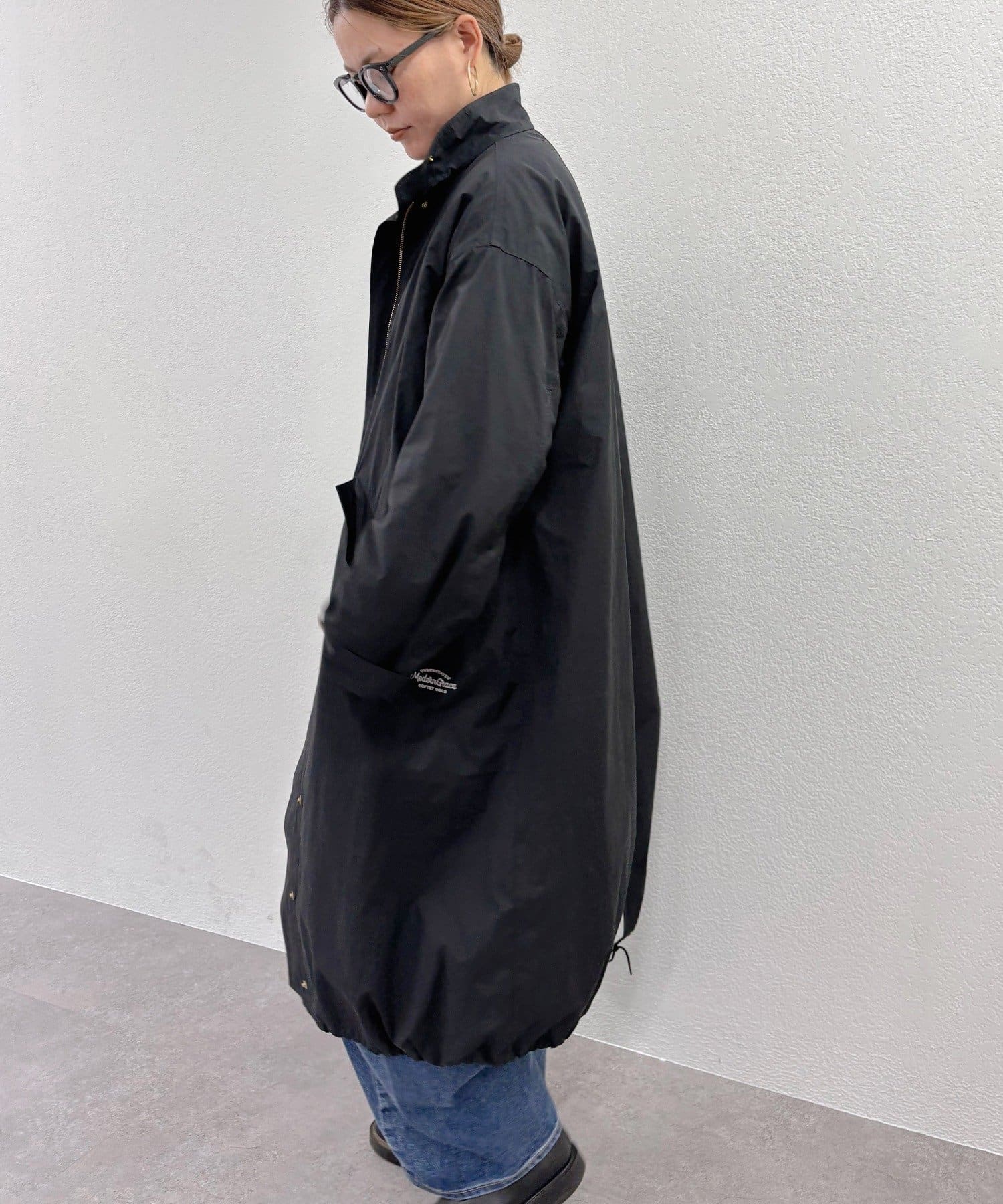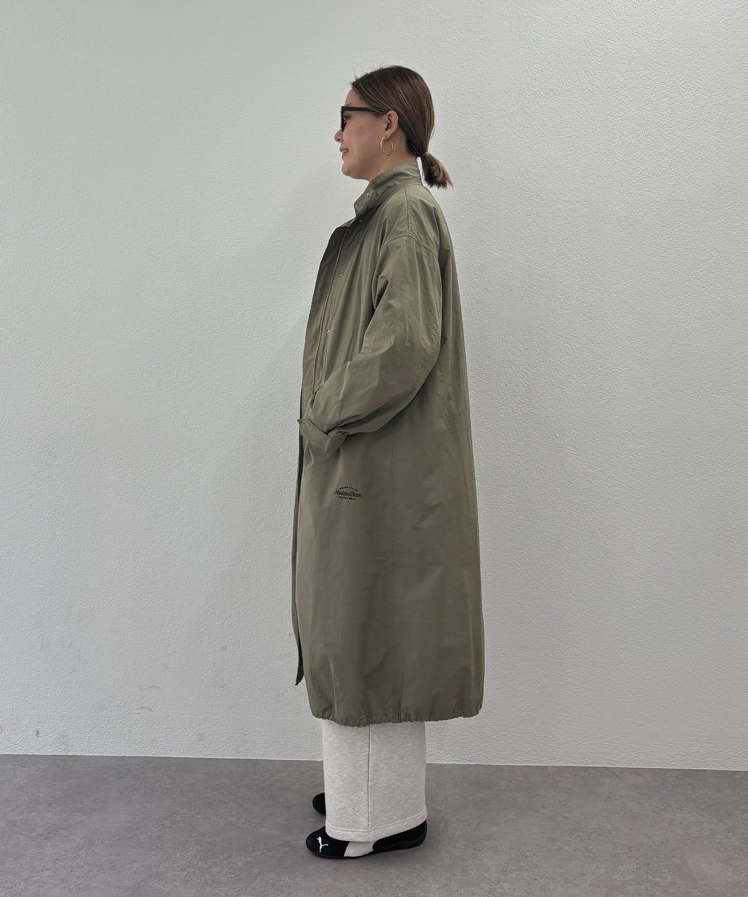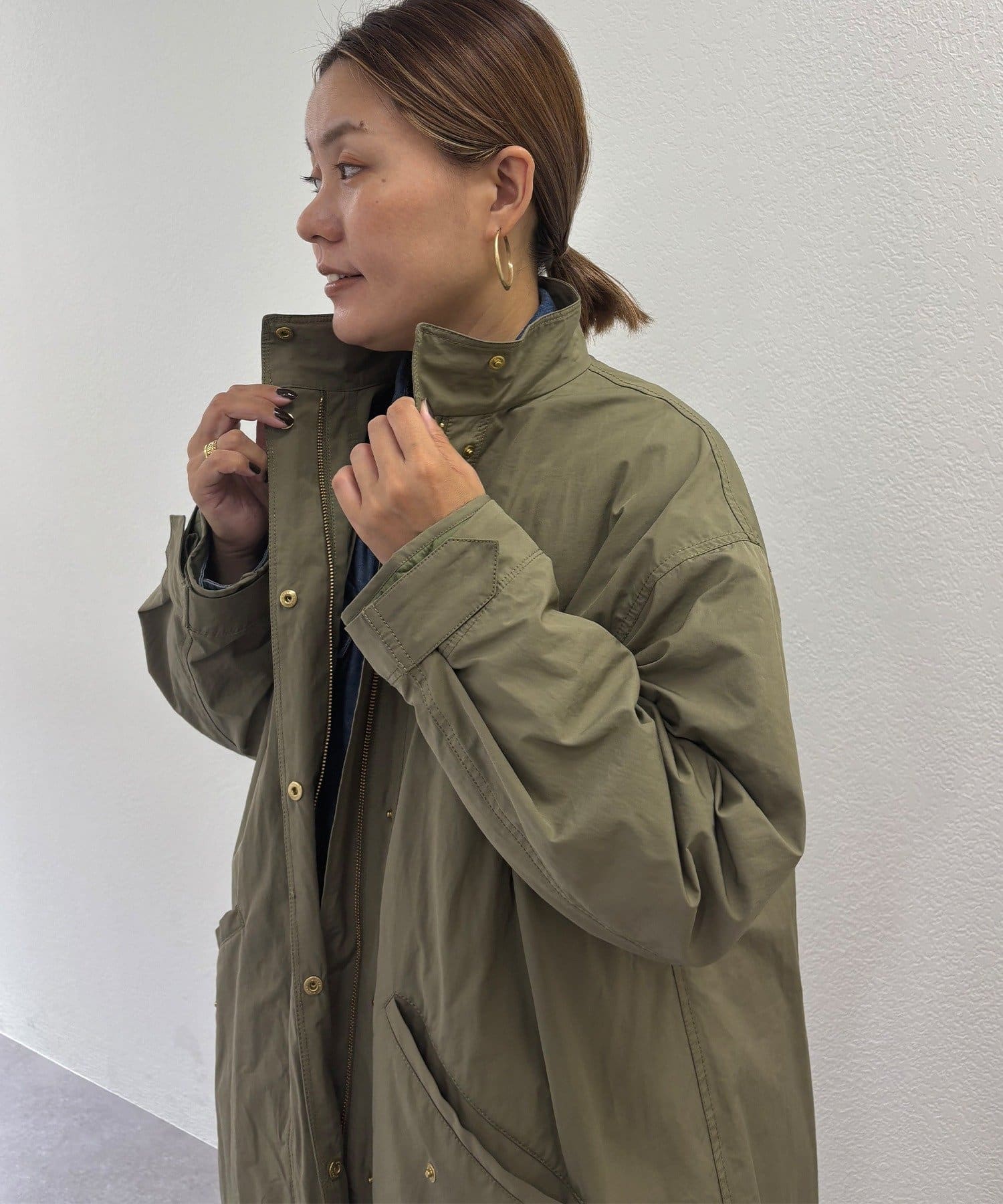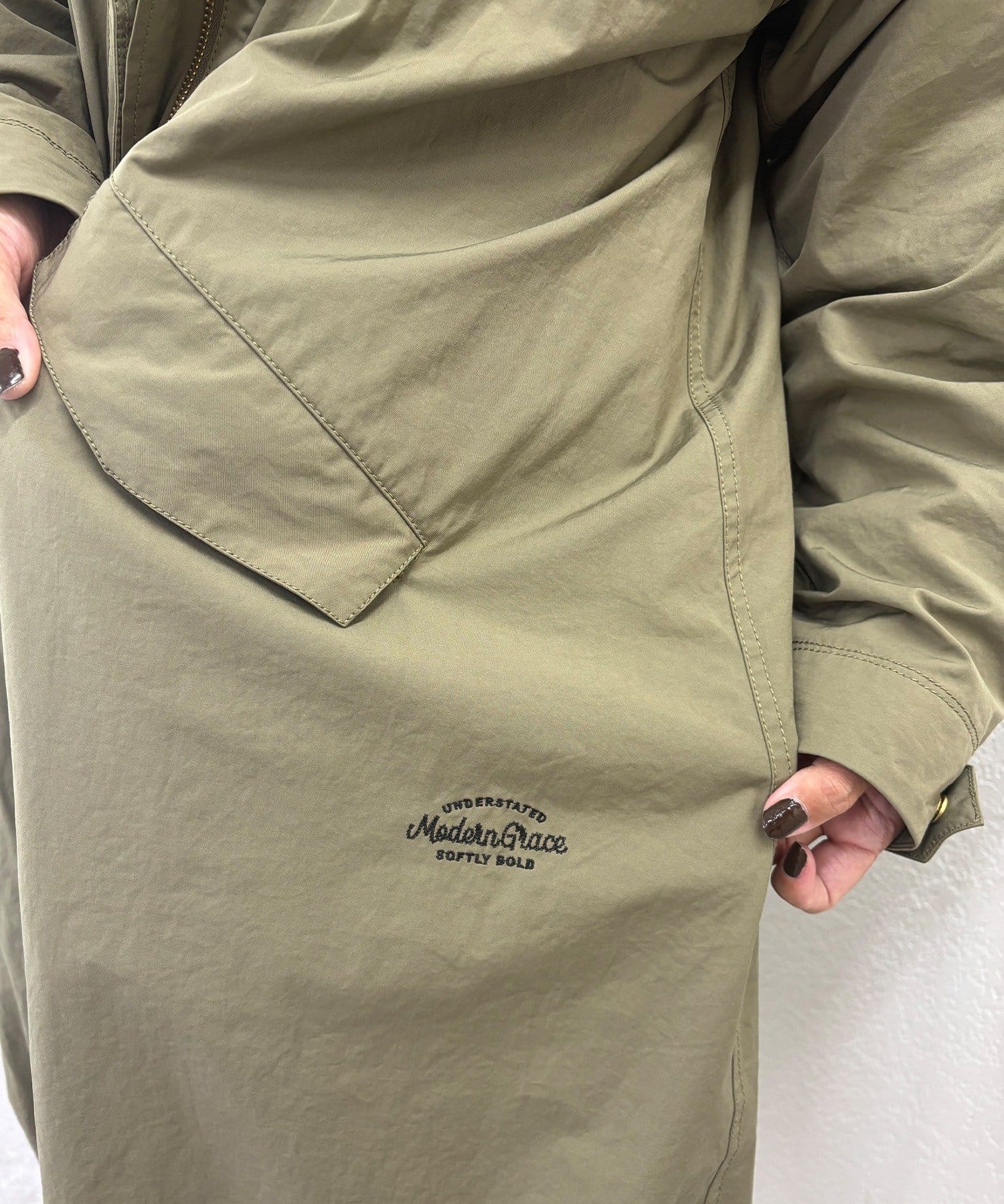フロントは風を通しにくい比翼仕立て+ジップ仕様、後ろの裾にはフィッシュテールデザインを施しこなれ感を演出。