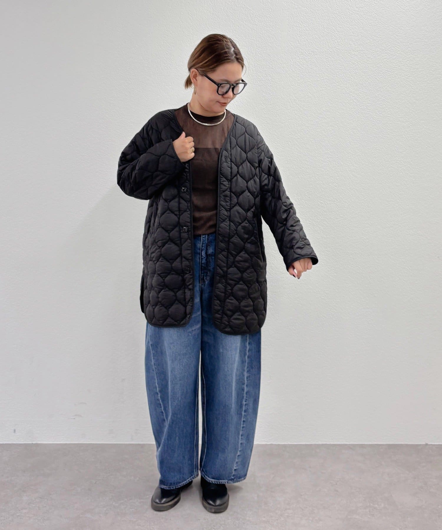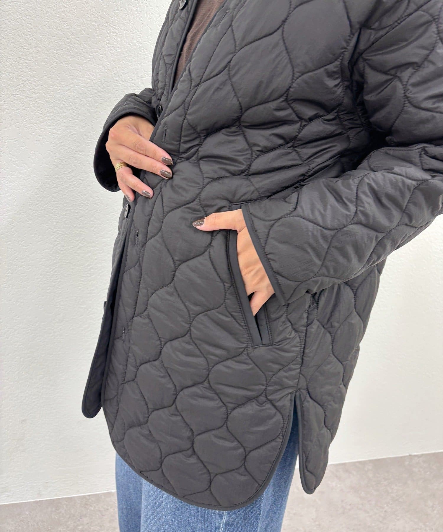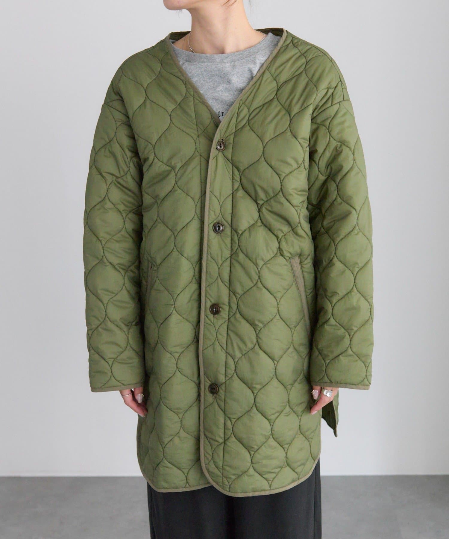 キルティングコートは柔らかな波型の模様で、1枚で着れば優しい大人女性らしい雰囲気にマッチ。