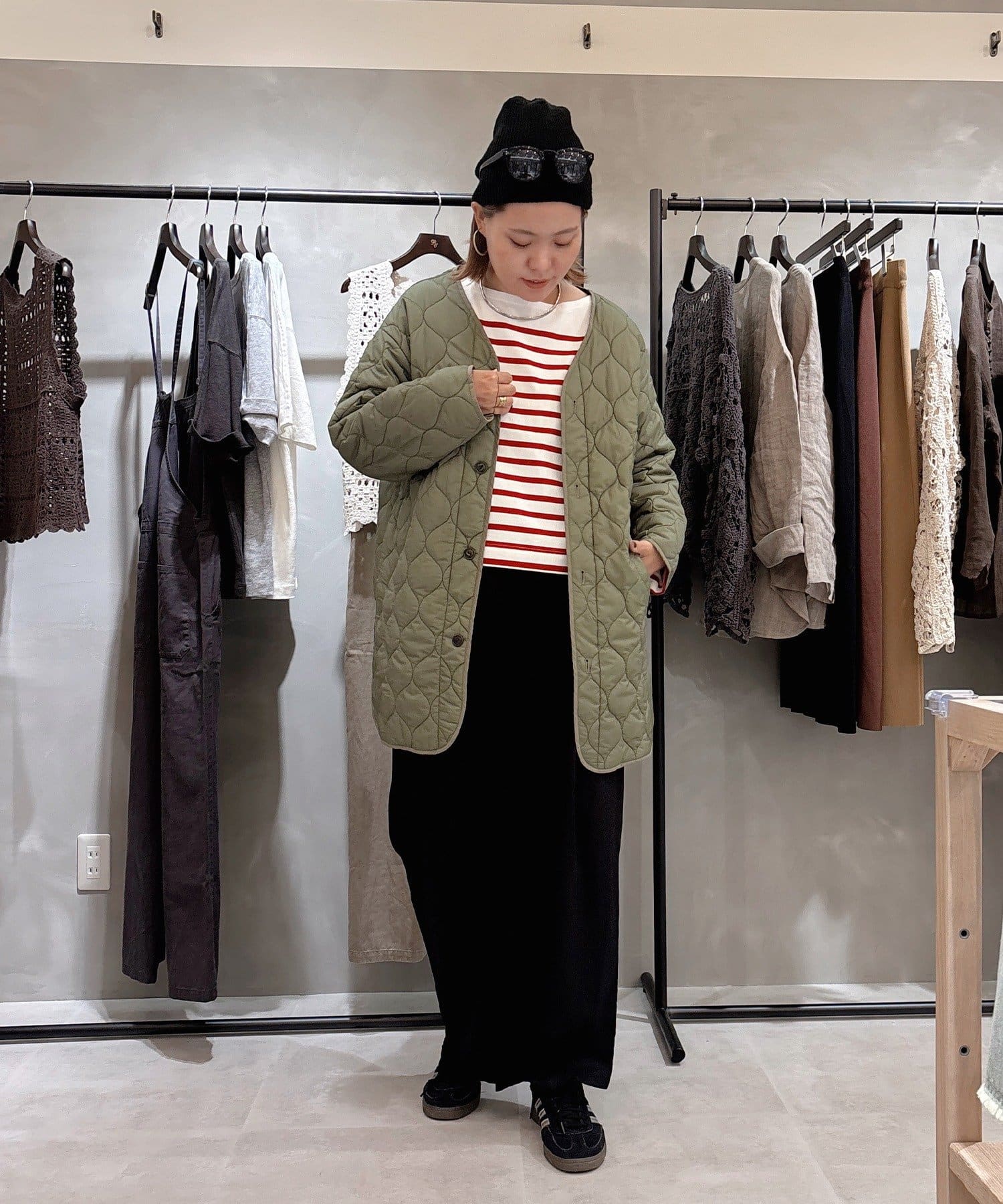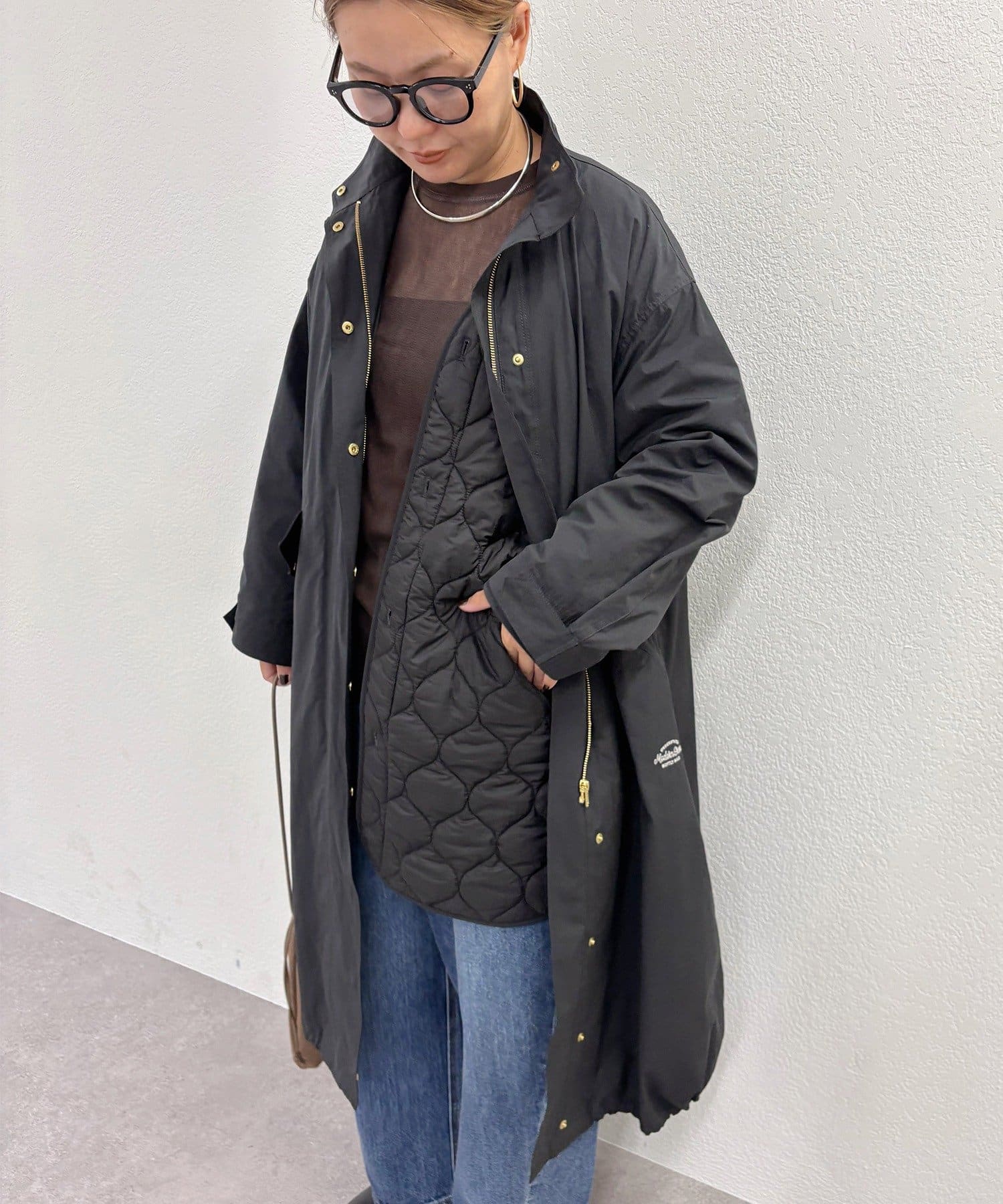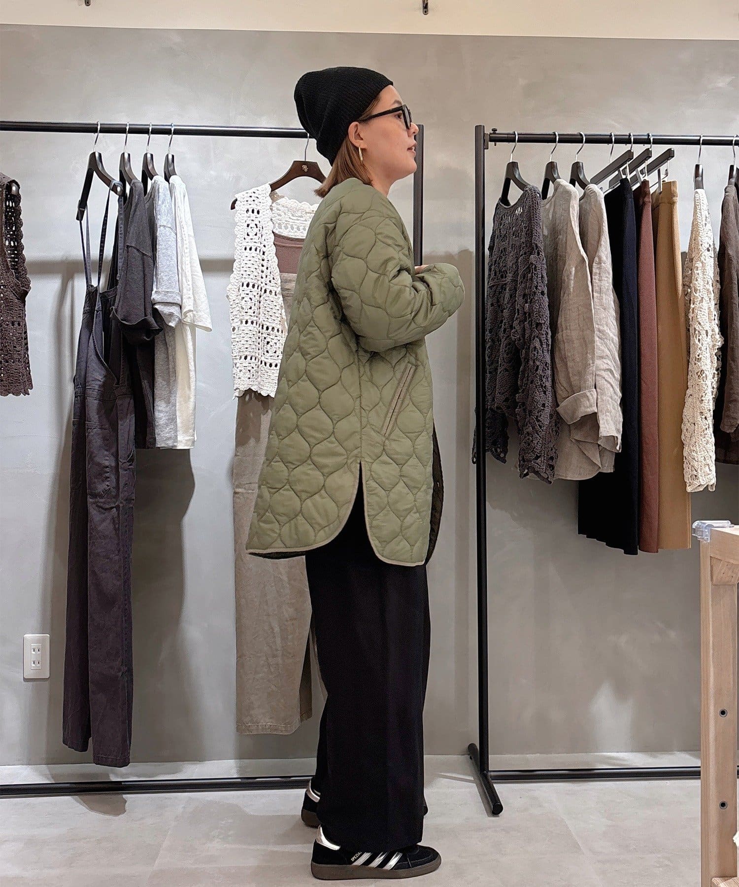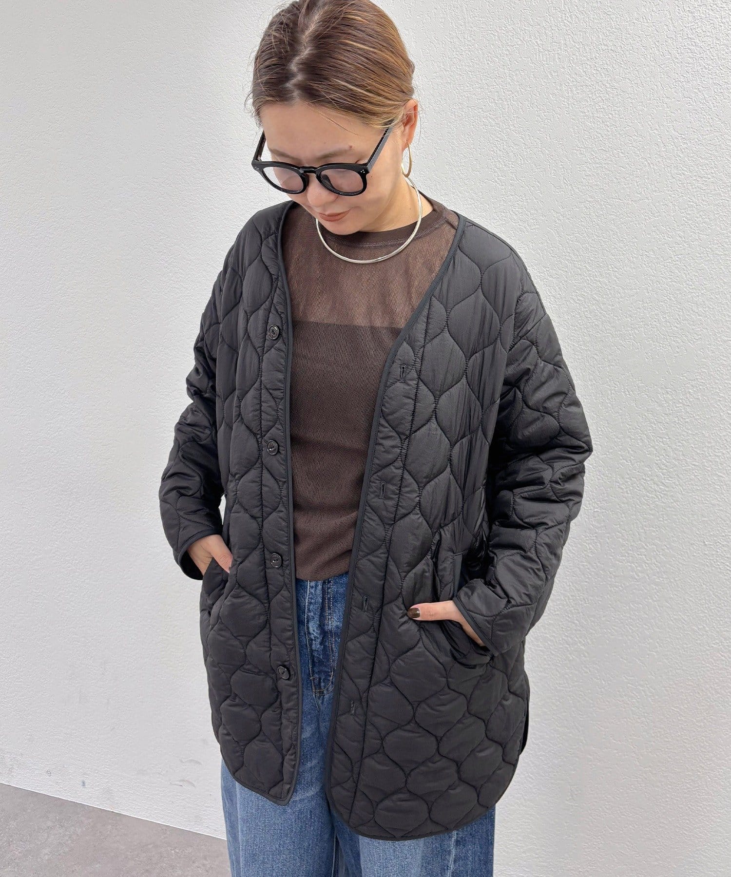 キルティングコートは柔らかな波型の模様で、1枚で着れば優しい大人女性らしい雰囲気にマッチ。
