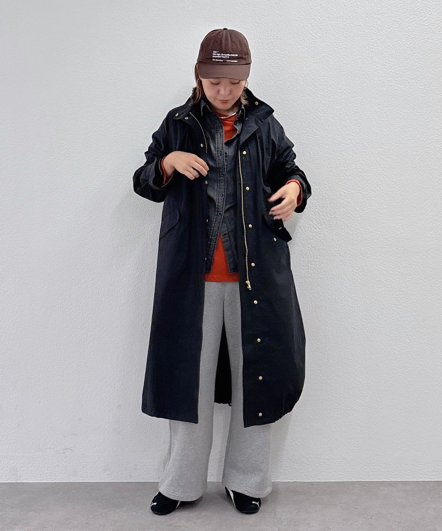 落ち着いたカラーのコートなので、キャップやマフラーなどの小物の色も映え