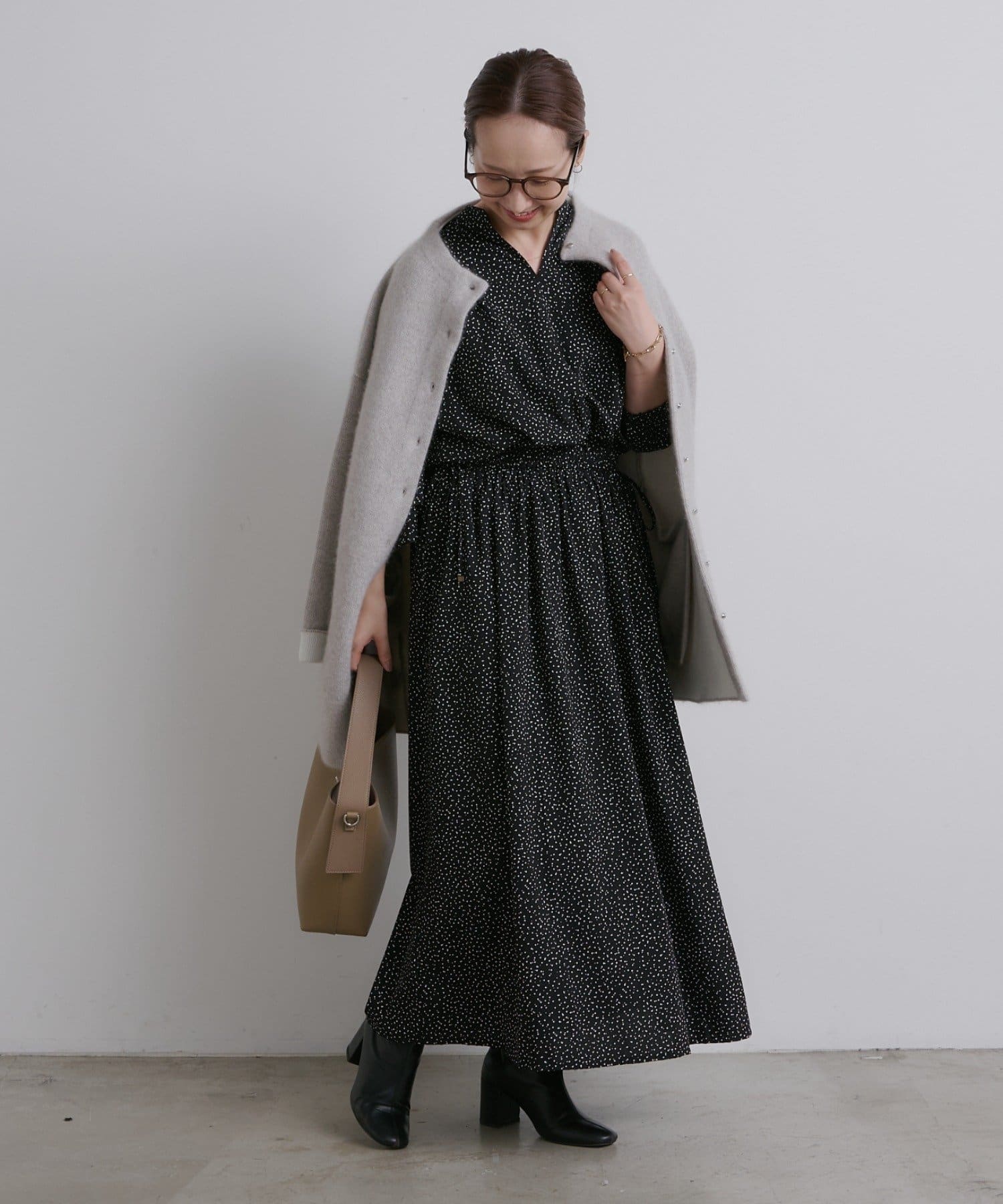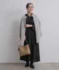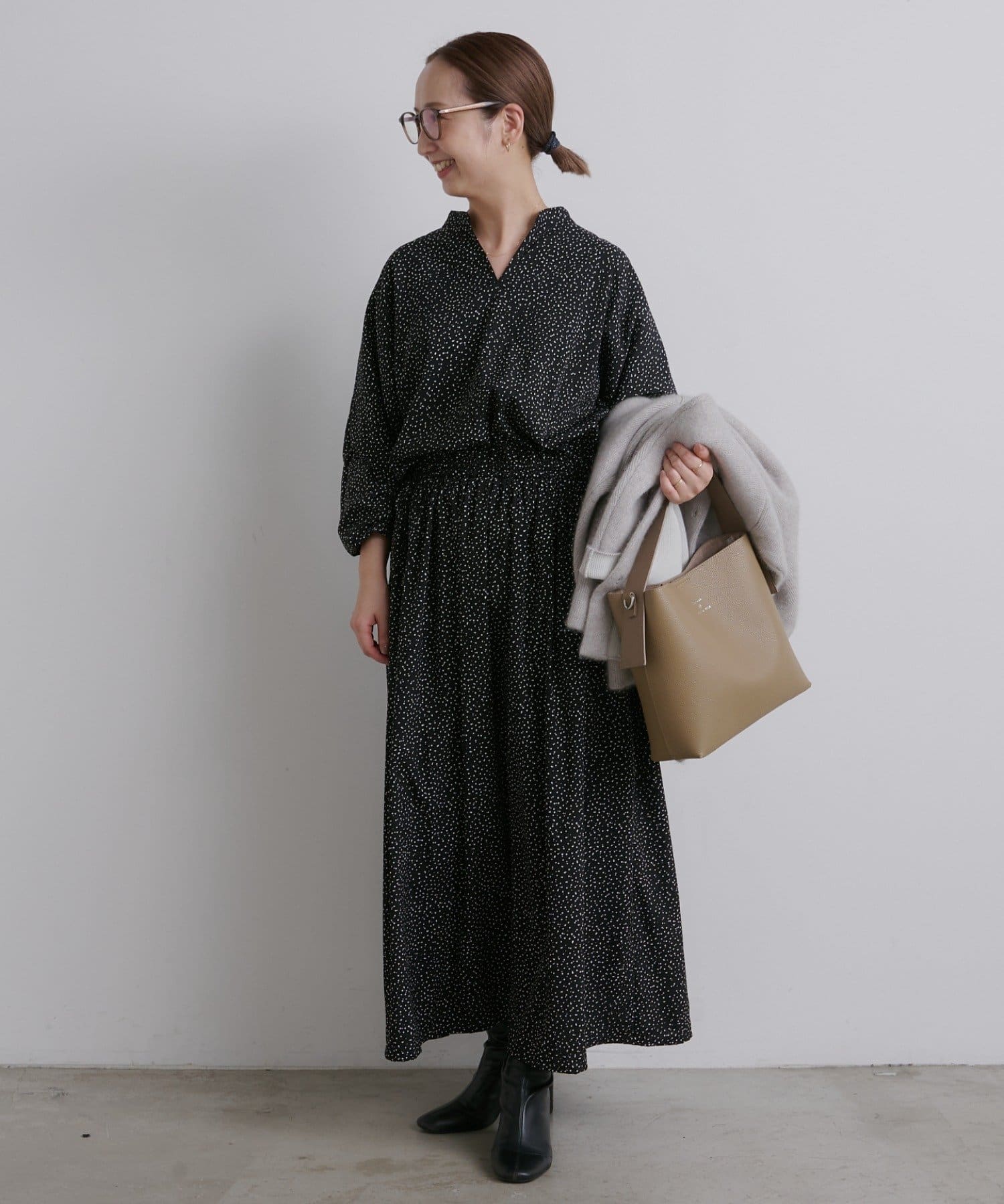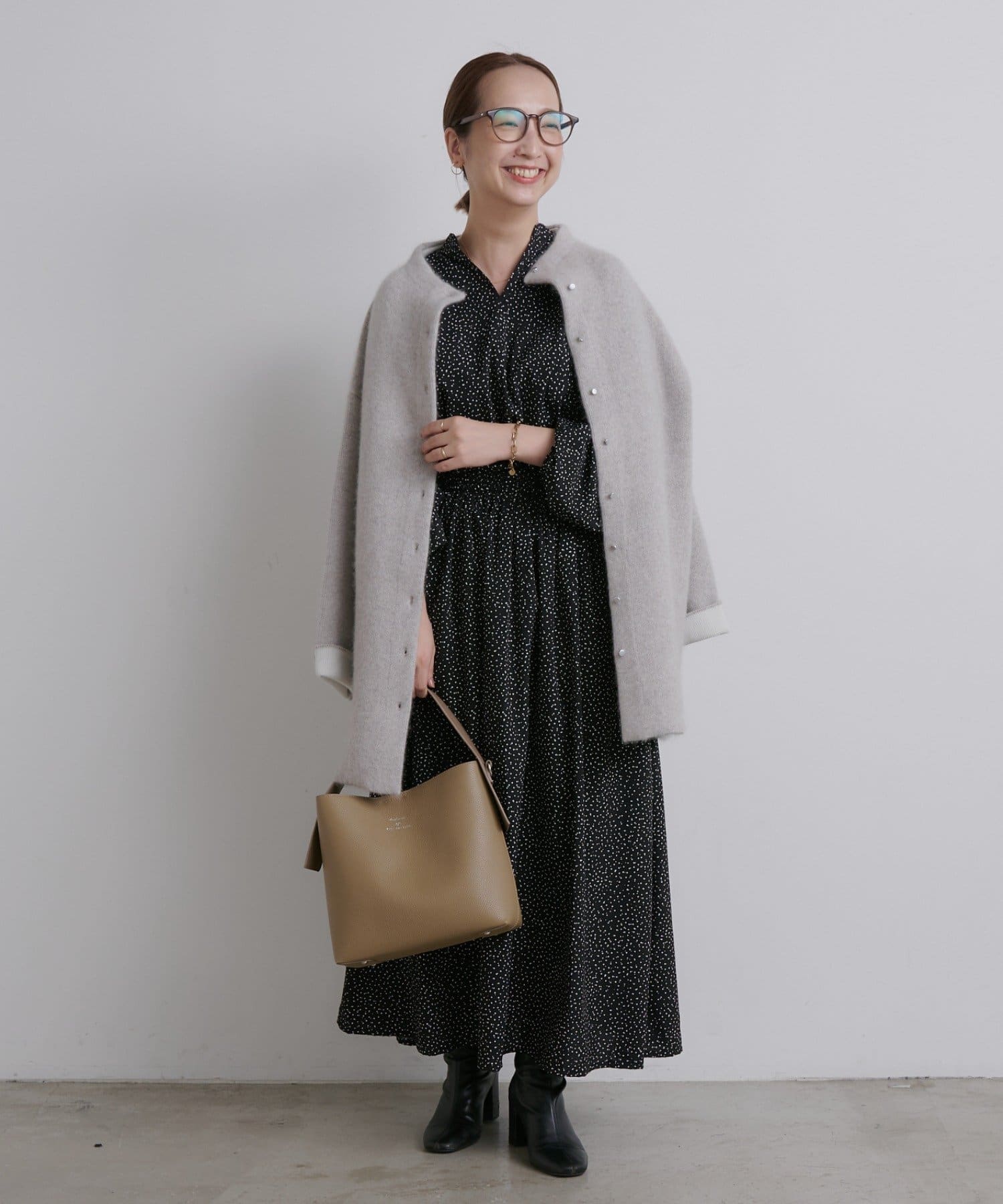 1枚で着映えするワンピースなので、秋の始まりは小物使いで楽しむスタイリングがおすすめ。