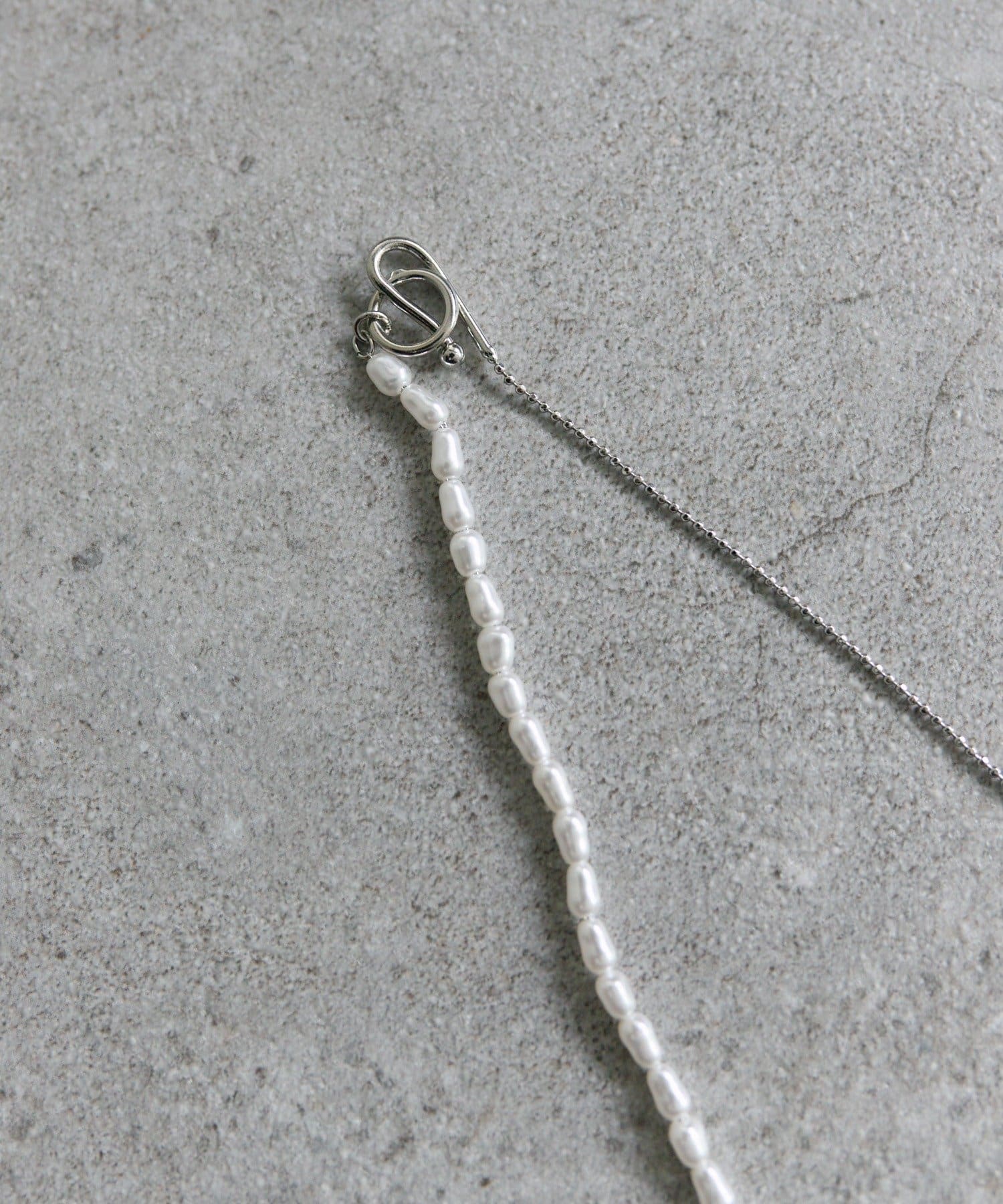 パールとチェーンのアシンメトリーなデザインがお洒落な印象に!