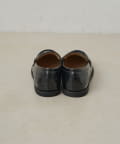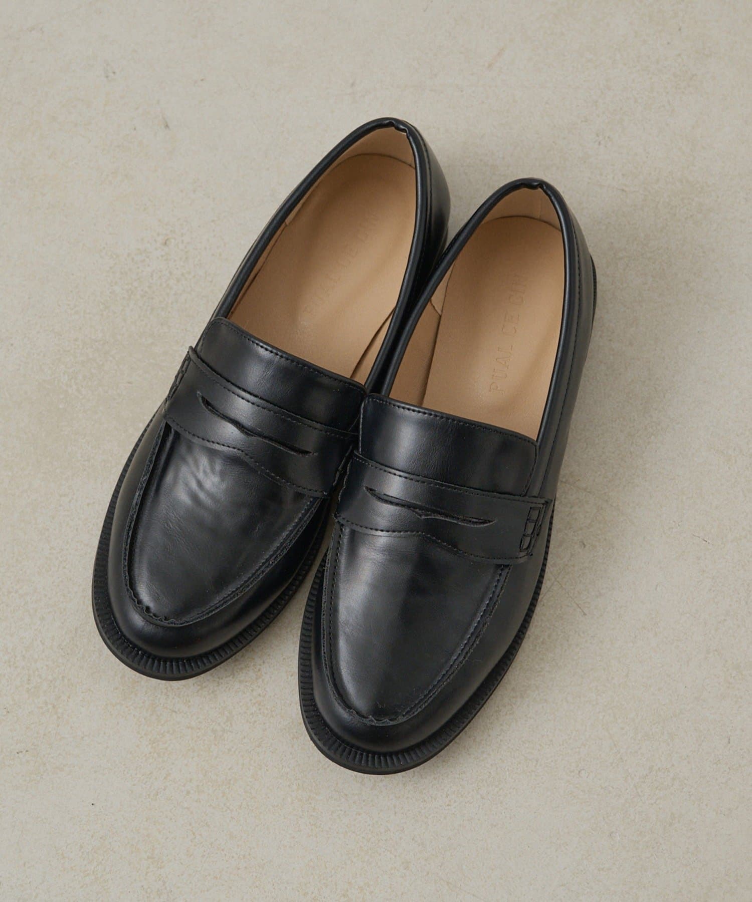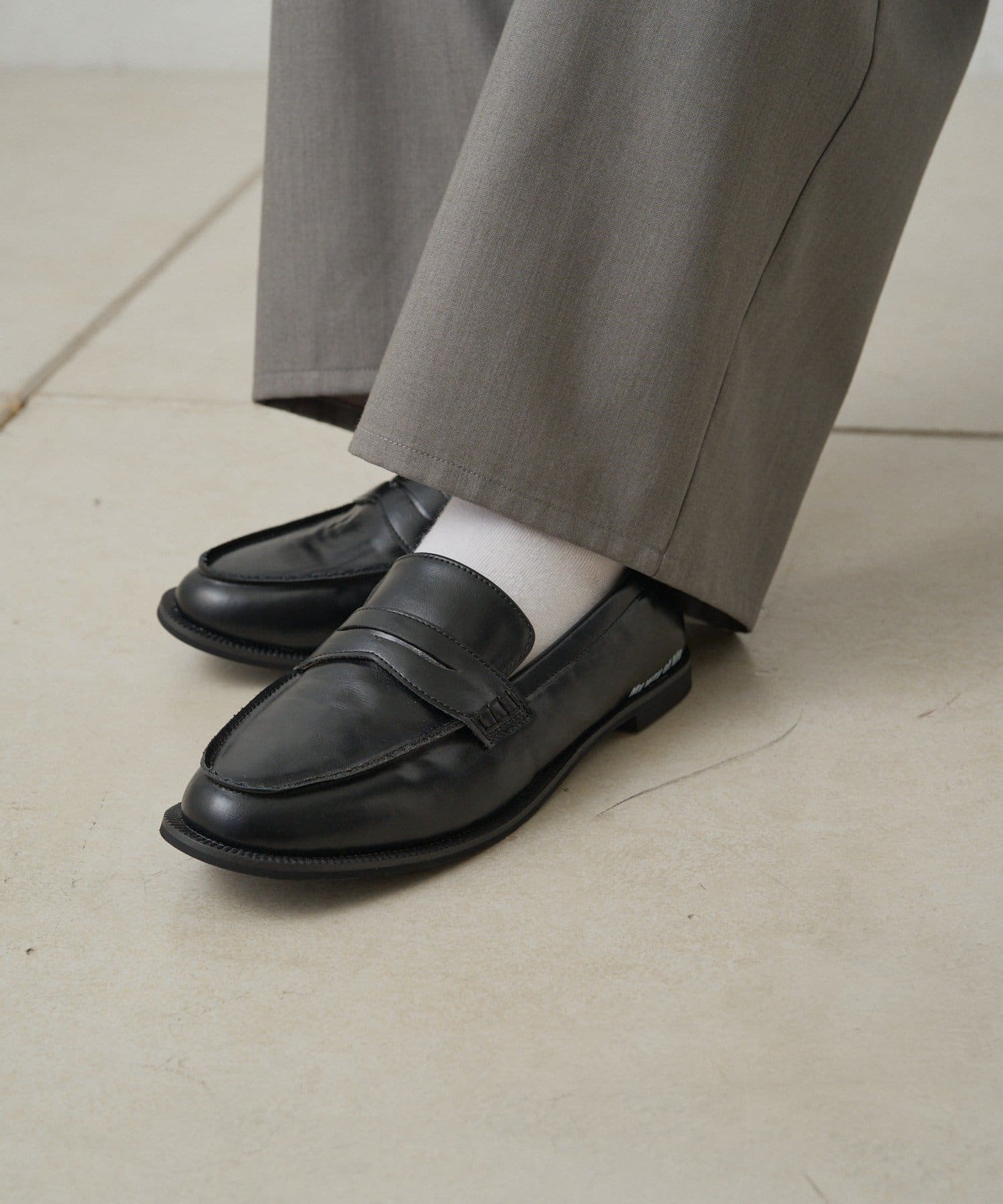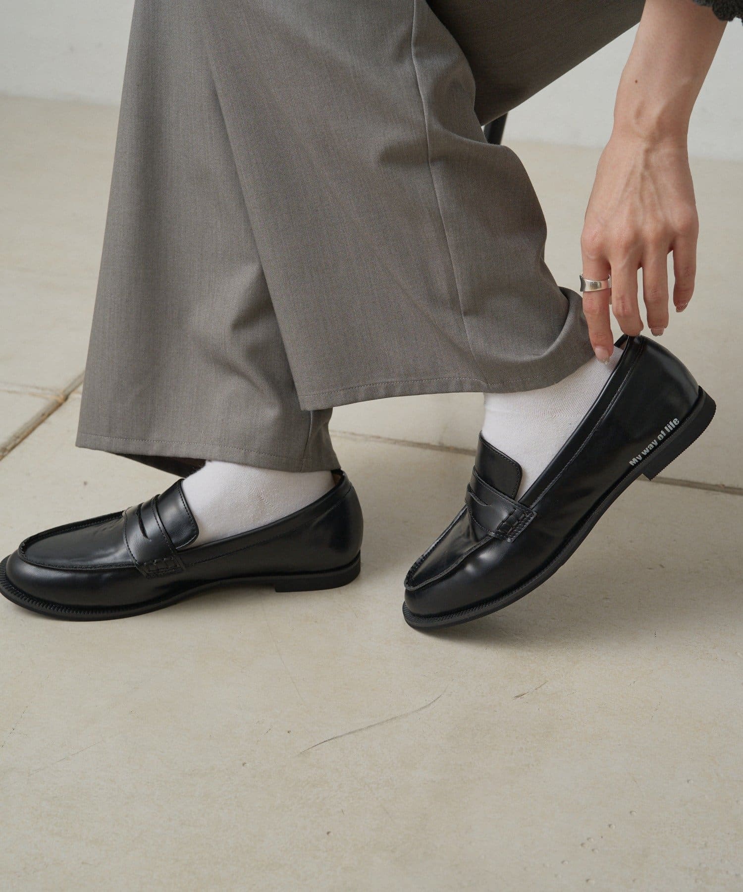 踵のサイドに入ったロゴプリントがアクセントになったコインローファー。