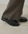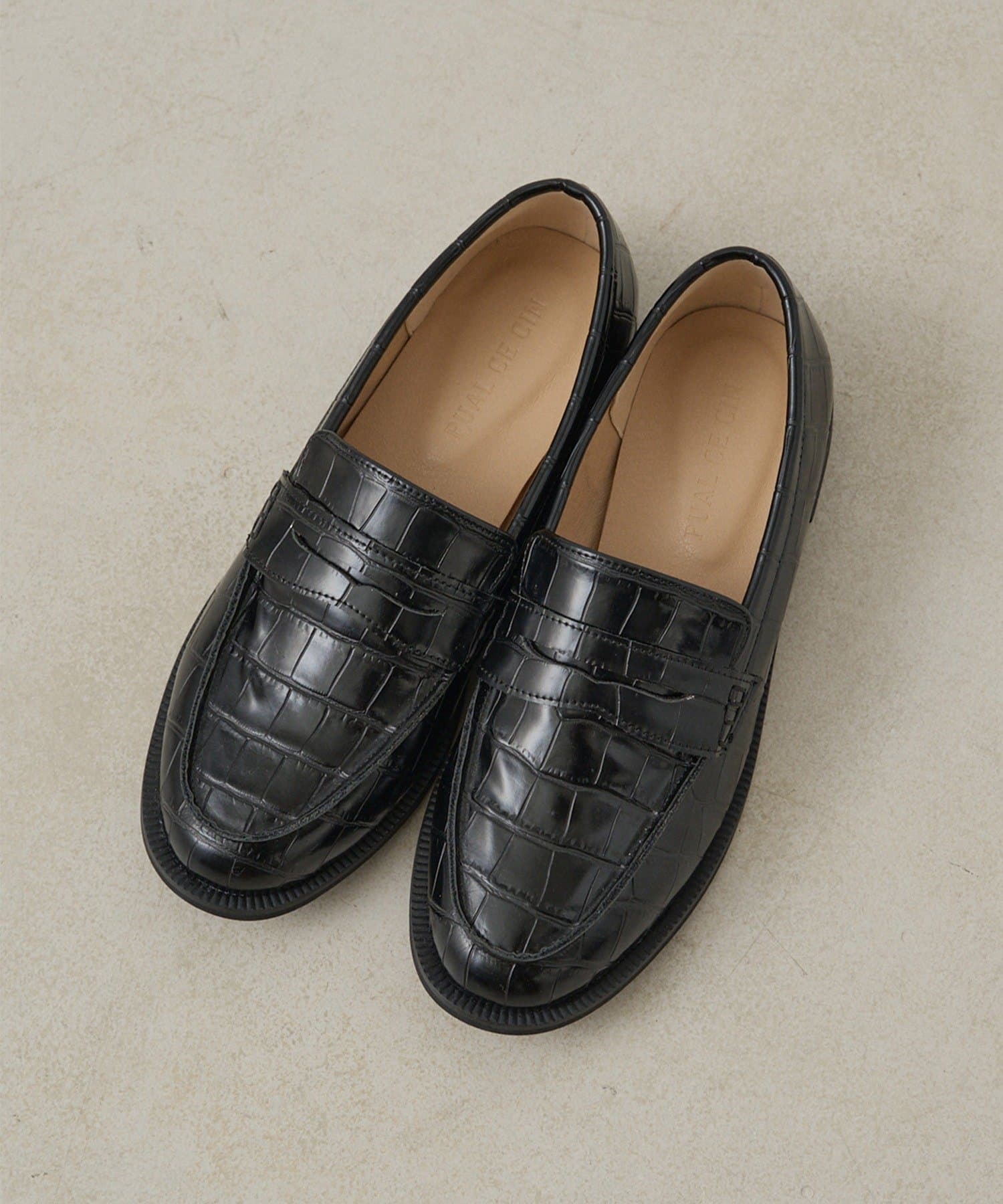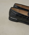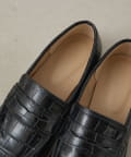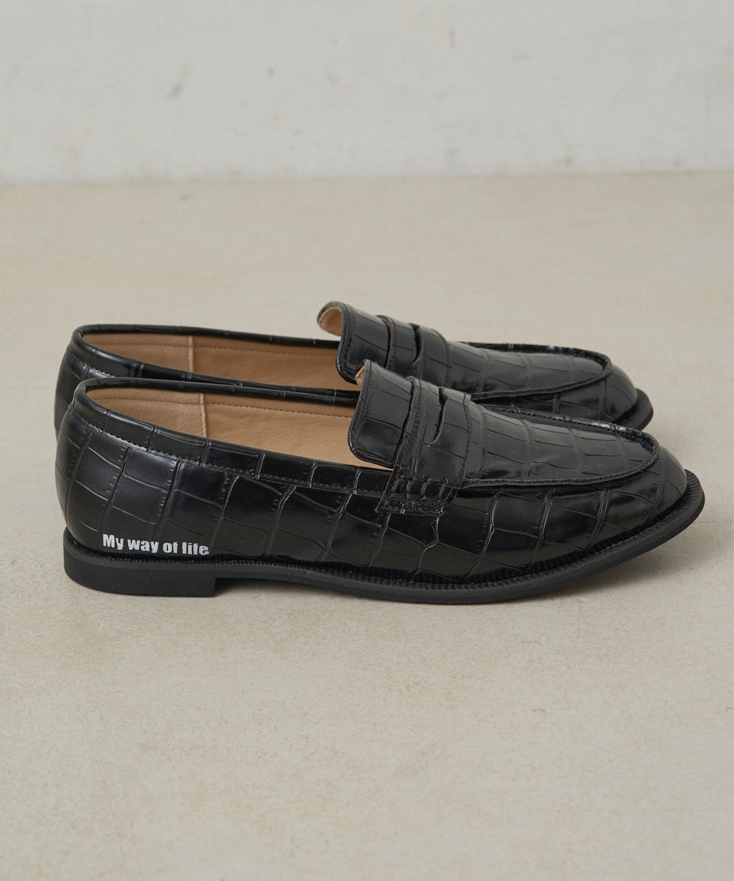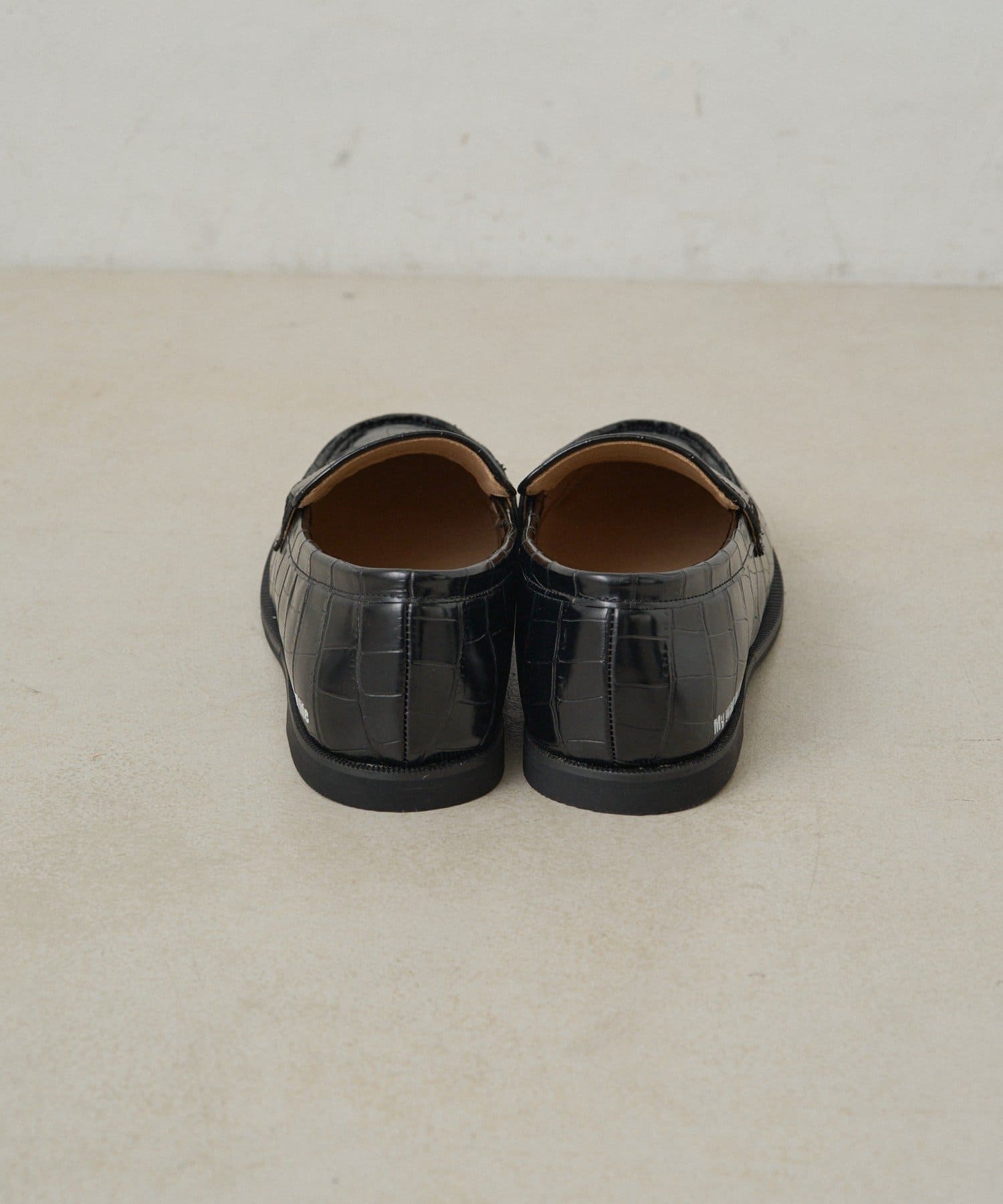 踵のサイドに入ったロゴプリントがアクセントになったコインローファー。