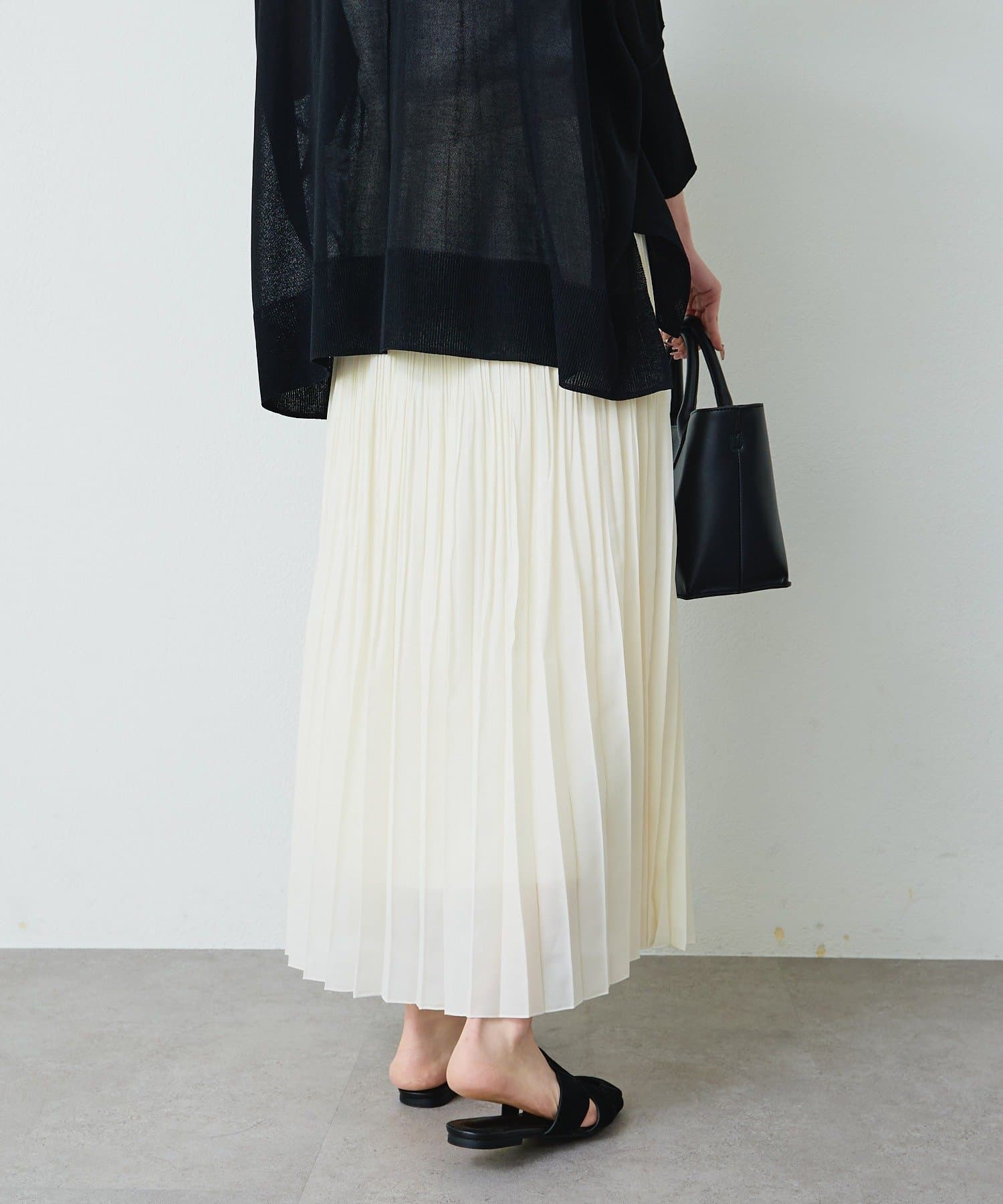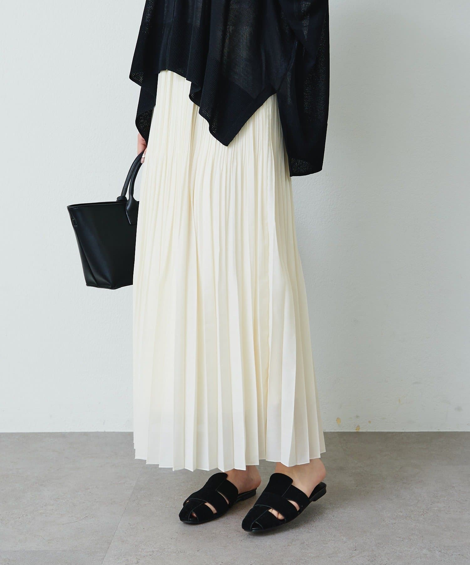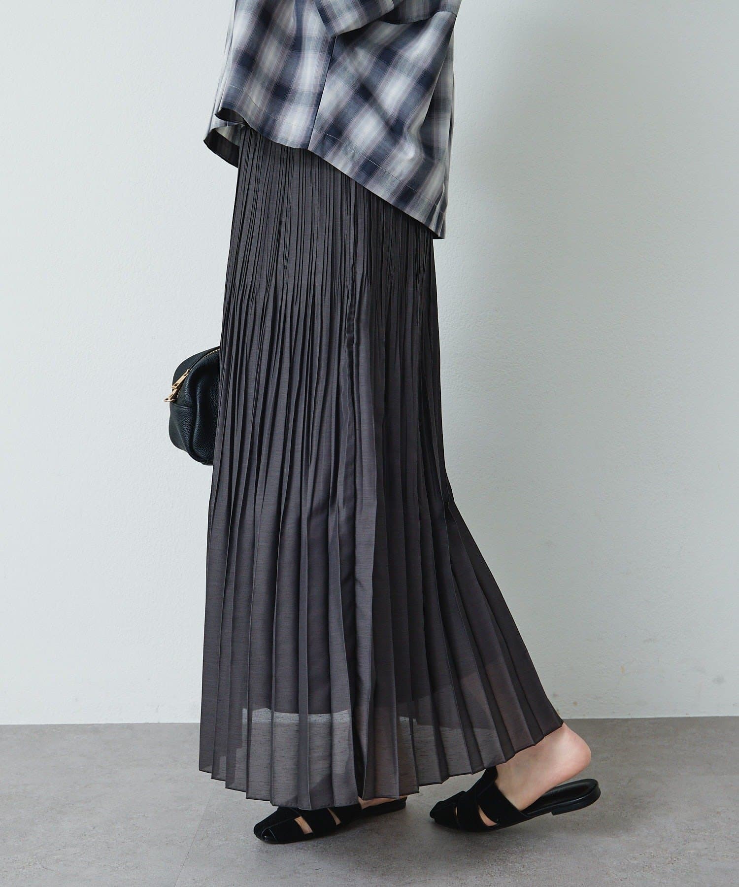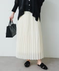 軽やかに揺れる細プリーツデザインと繊細な透け感が魅力的なロングスカート。