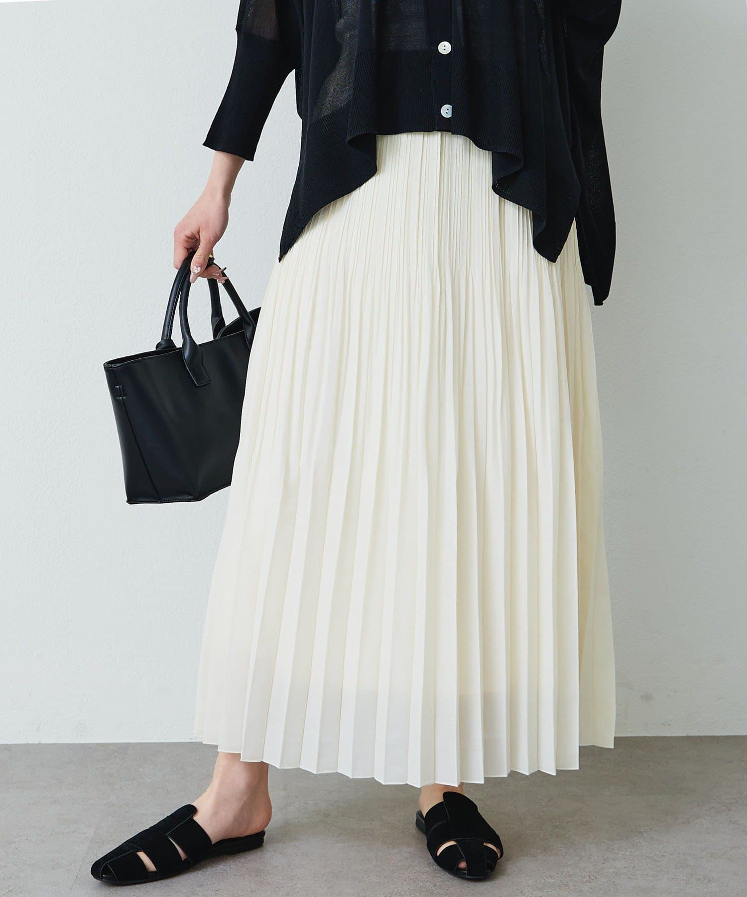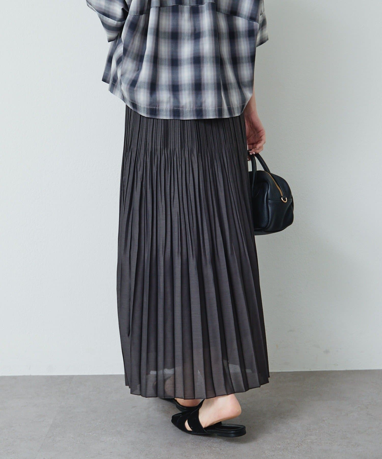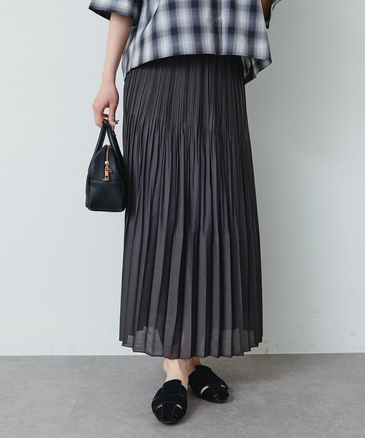 軽やかに揺れる細プリーツデザインと繊細な透け感が魅力的なロングスカート。