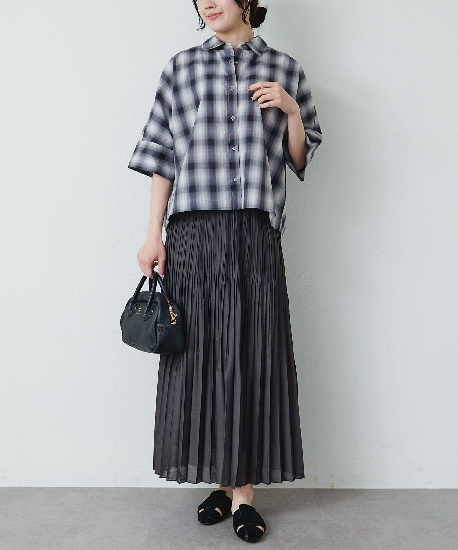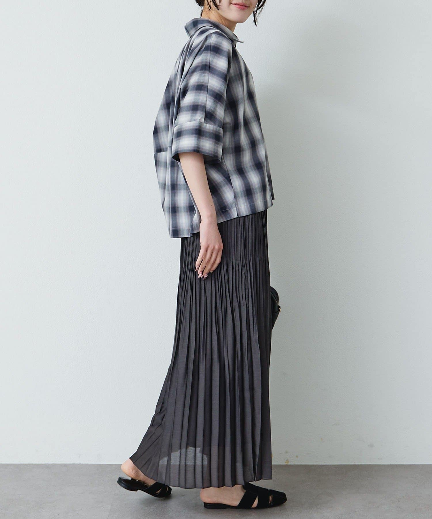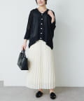 プリーツスカートを合わせればフェミニンさが加わり大人女性らしい着こなしが叶います。