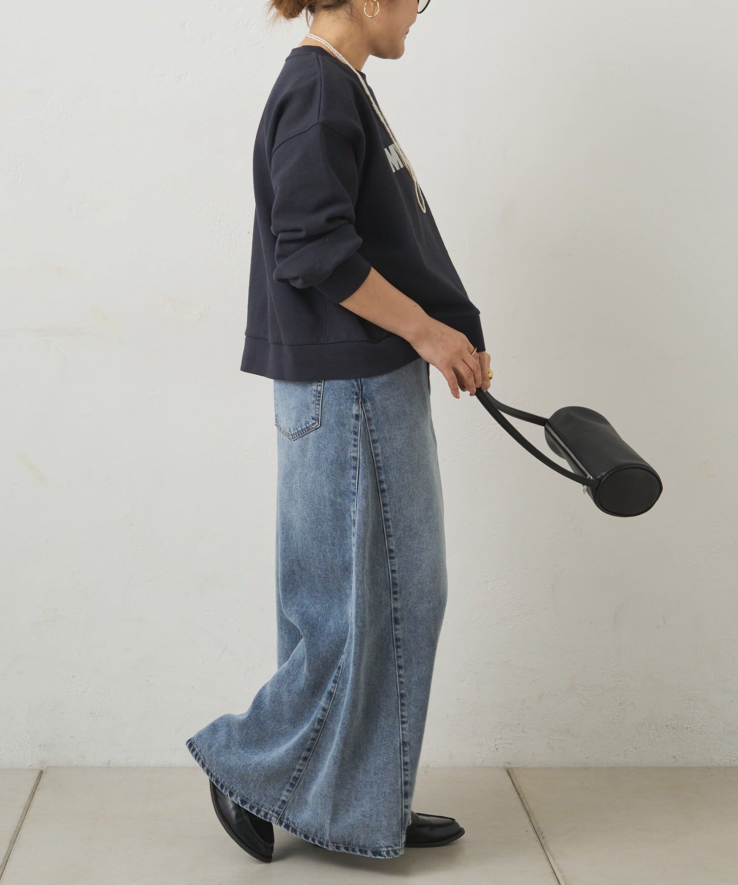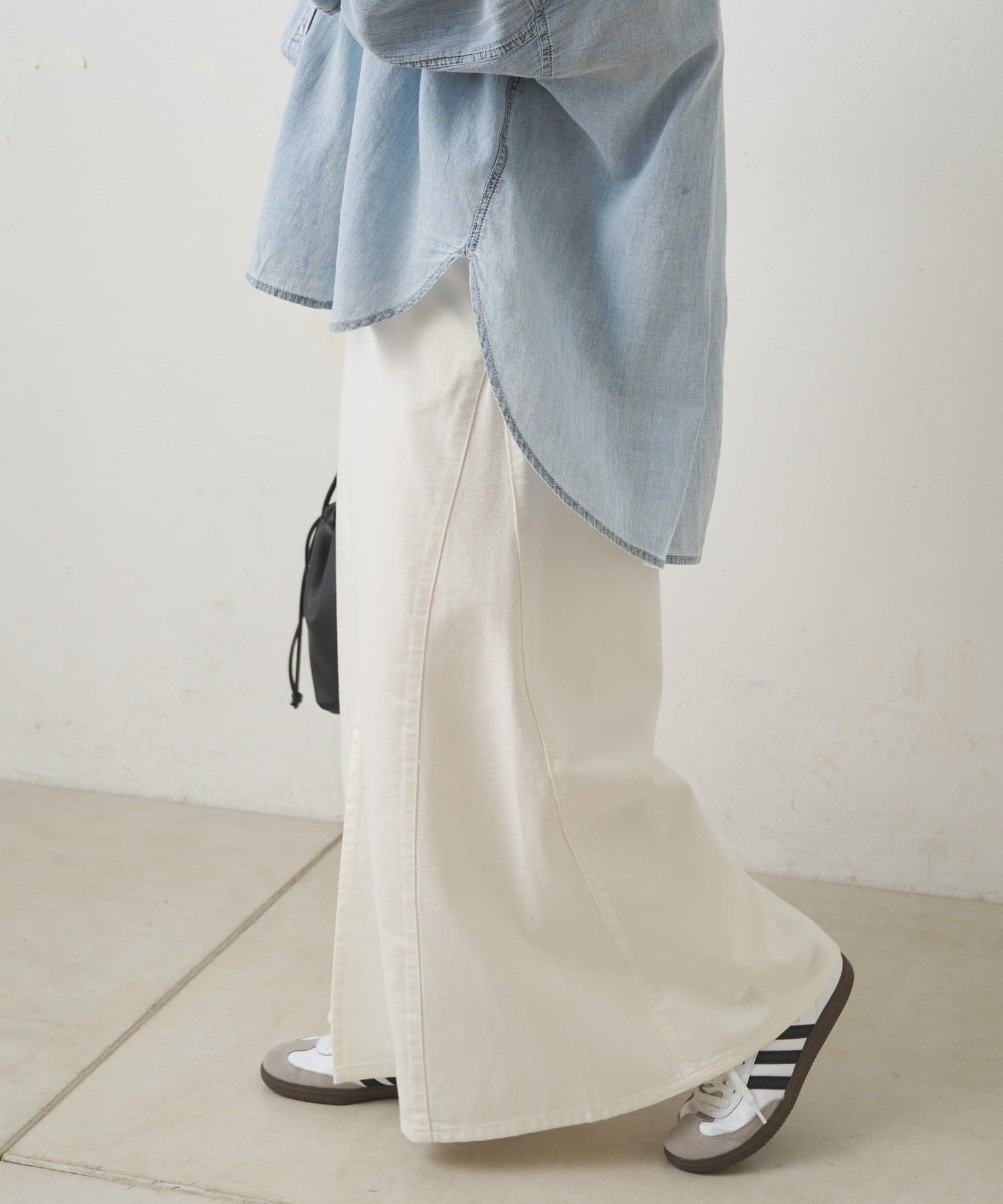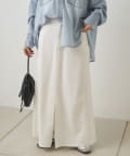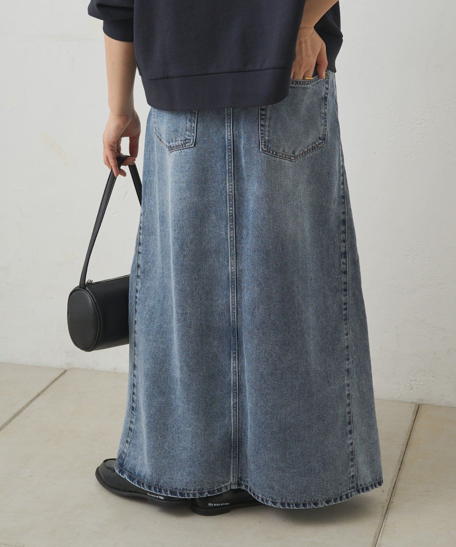 すっきりした台形シルエットと柔らかい履き心地が魅力のデニムロングスカート。