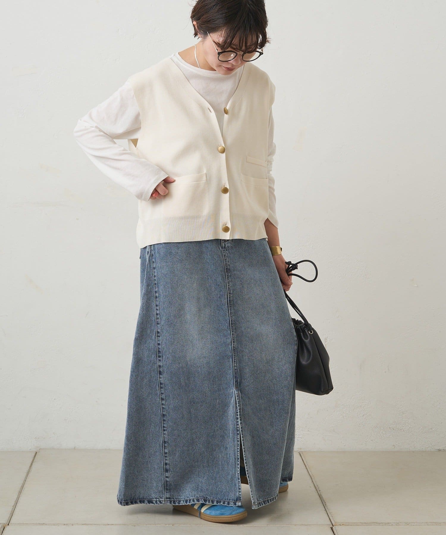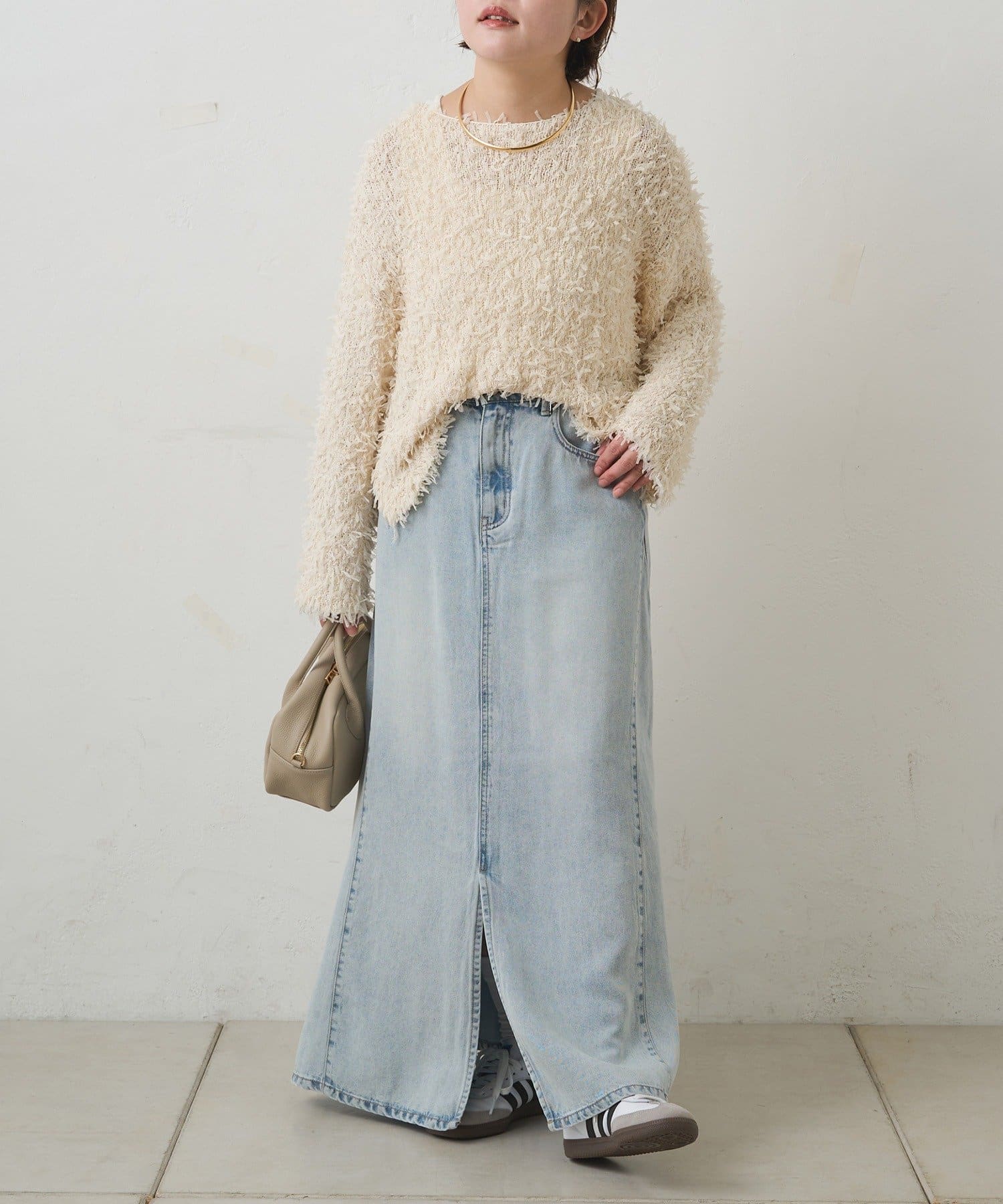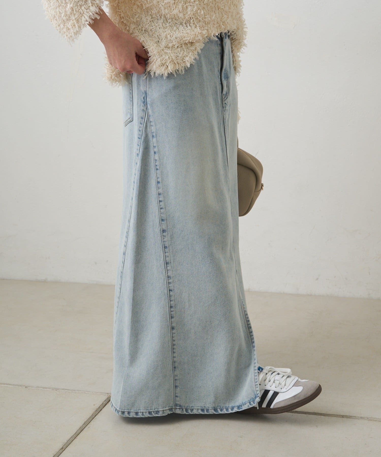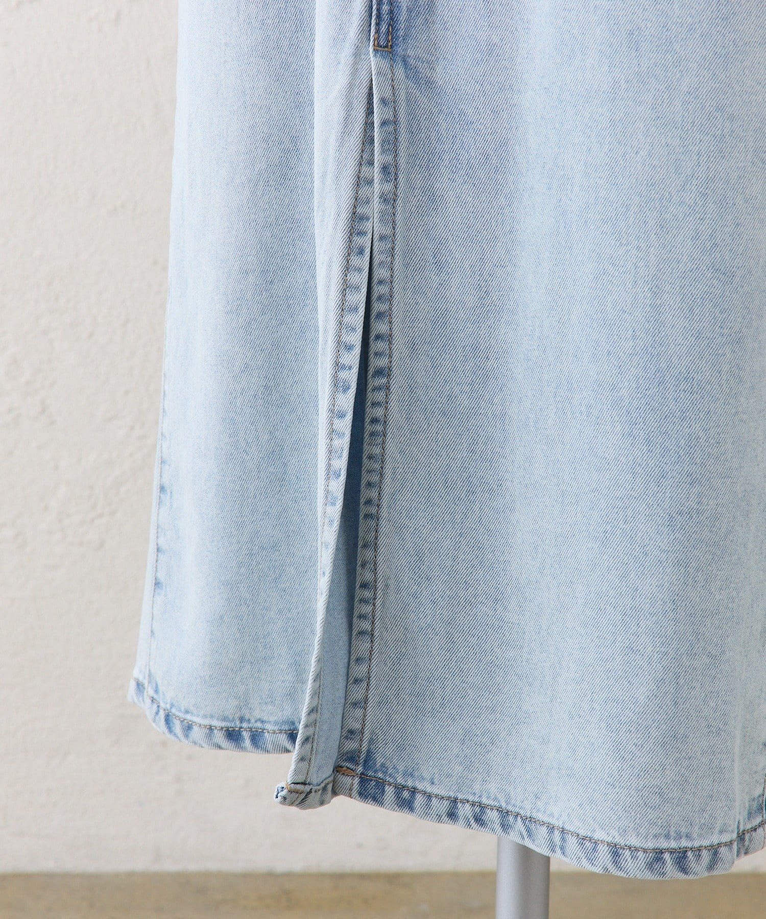 すっきりした台形シルエットと柔らかい履き心地が魅力のデニムロングスカート。