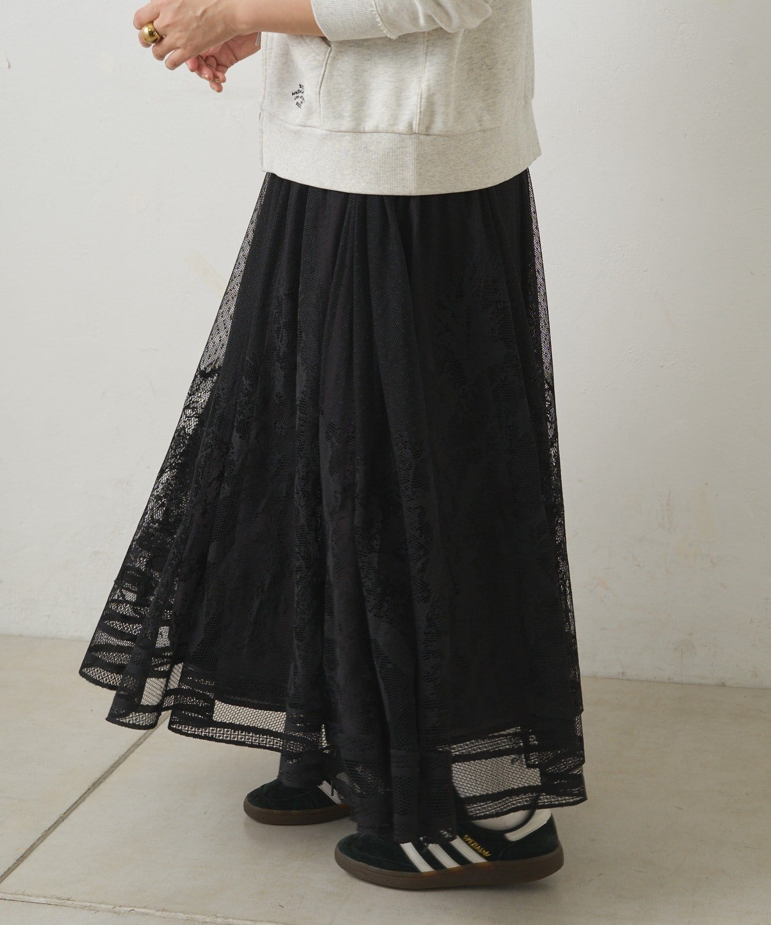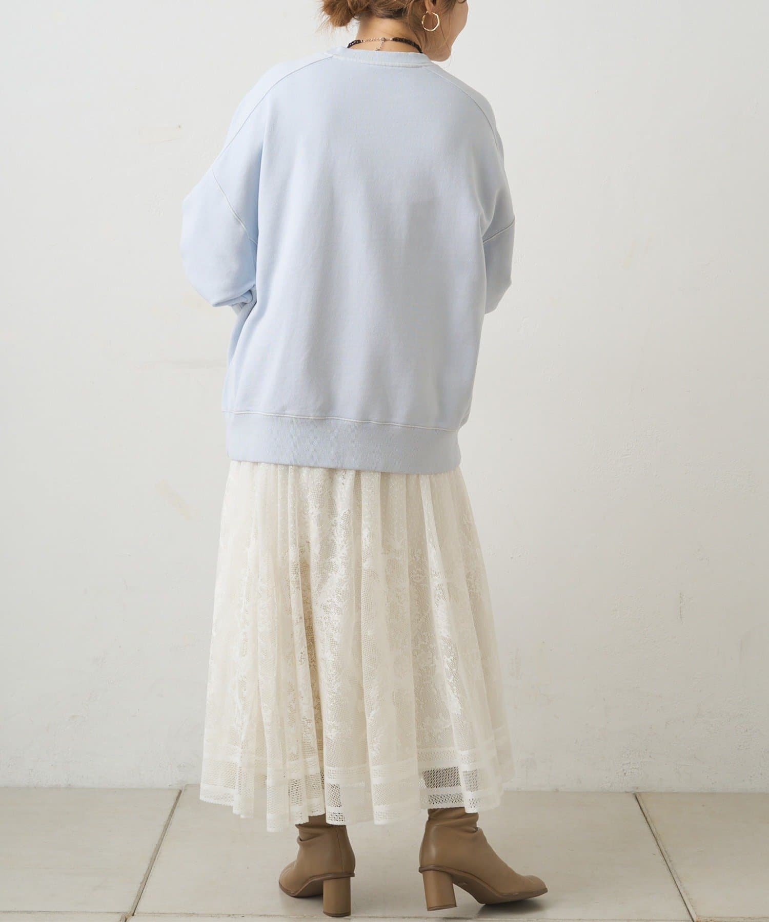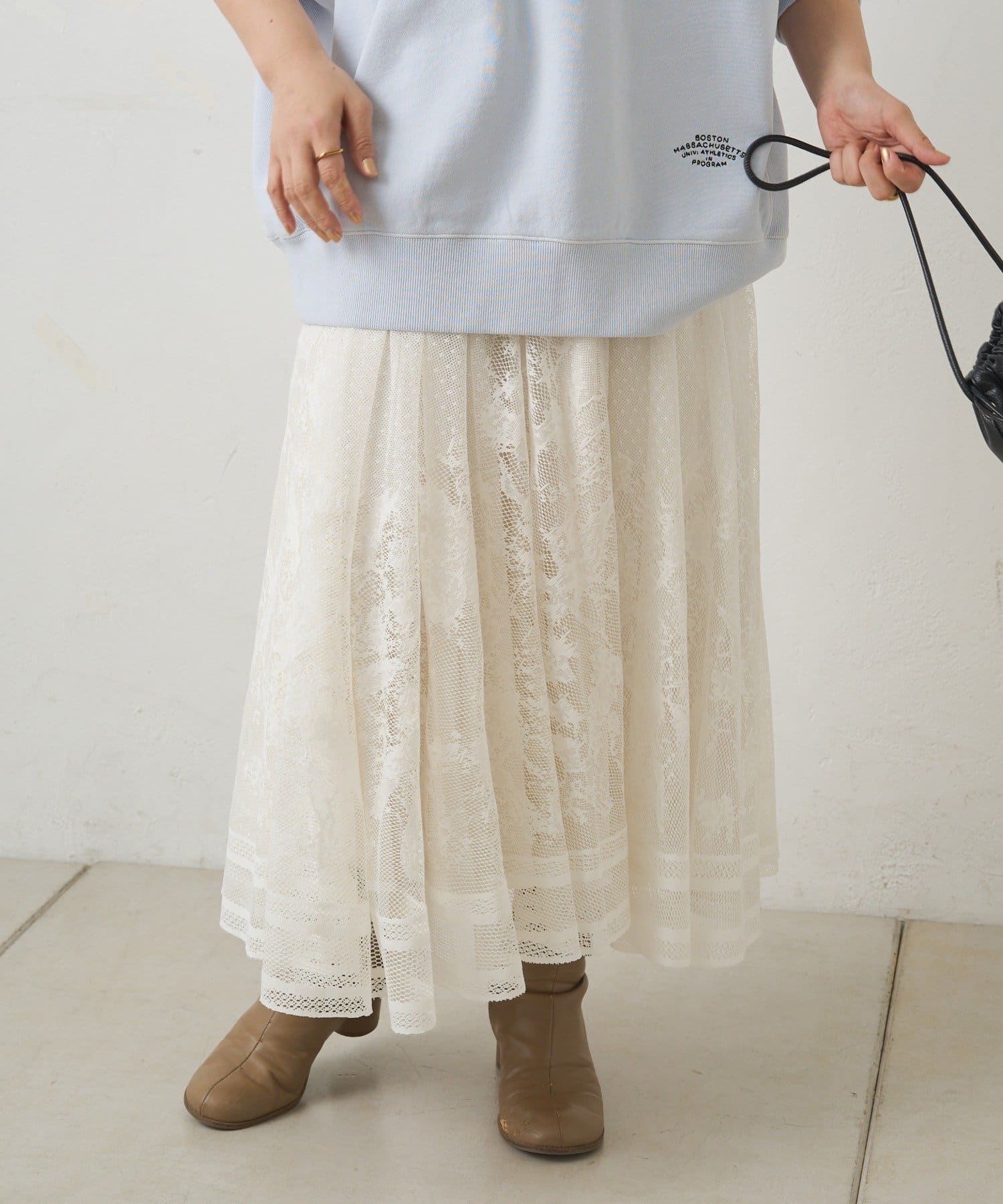 マニッシュにまとまりがちなロゴTやスウェットとのコーディネートもレースの甘さが加わり、