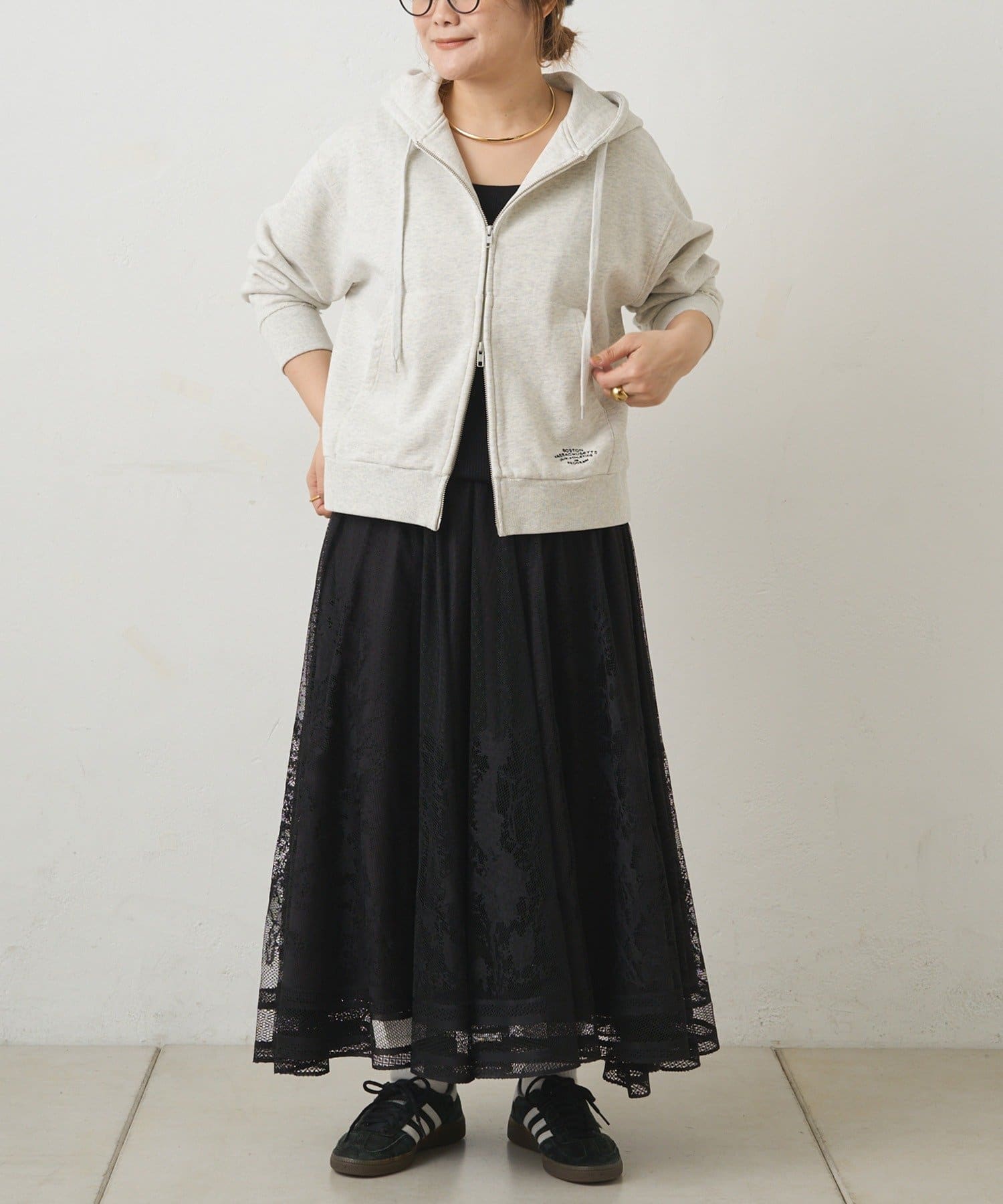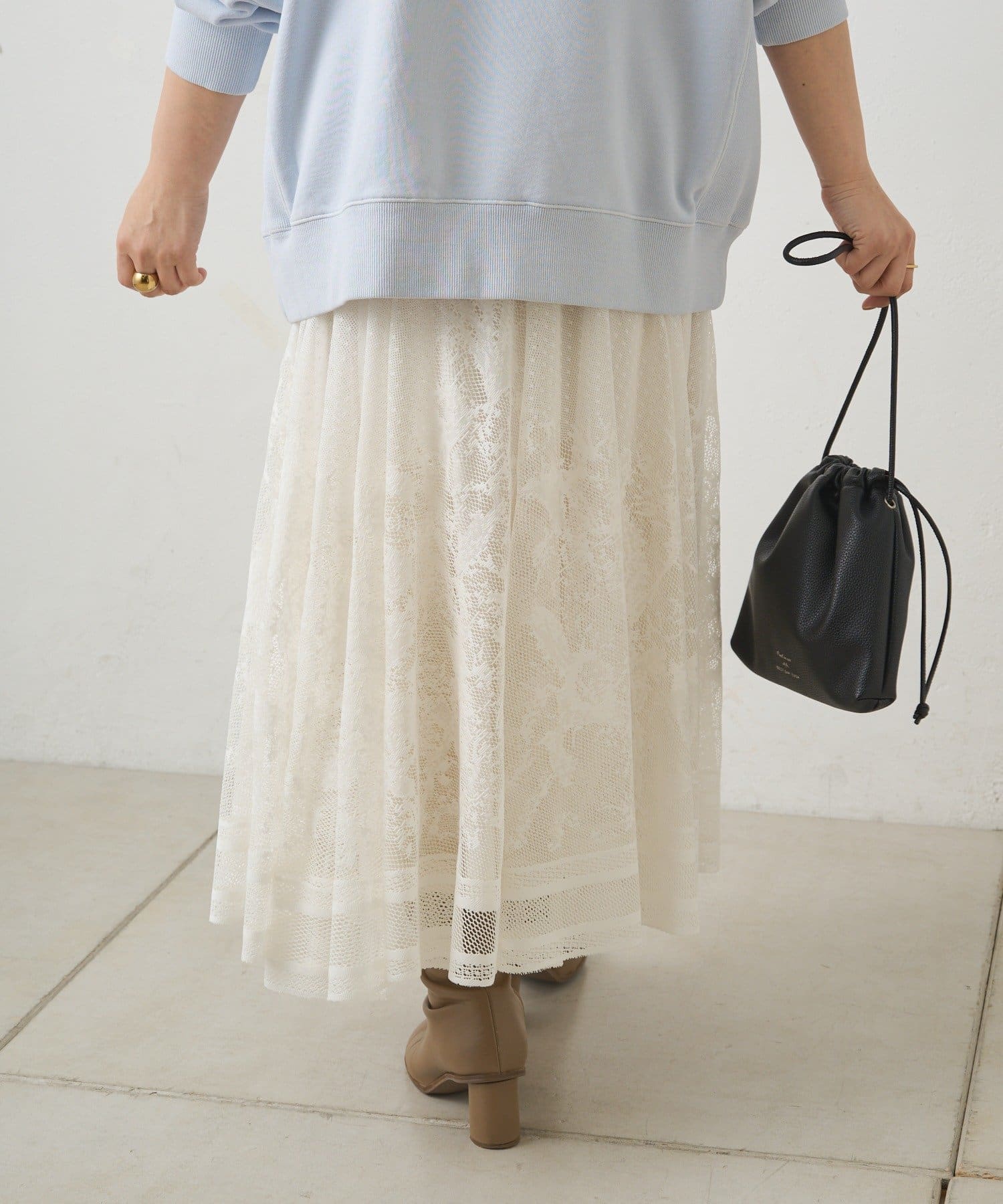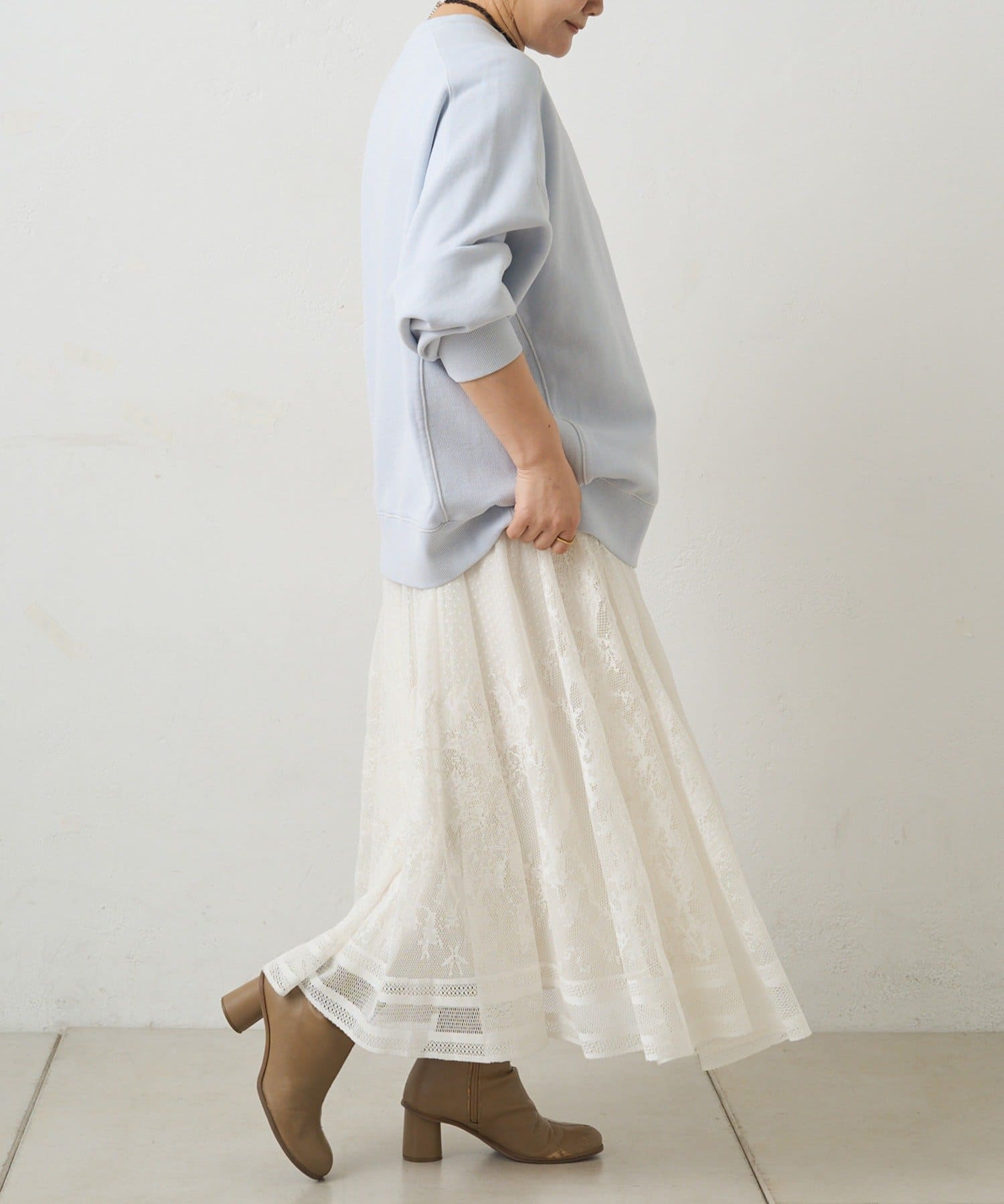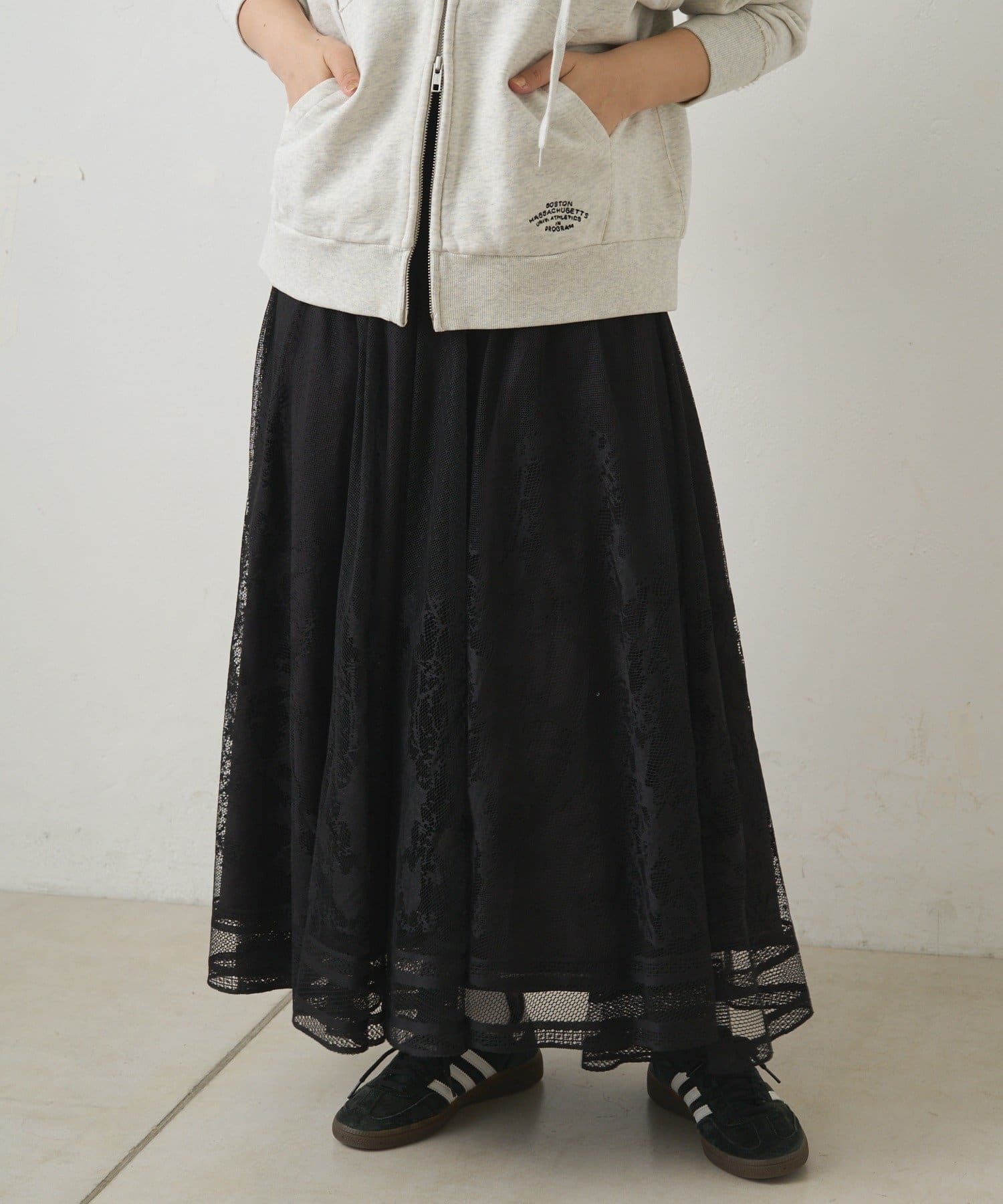 マニッシュにまとまりがちなロゴTやスウェットとのコーディネートもレースの甘さが加わり、