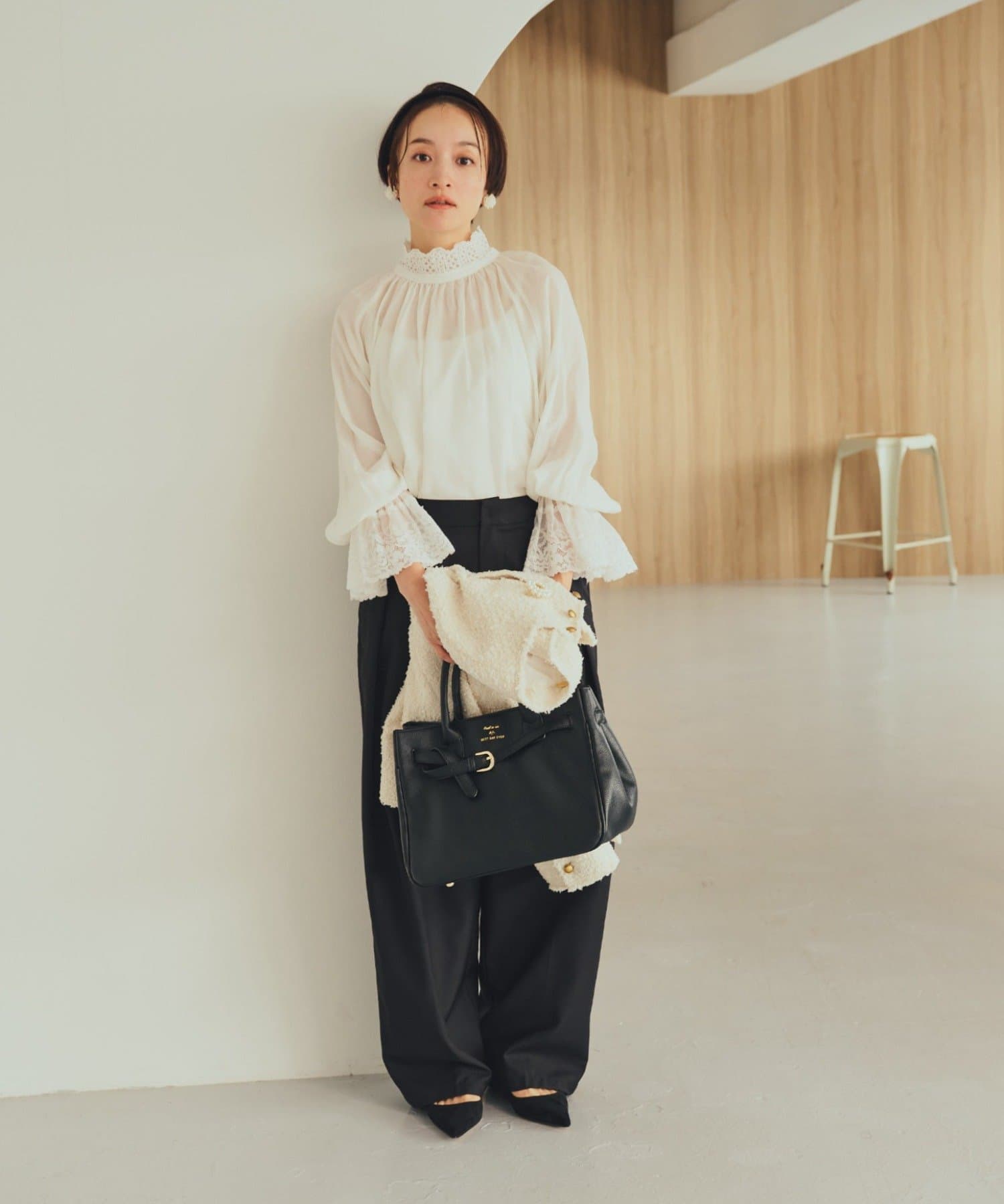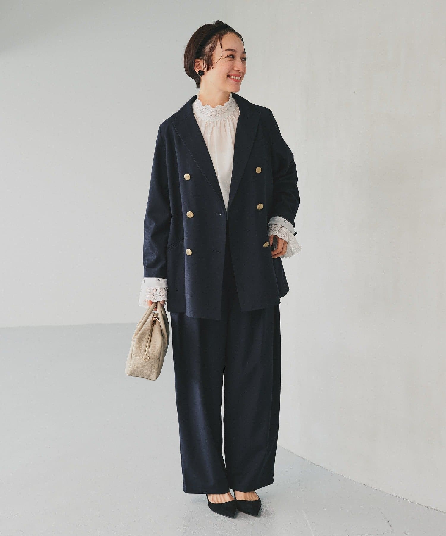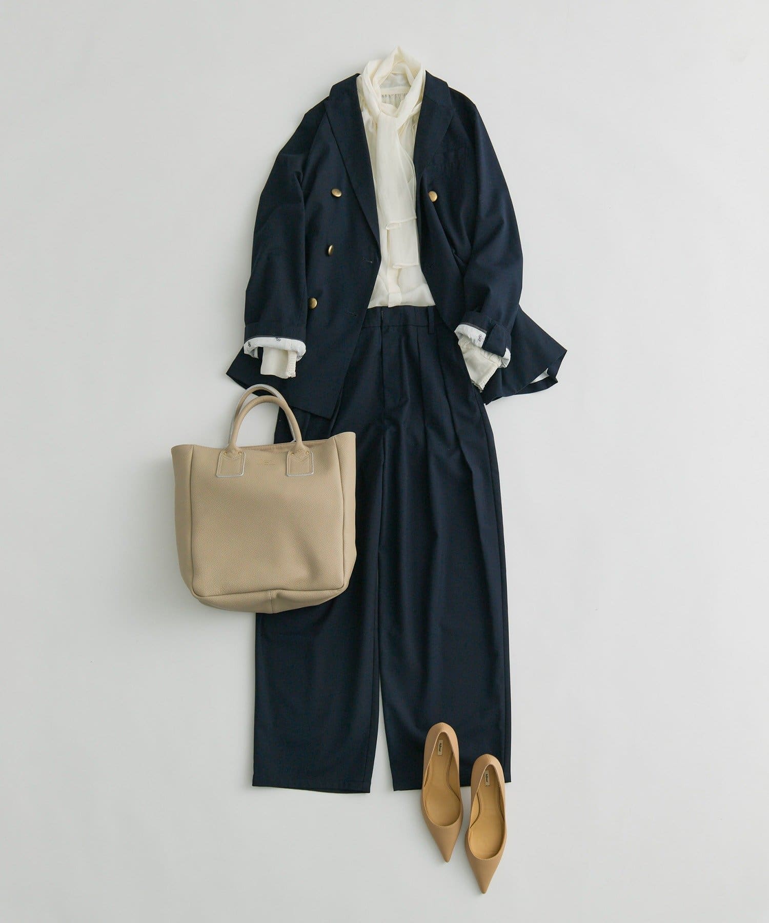 華やかなブラウスを合わせると、更にきちんと感を演出した着こなしが叶います。