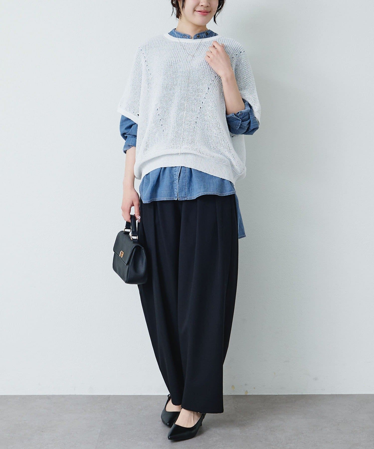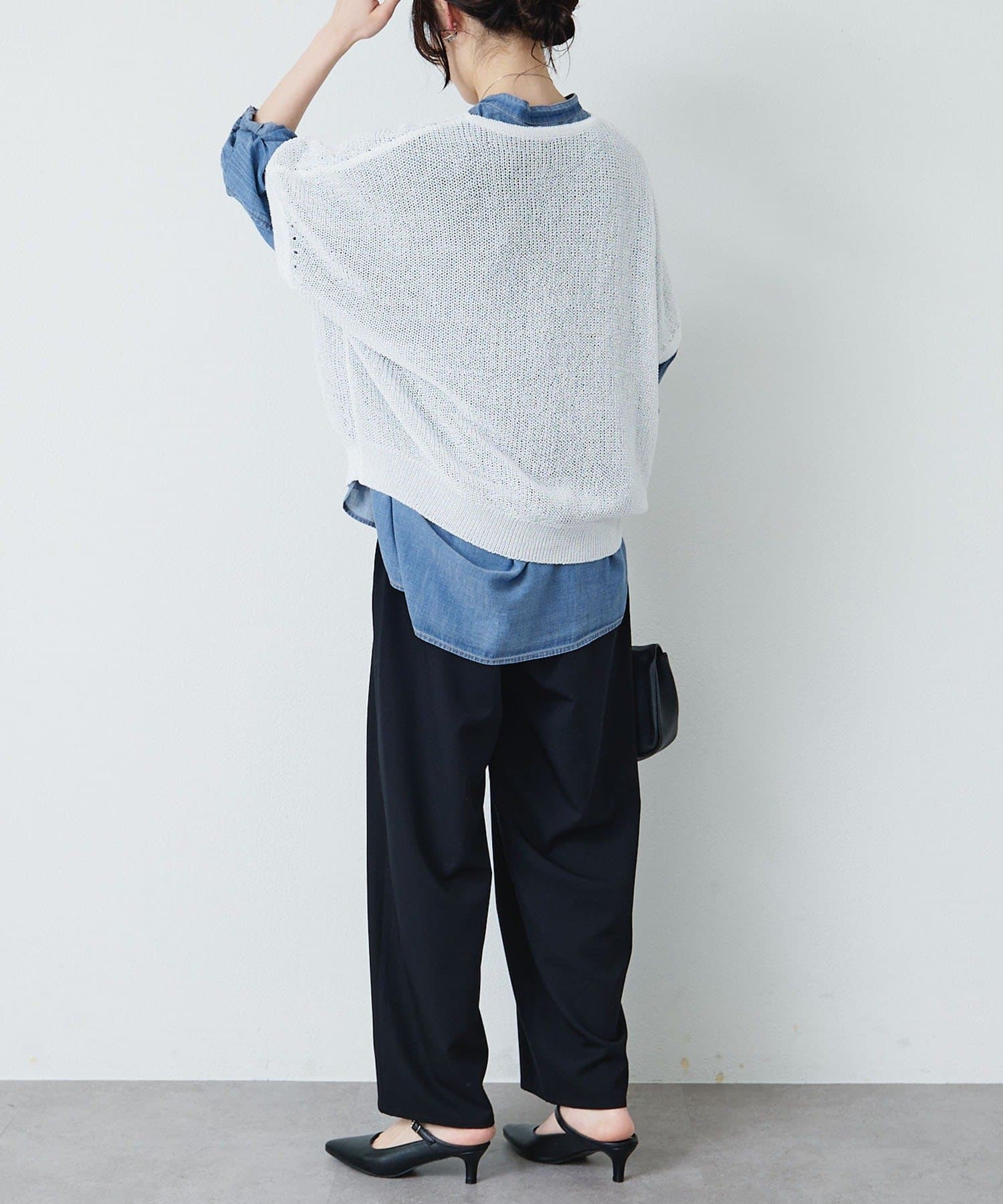 白やキナリのワイドパンツと合わせて、素材の透け感を引き立てるクリーンなスタイルに。