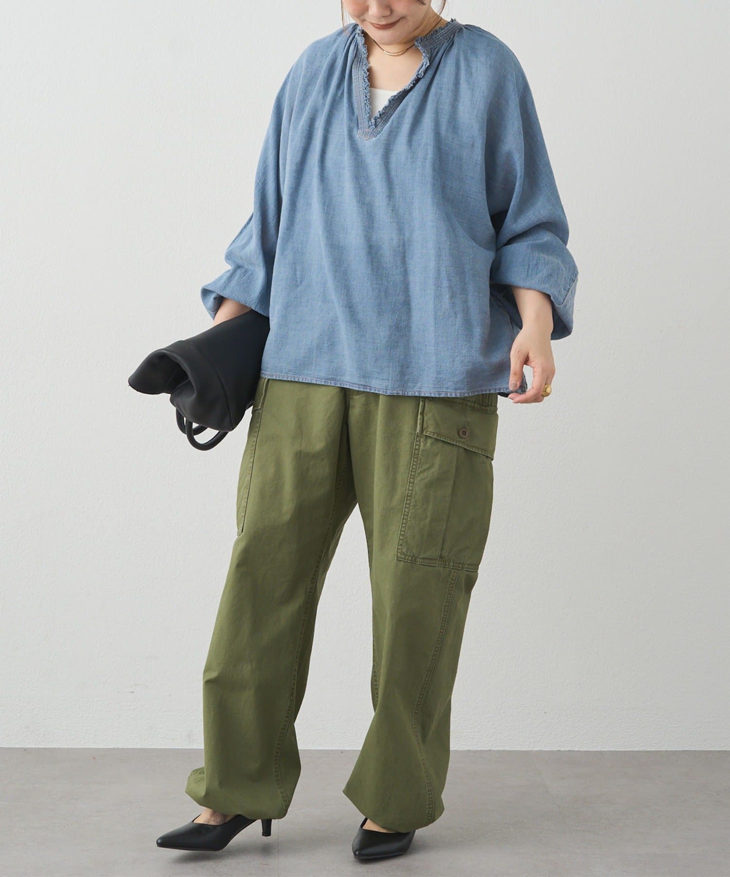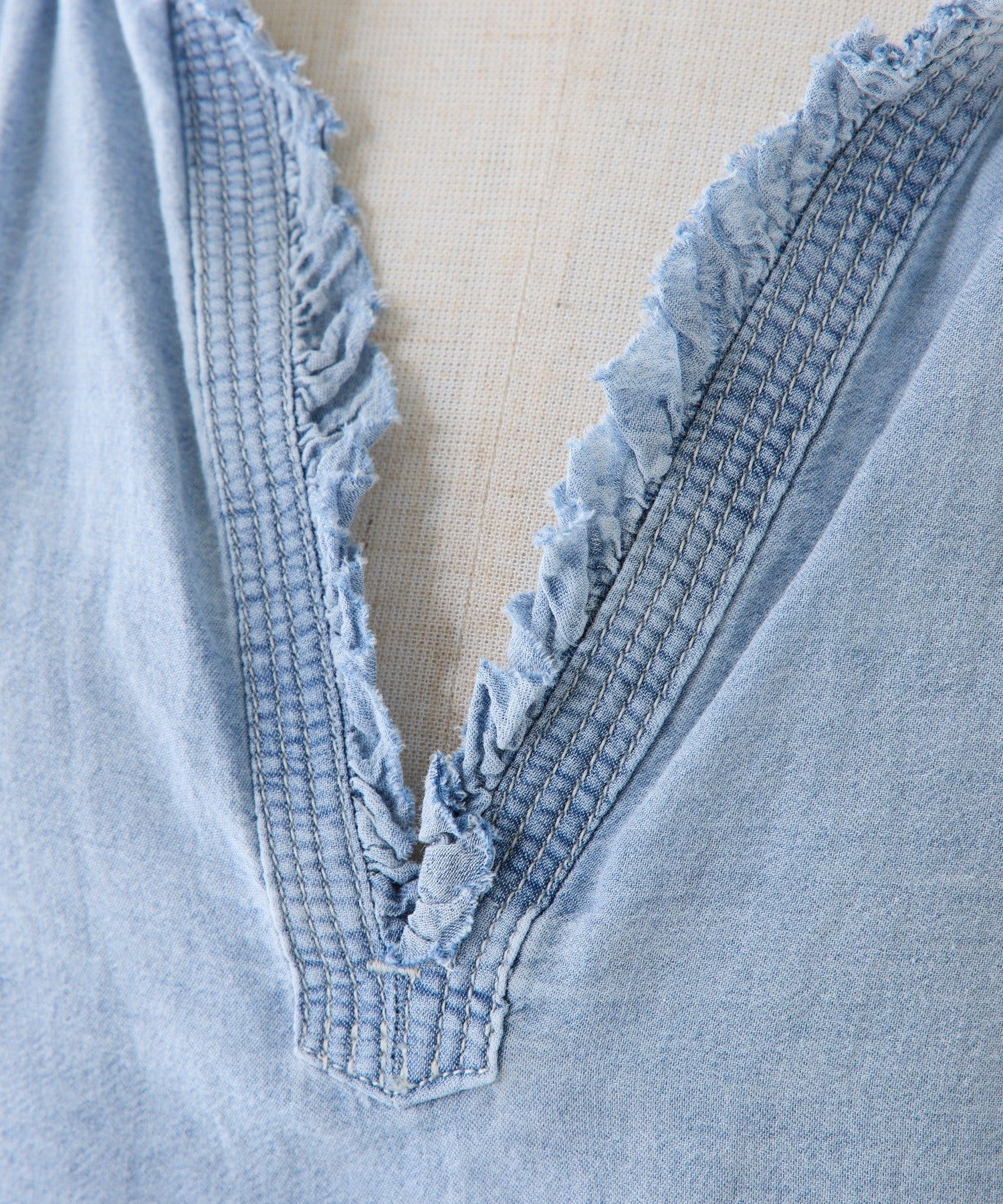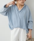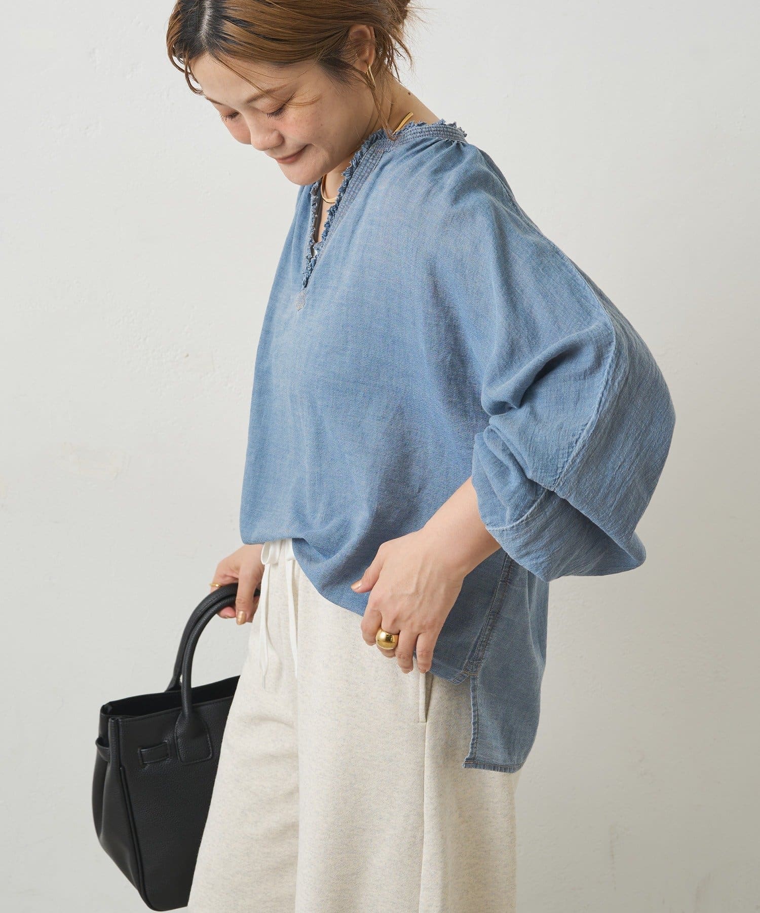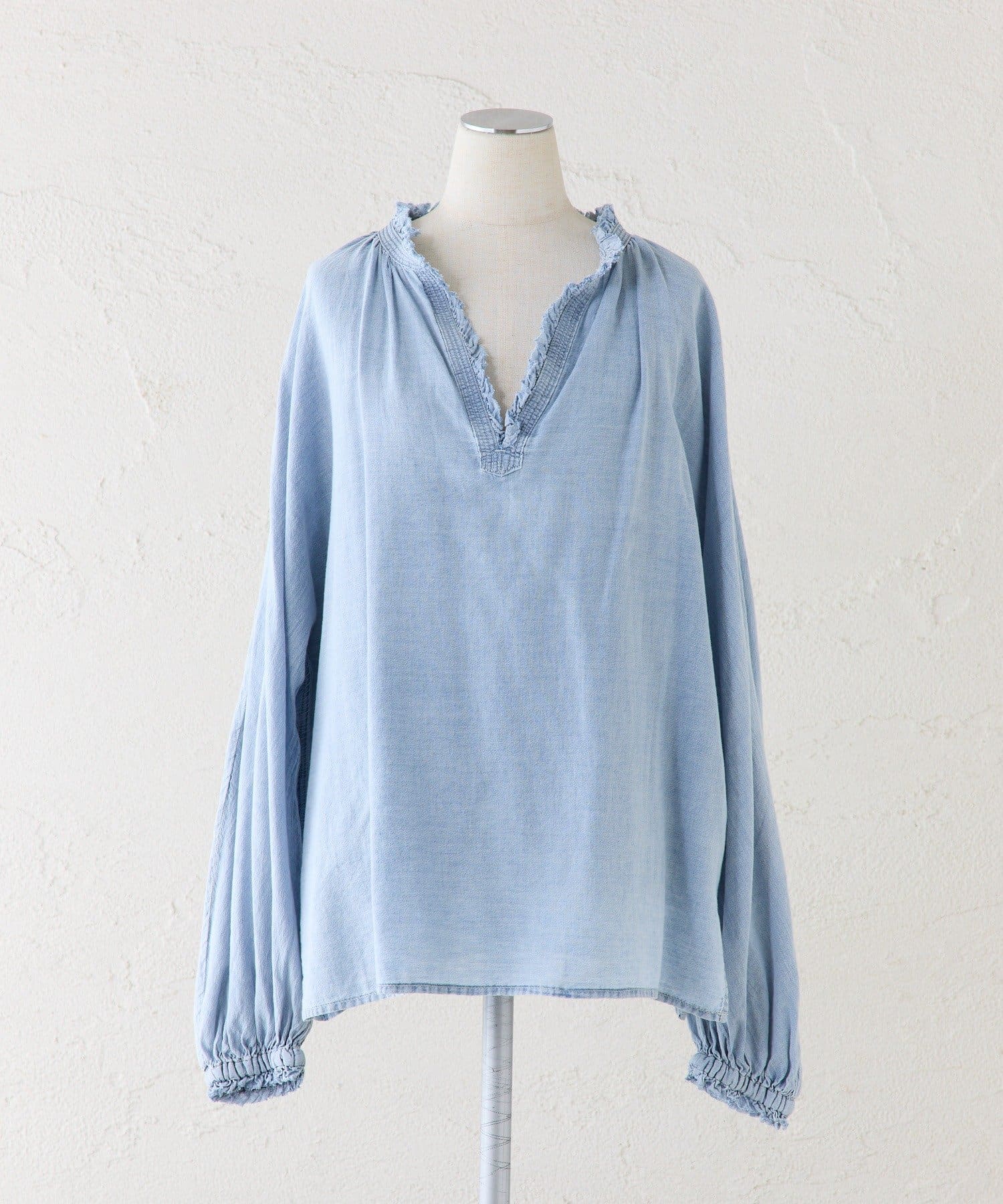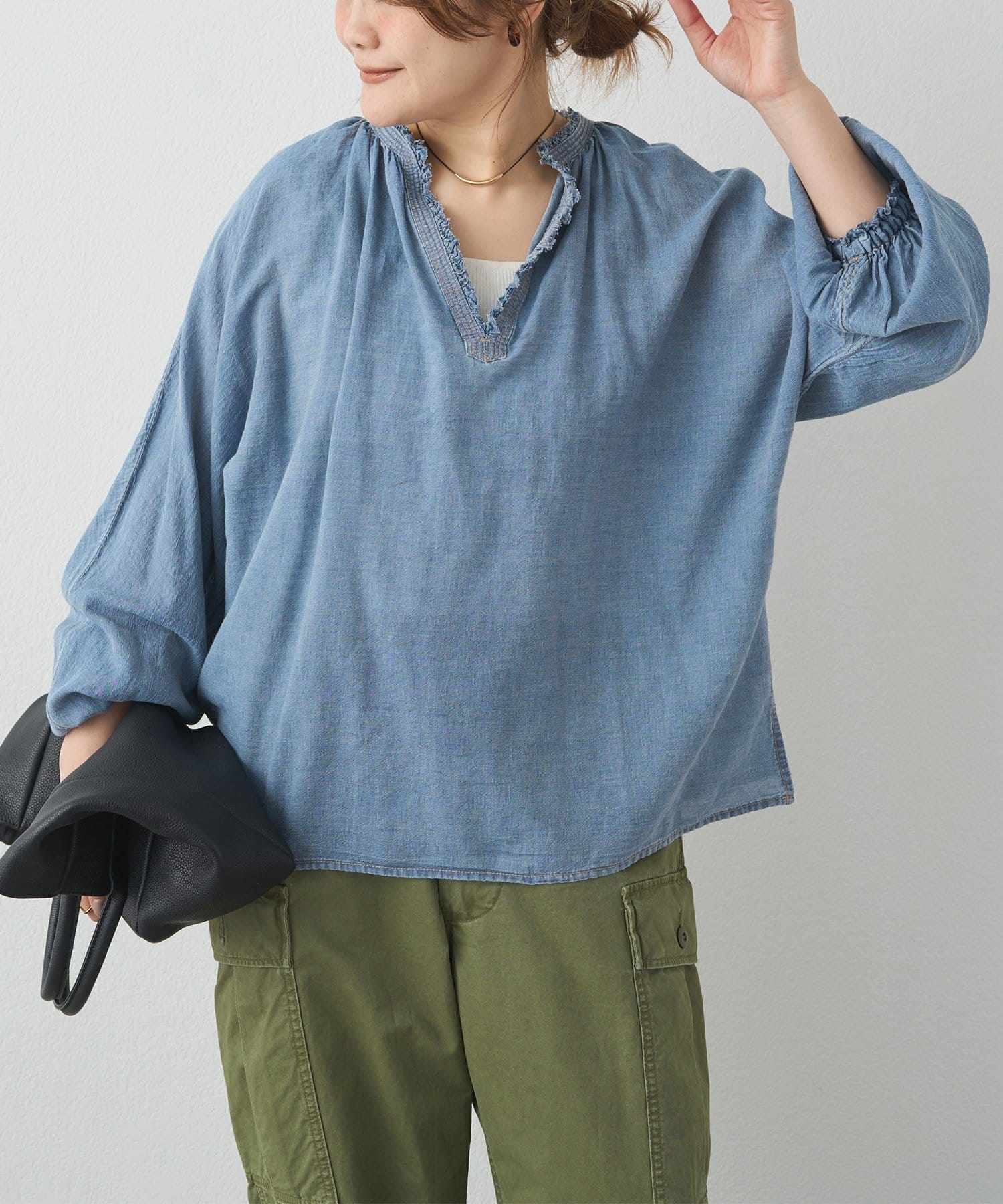 軽やかなデニム素材と深めのVネックが特徴のブラウスは