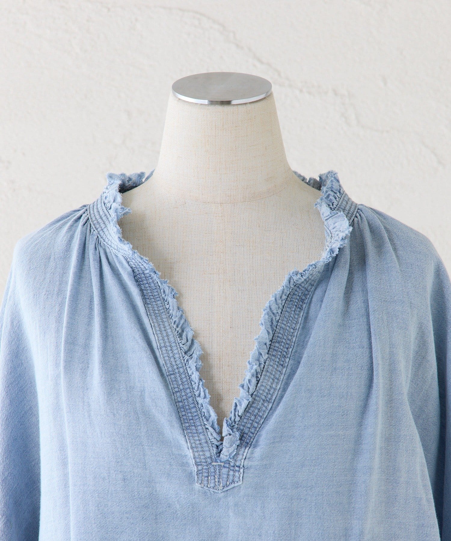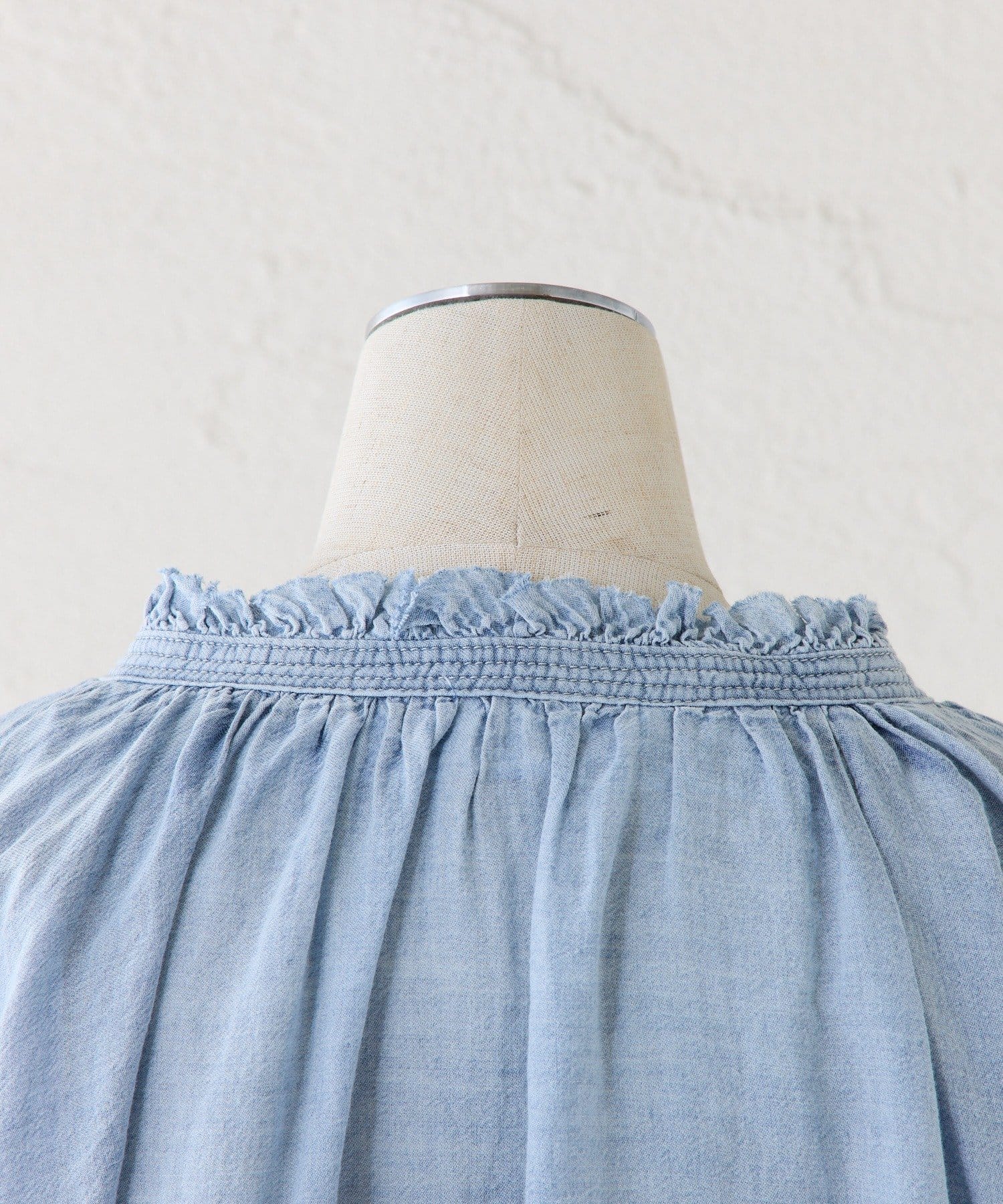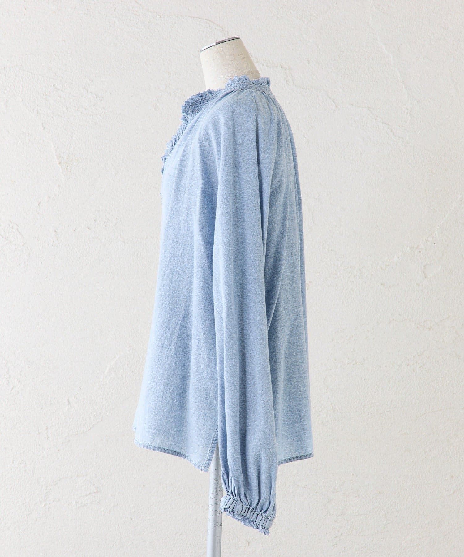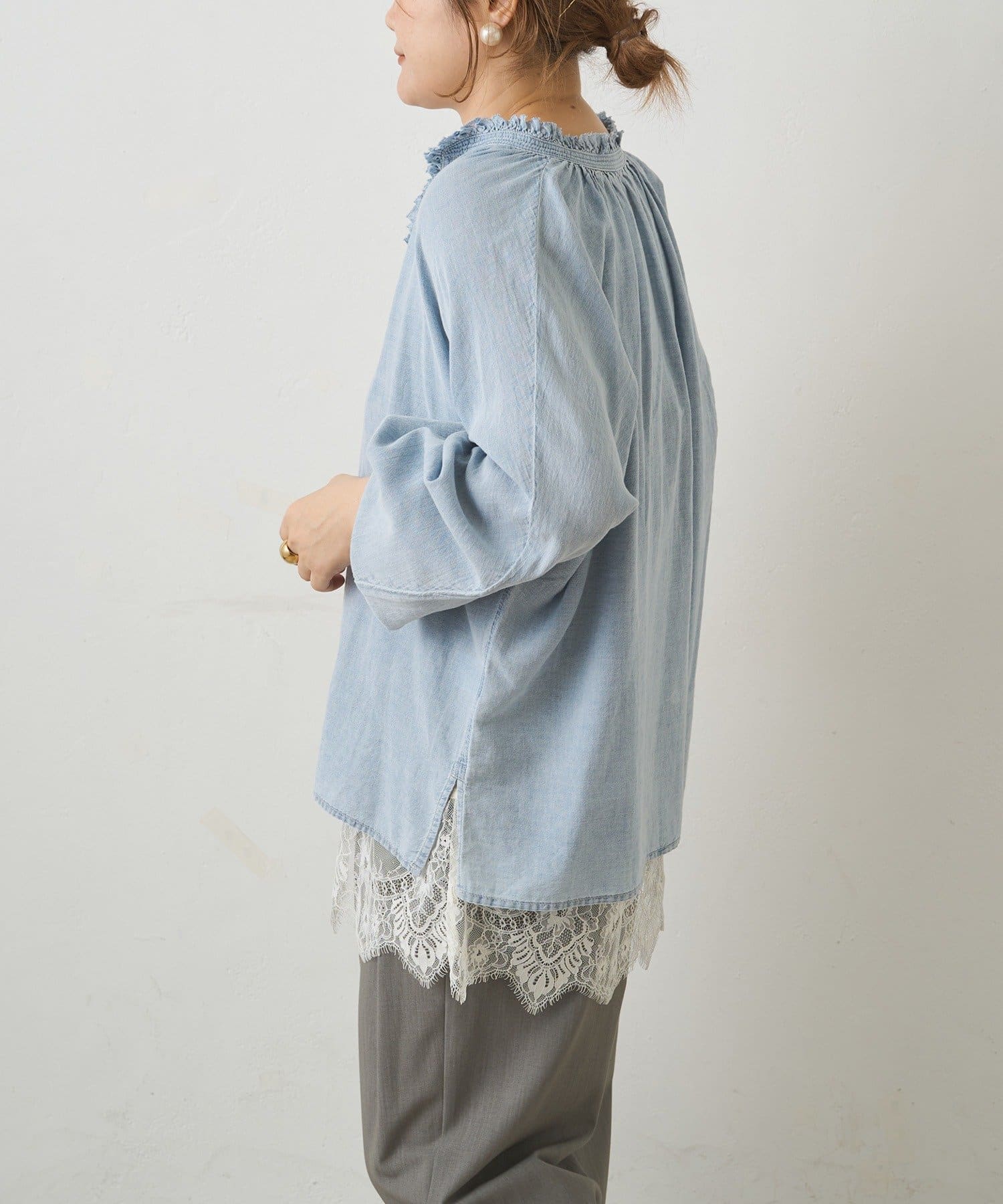 襟元フリルシアーデニムブラウス