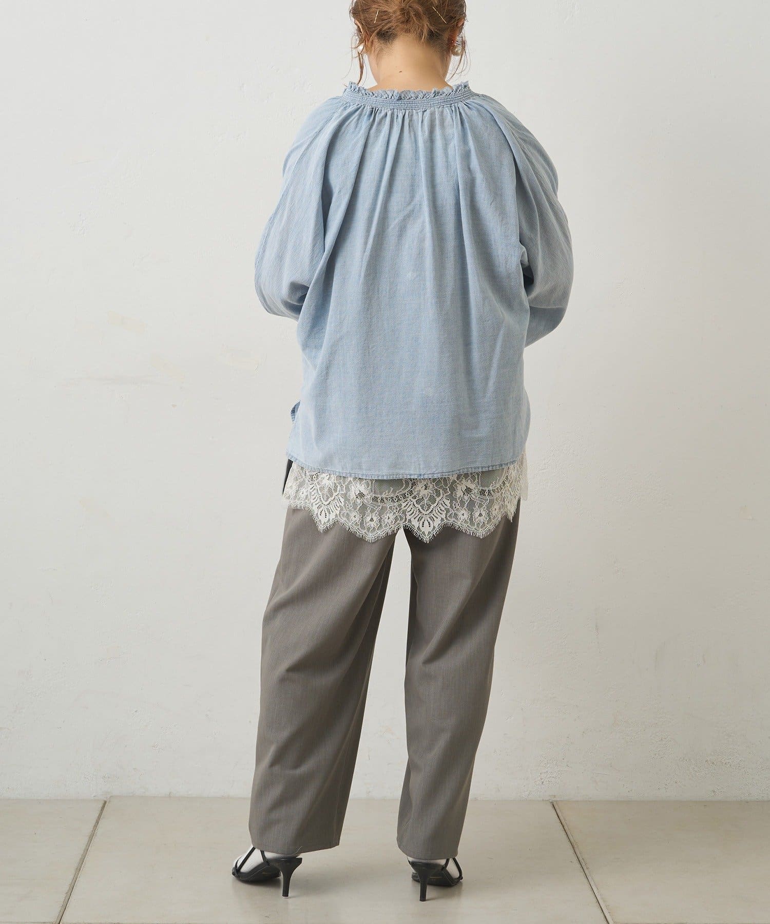 PUAL CE CIN(ピュアルセシン) 襟元フリルシアーデニムブラウス
