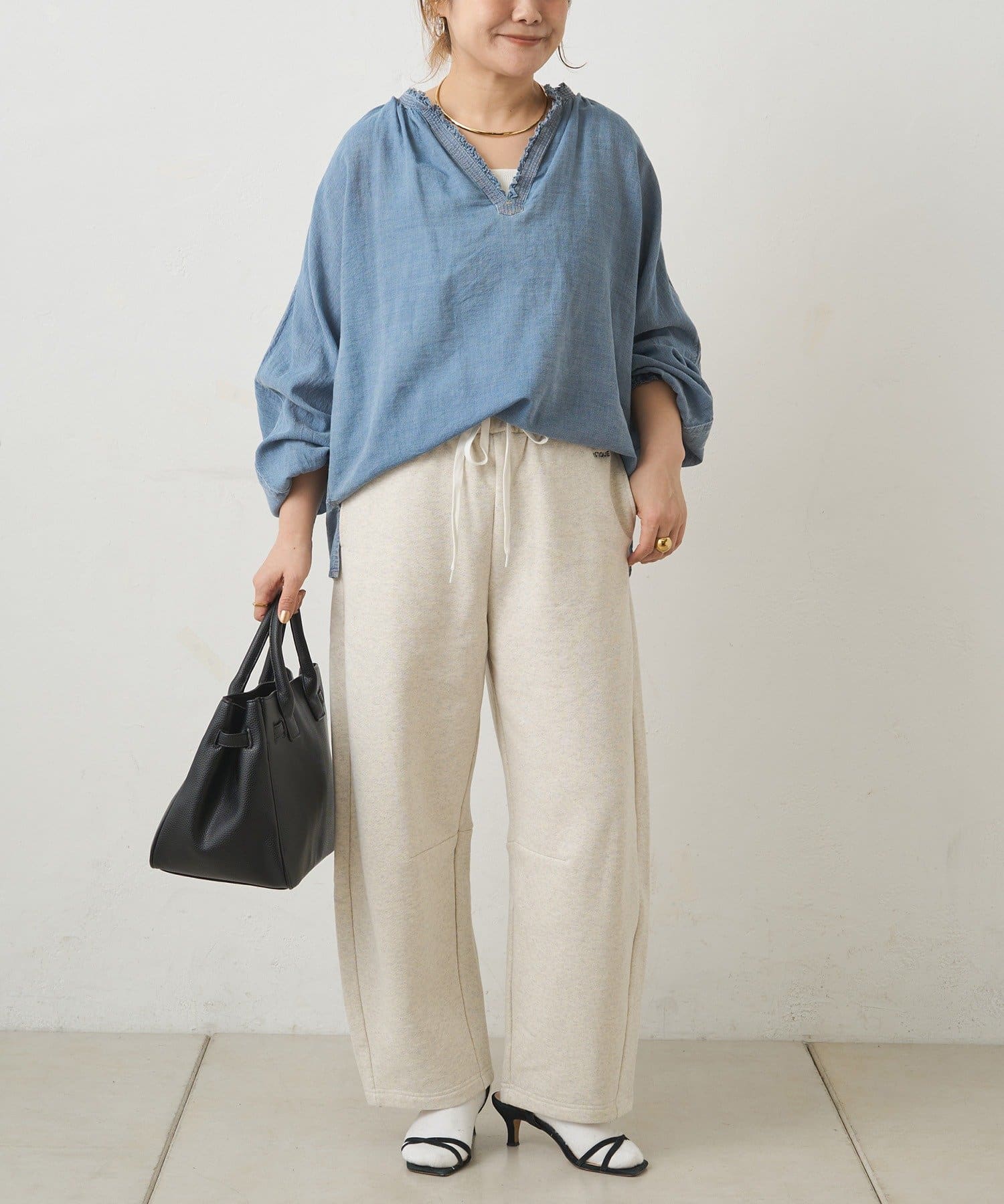 カジュアルな素材でも大人っぽくまとまり通勤にも馴染むバランスに。