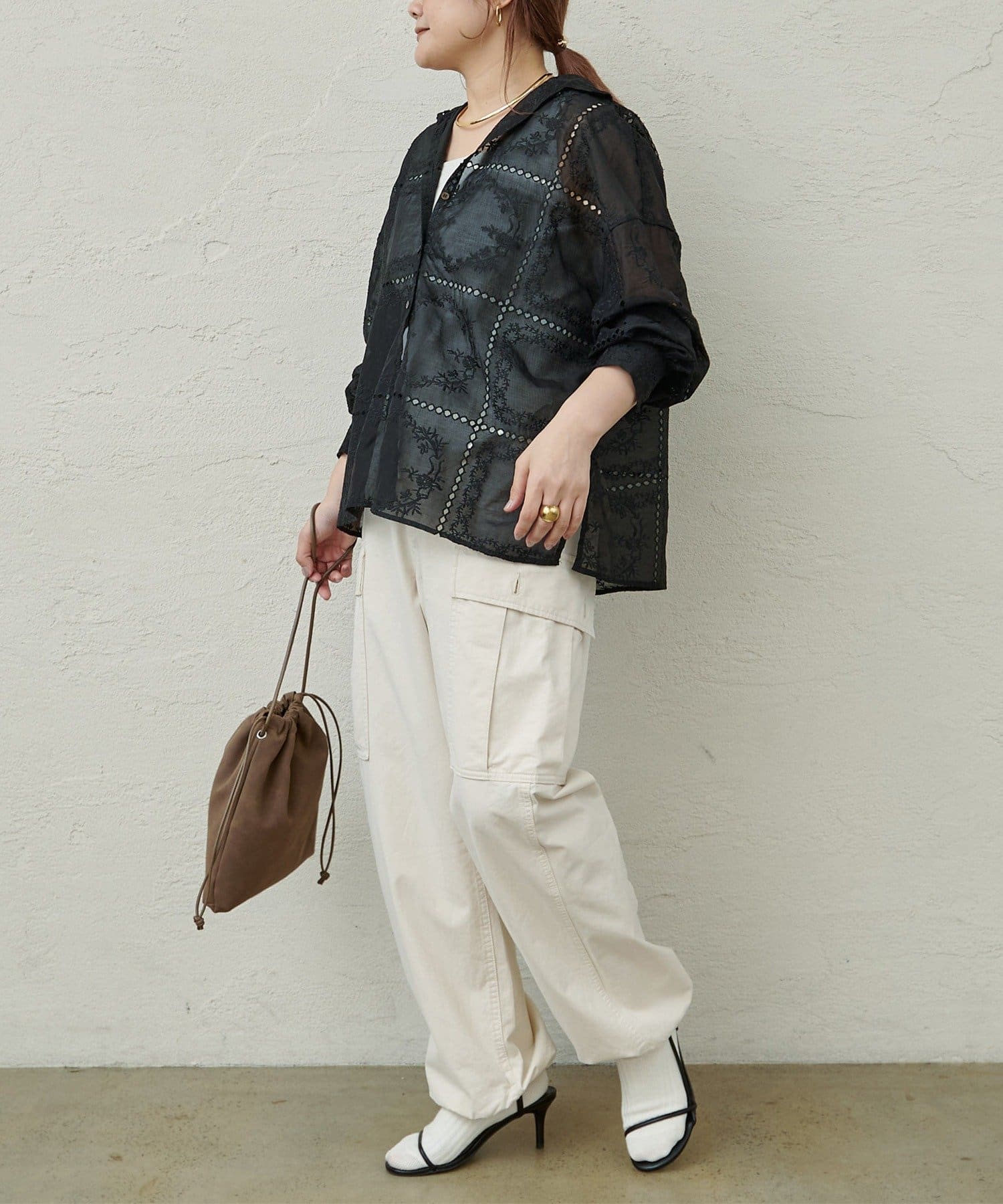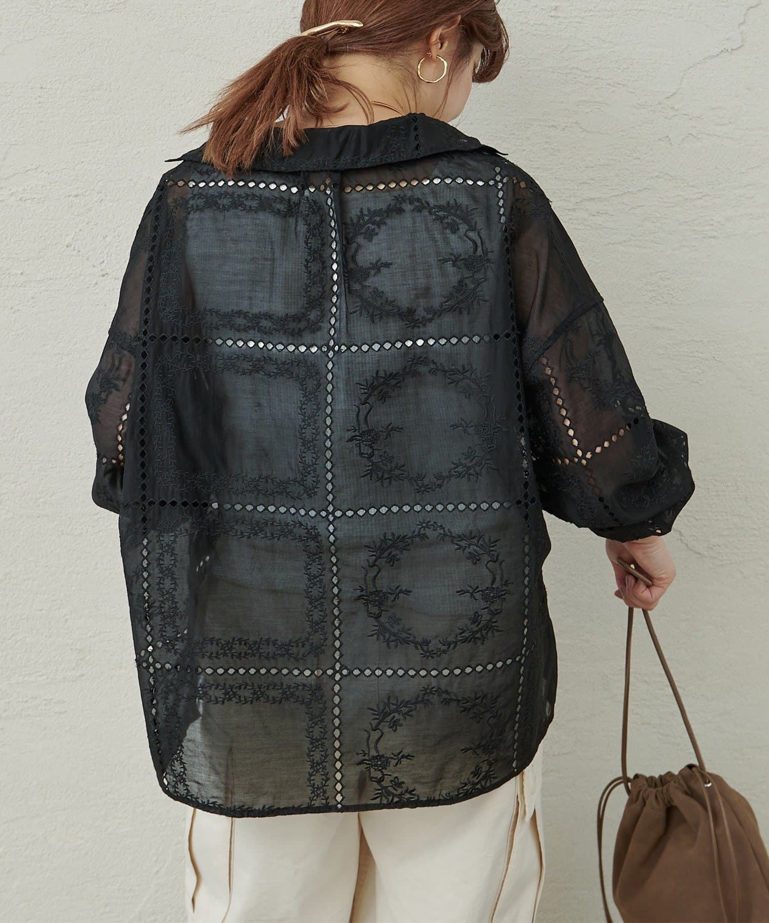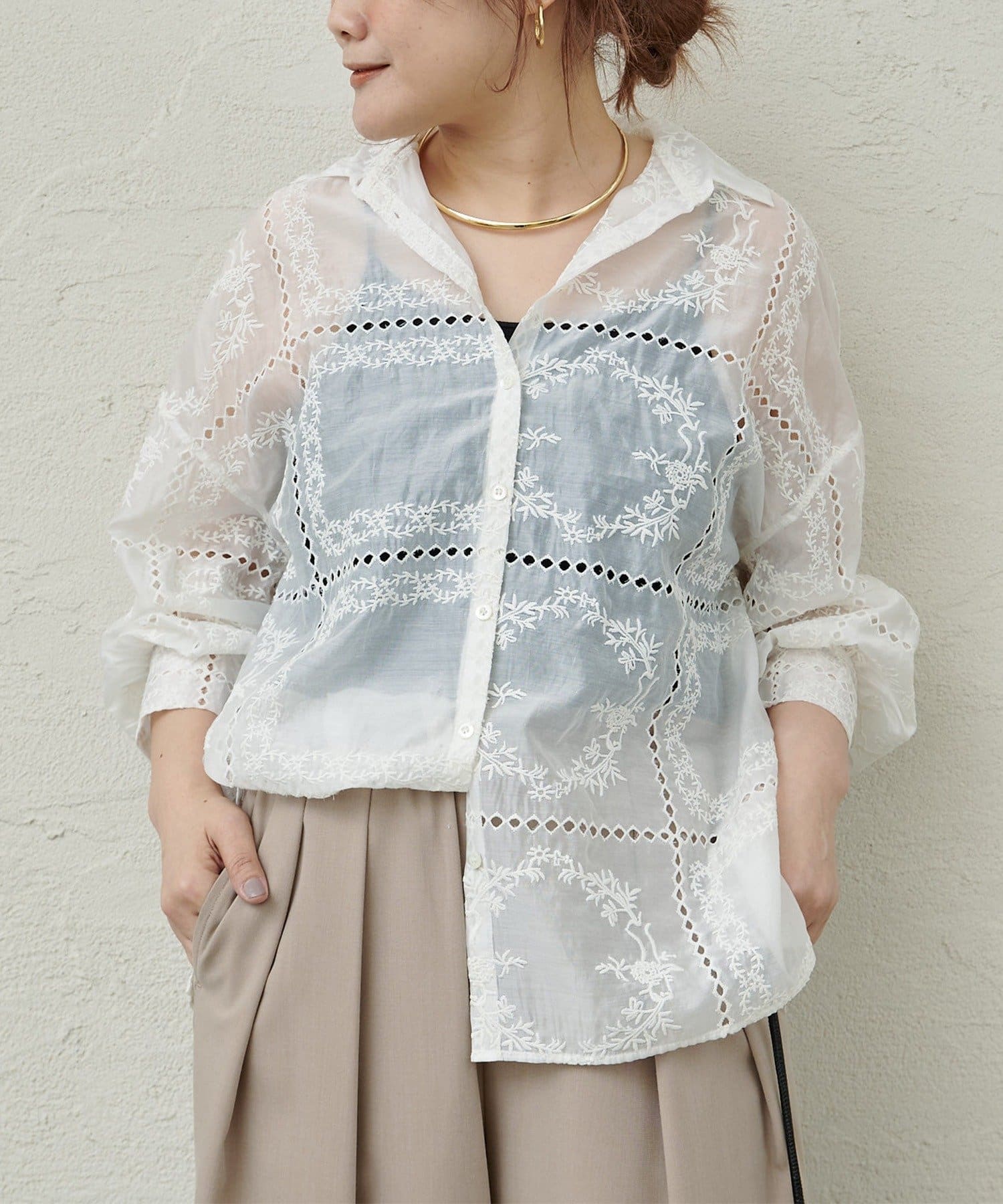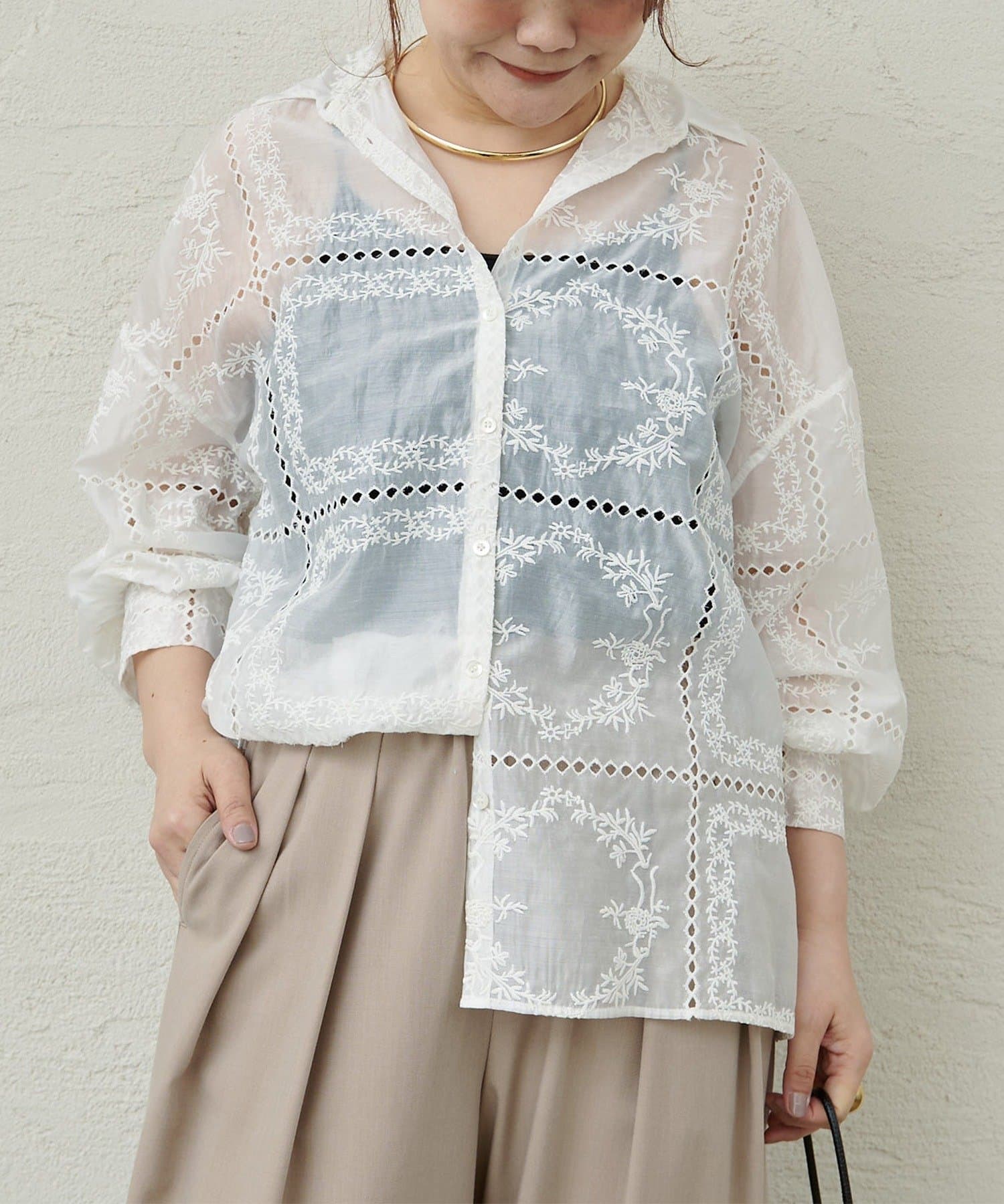気温差のある時期に頼れる実用性が魅力の刺繍ブラウス。