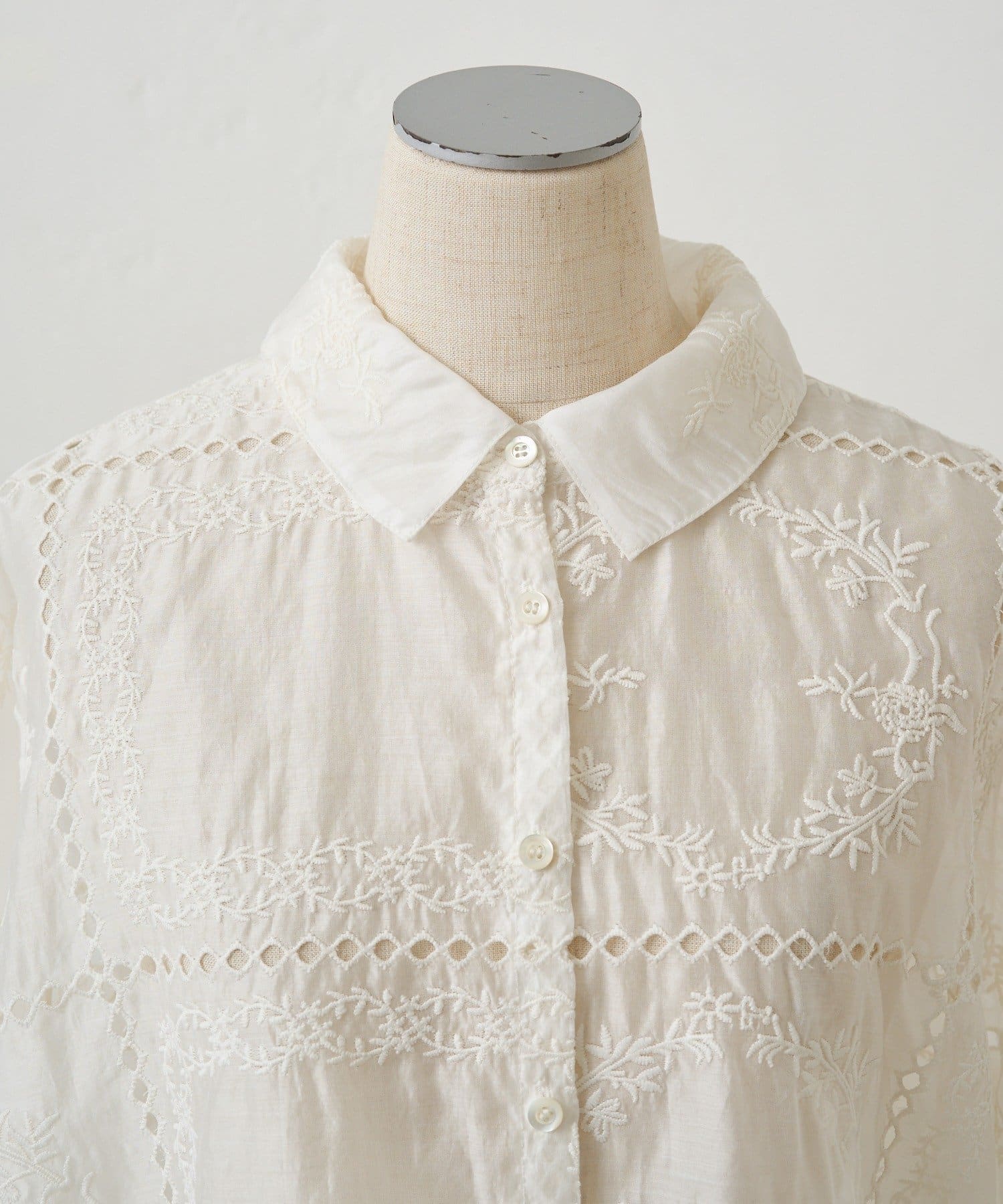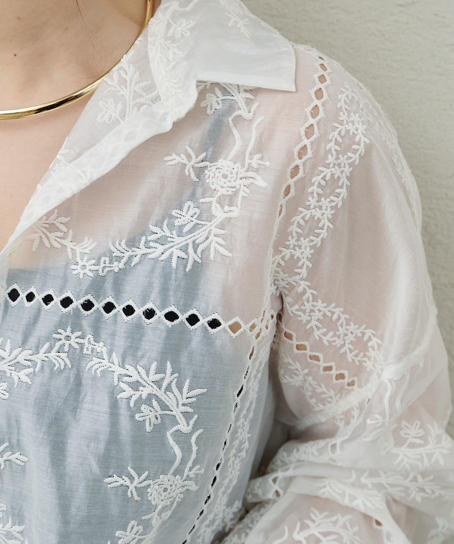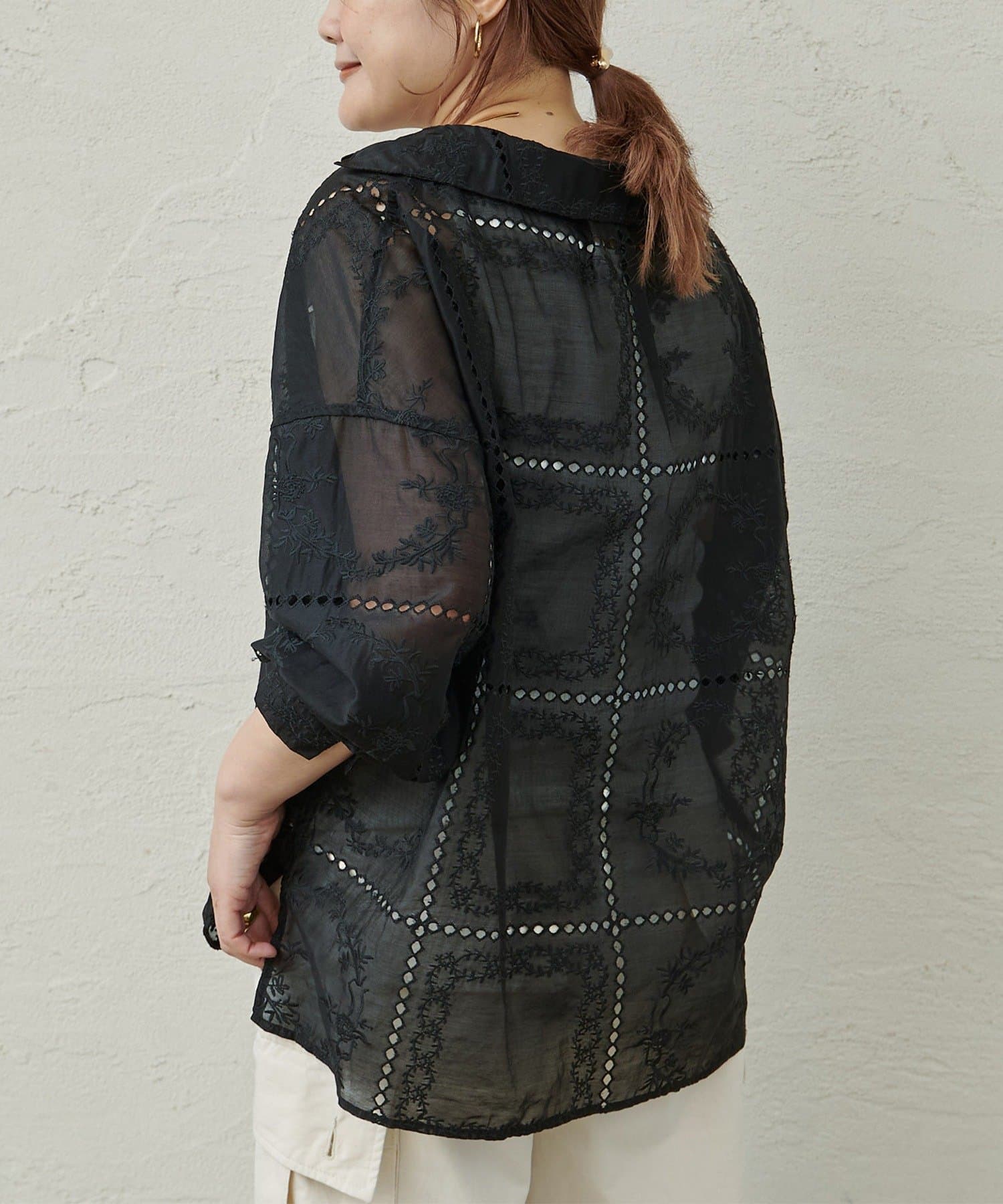 気温差のある時期に頼れる実用性が魅力の刺繍ブラウス。