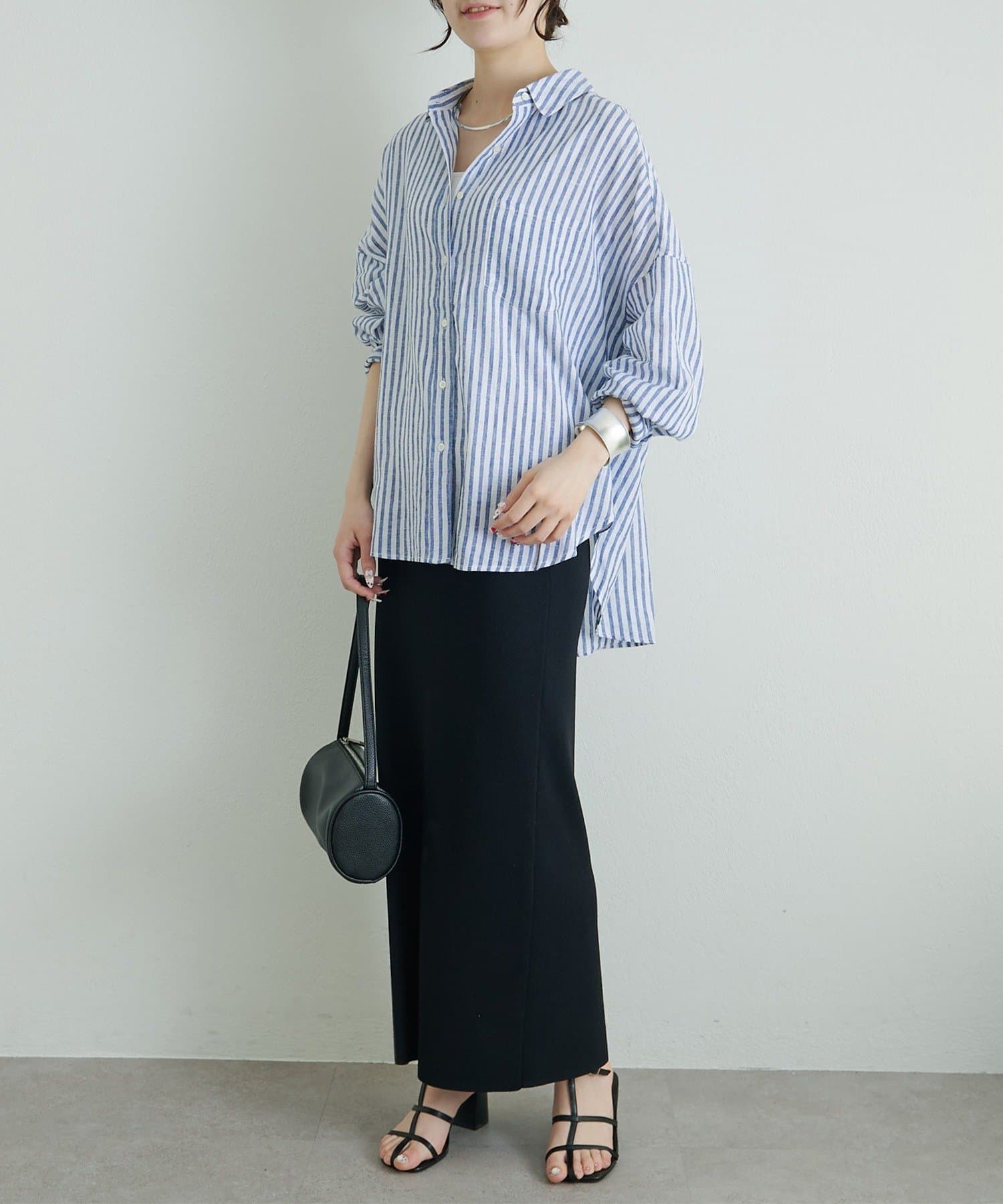 ストライプ柄が目を惹くので、1枚で着映えが叶うアイテム。