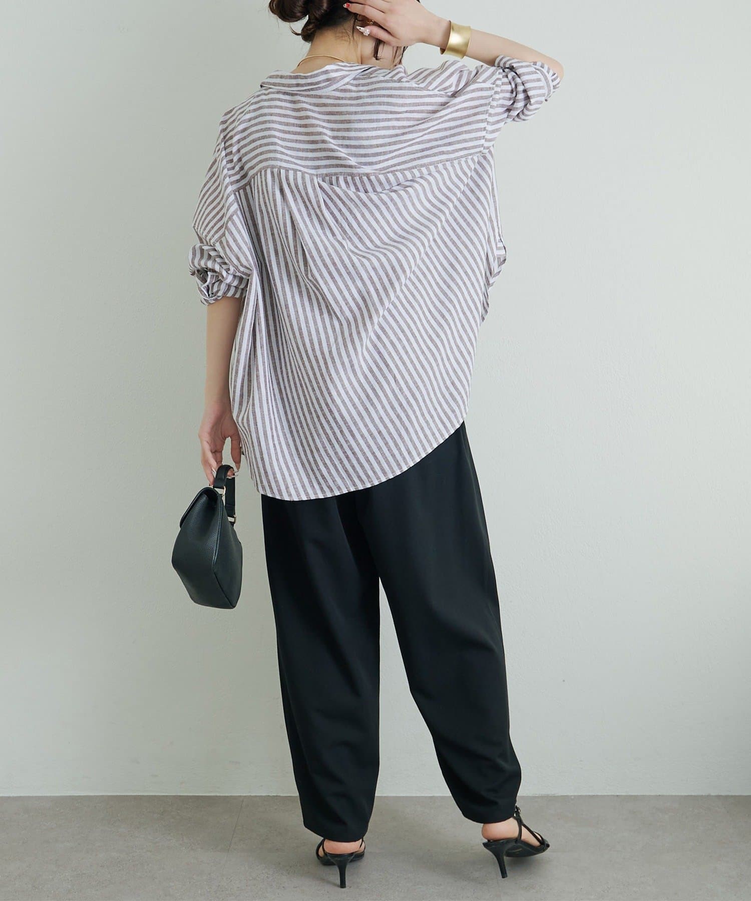 スラックスパンツ合わせにパンプスやバレエシューズできれいめに整えれば、オフィスカジュアルにも着まわせます。