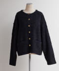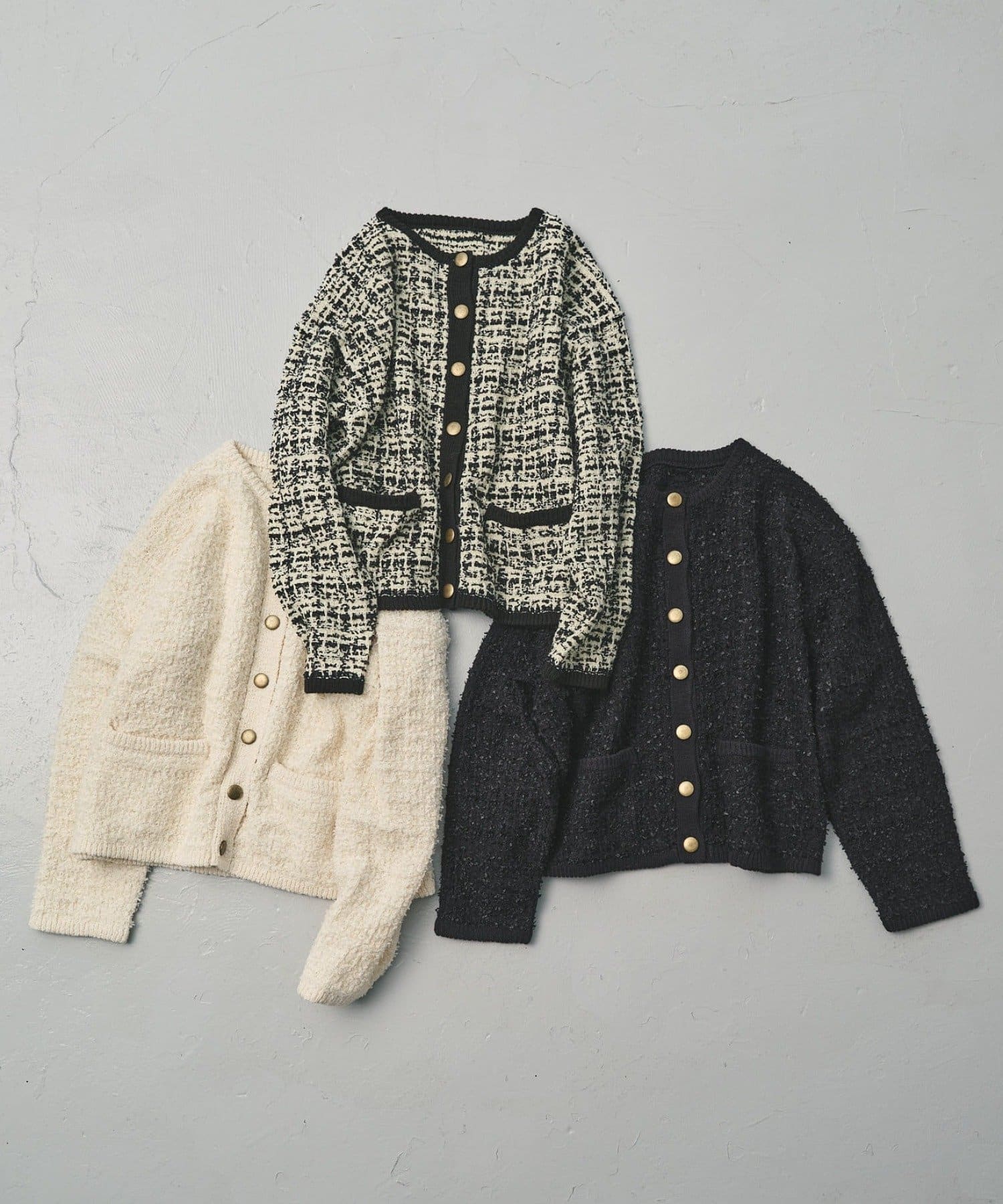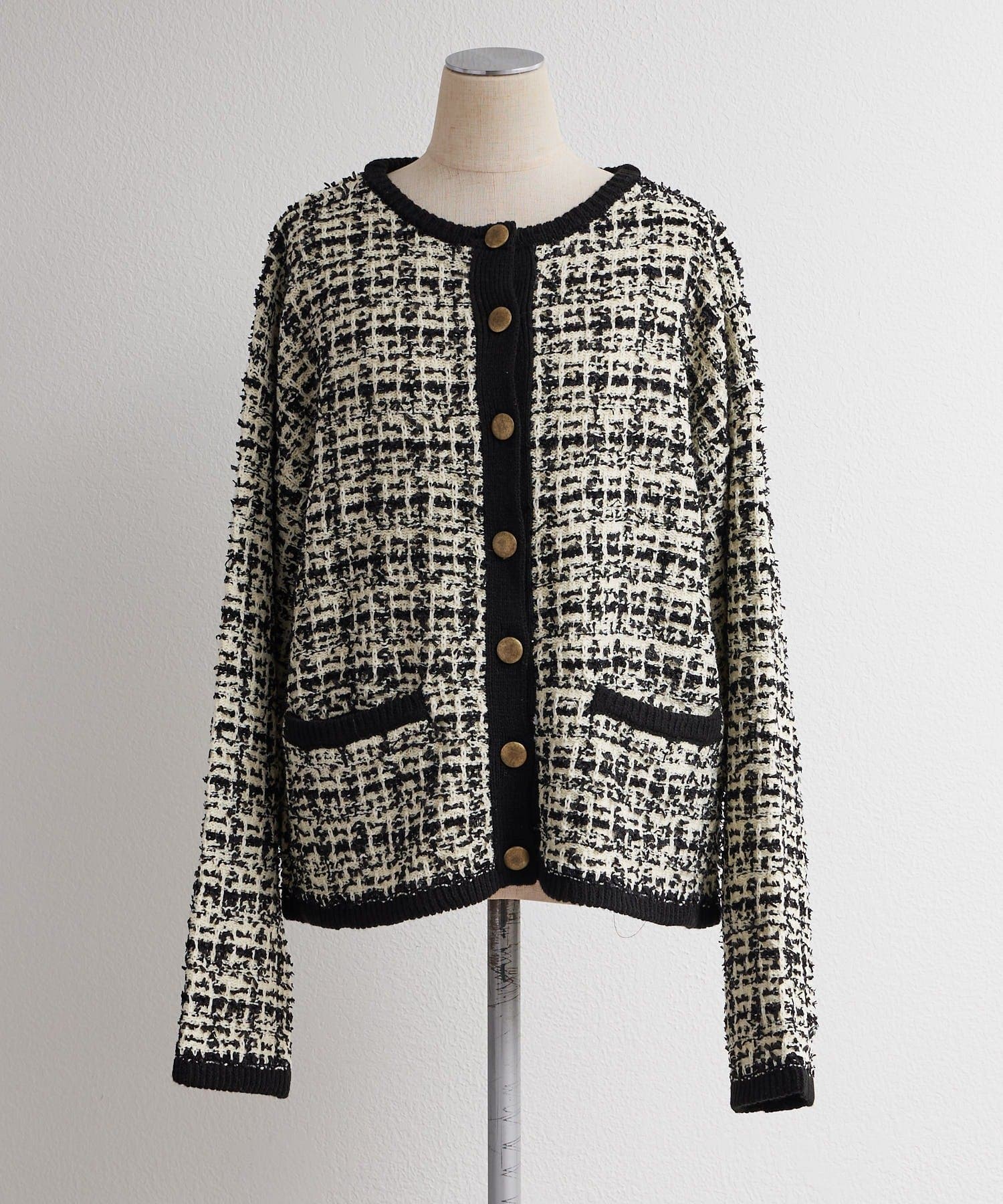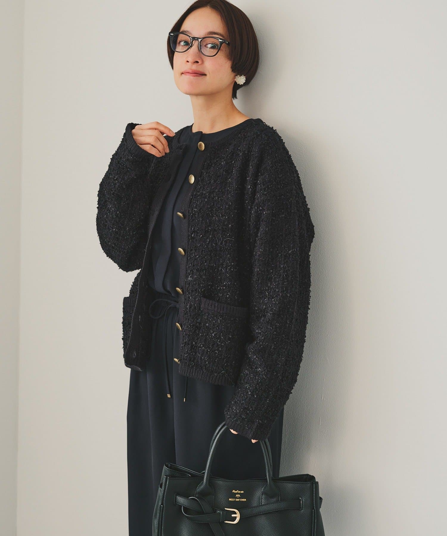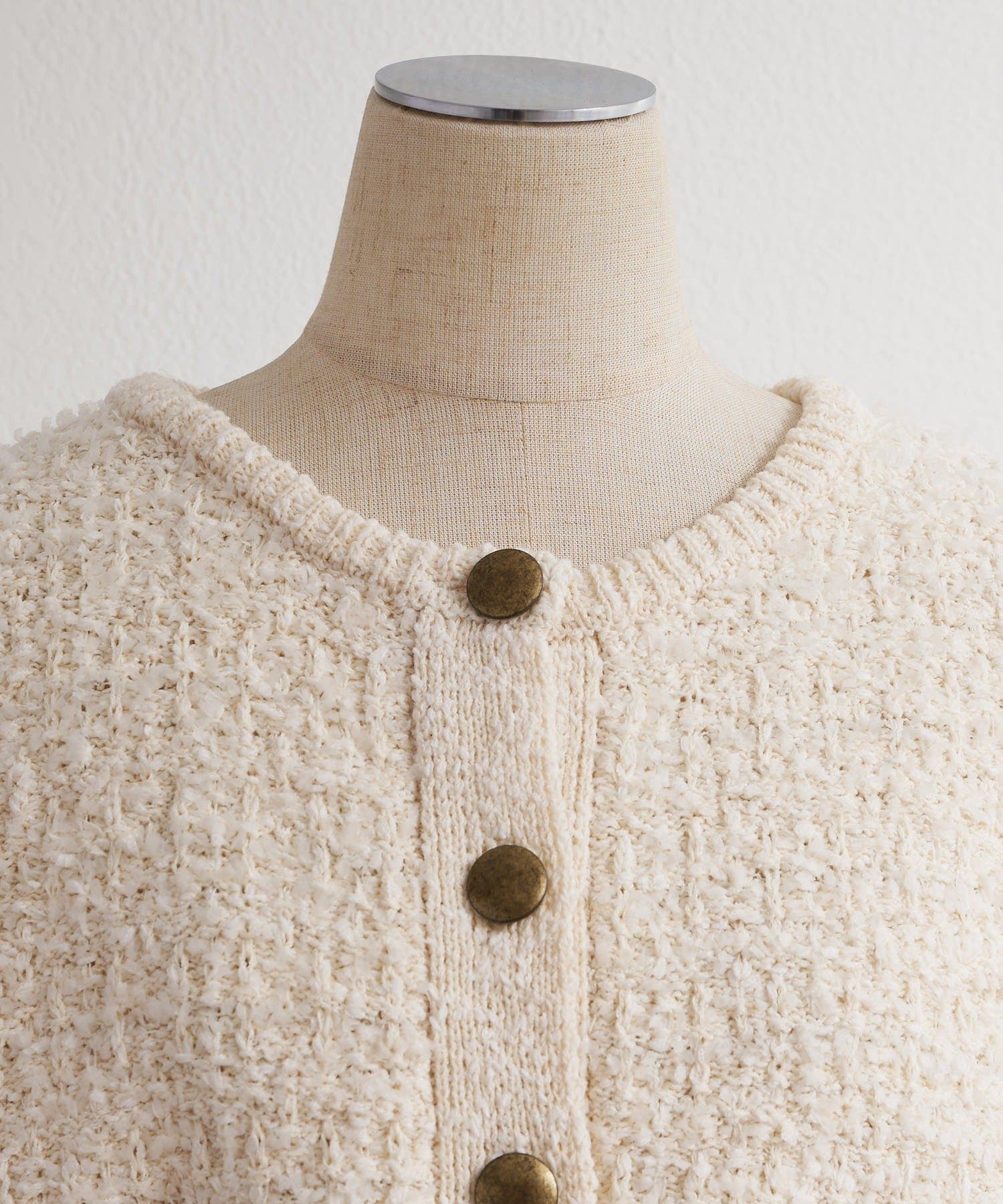 アンティーク調の真鍮ボタンが華やかな印象を与えてくれるツイード調ニットカーディガン。