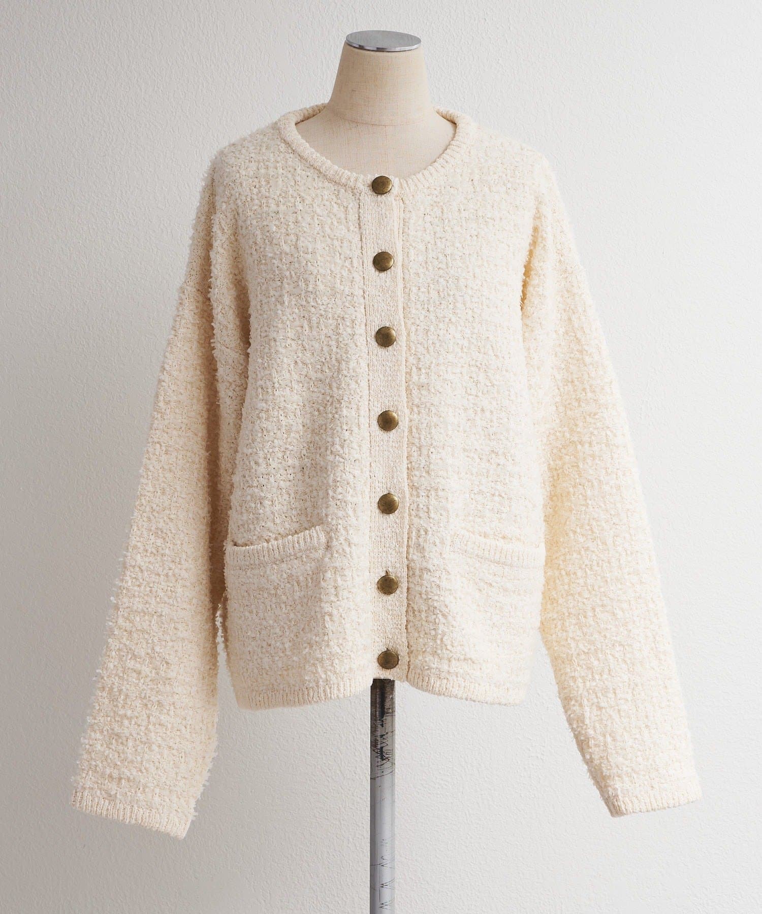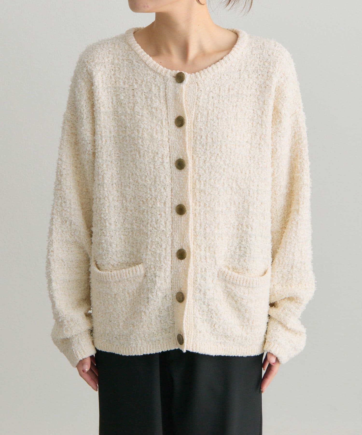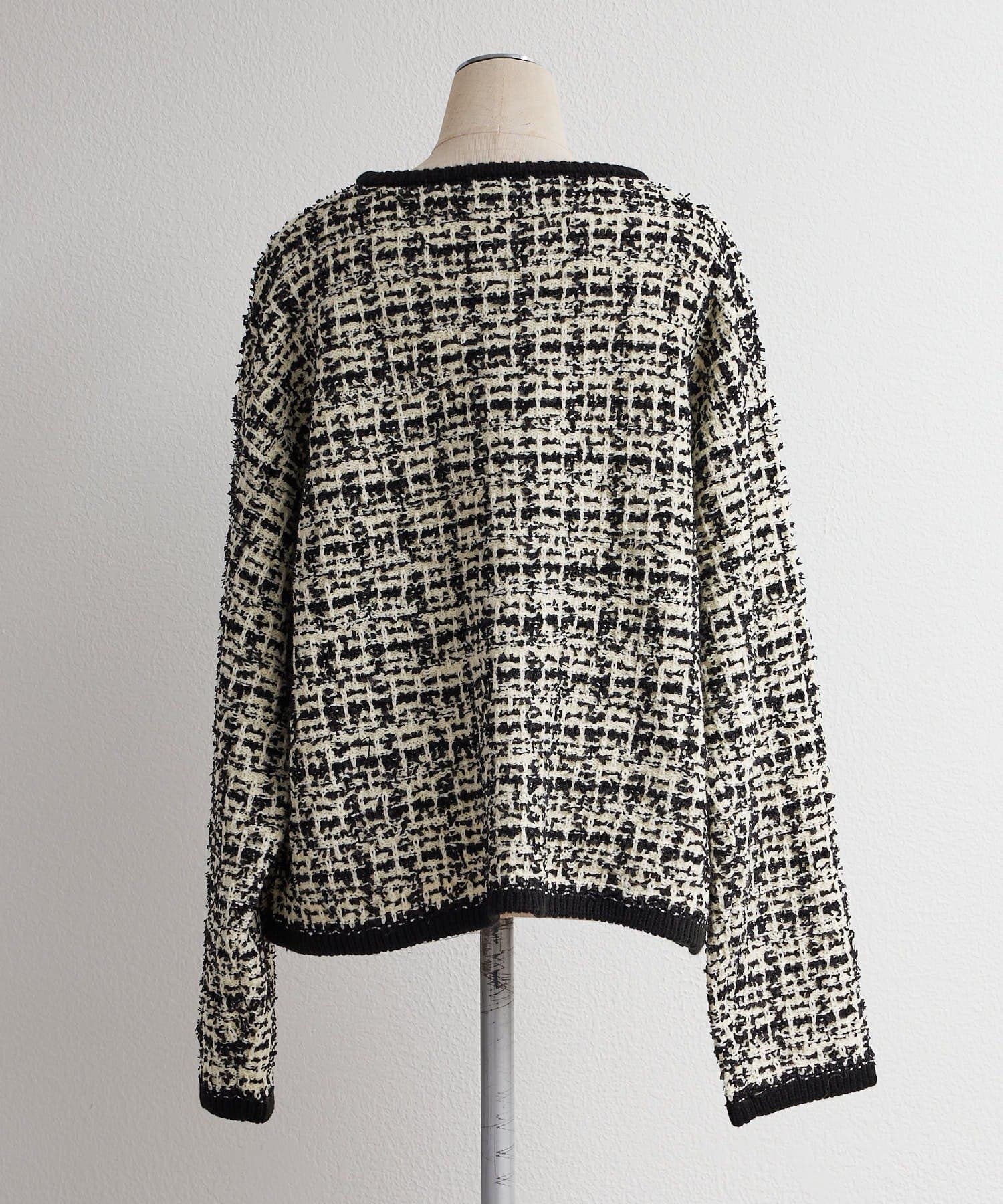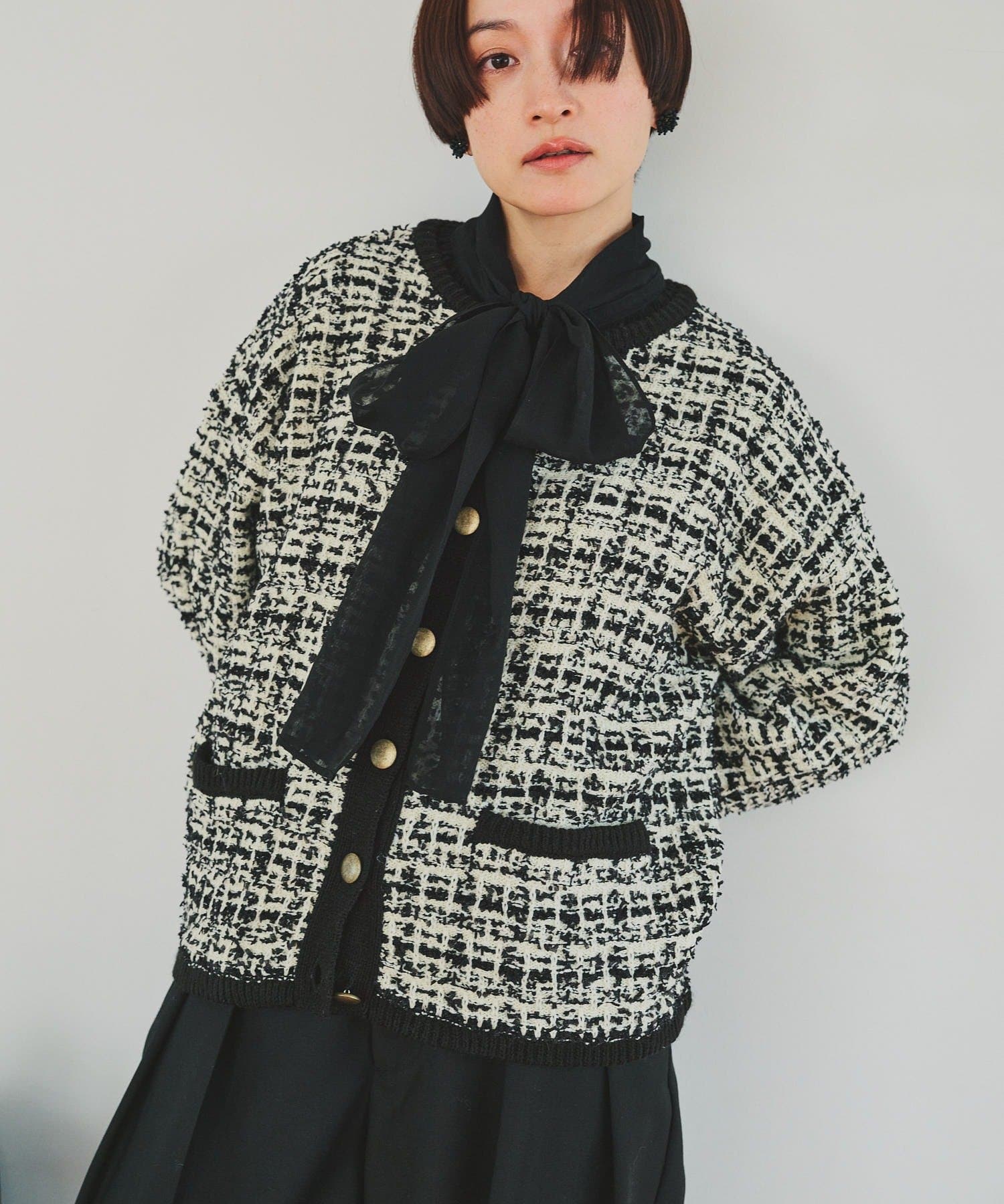 アンティーク調の真鍮ボタンが華やかな印象を与えてくれるツイード調ニットカーディガン。