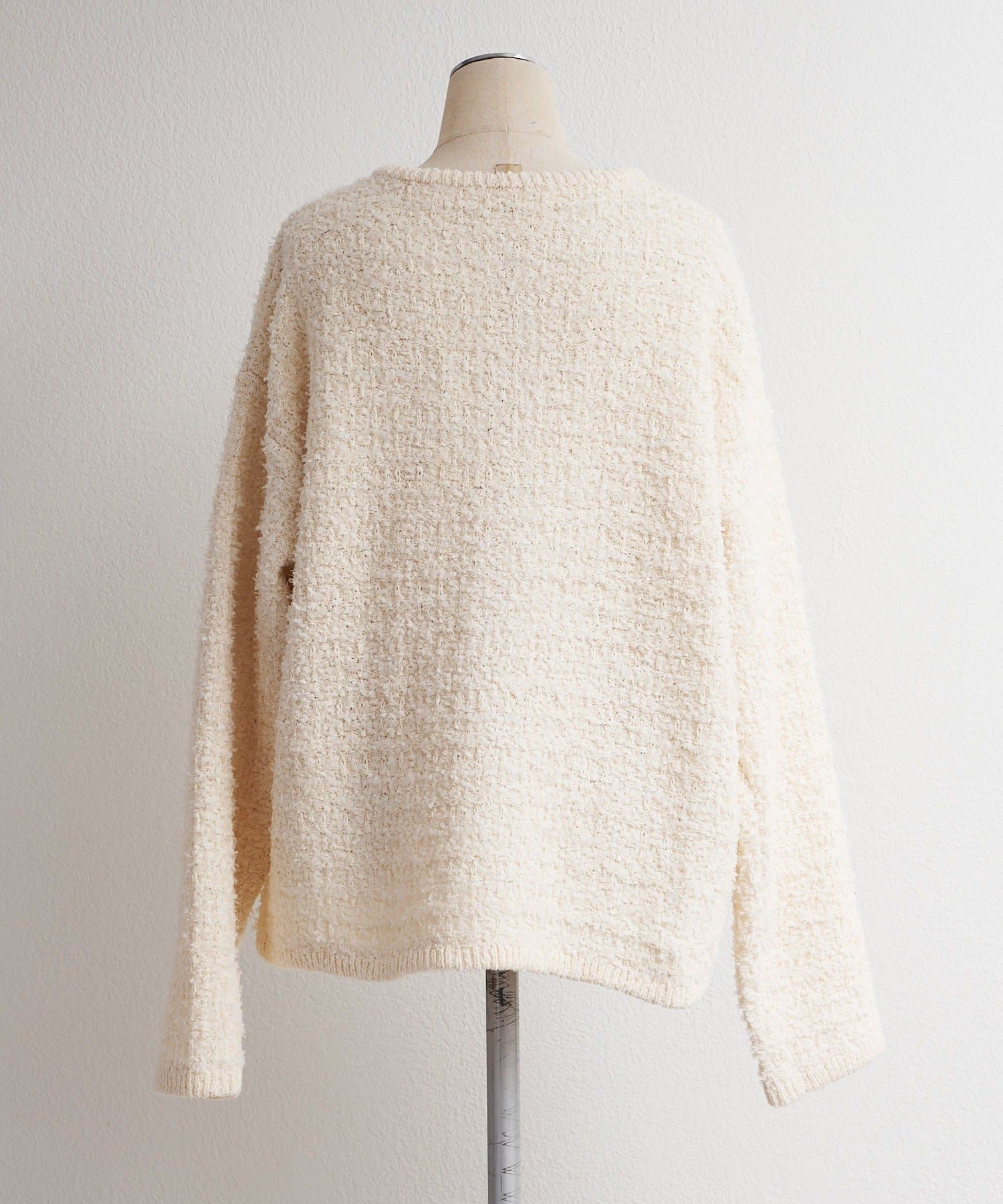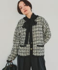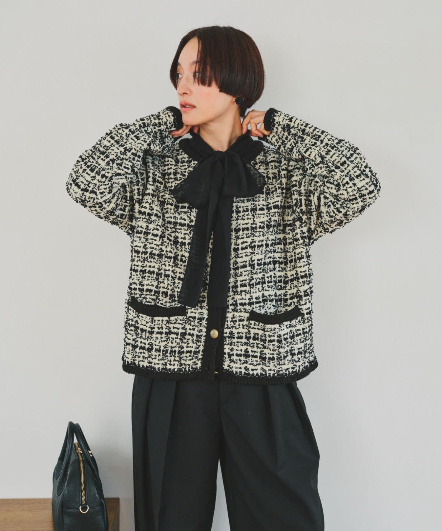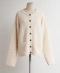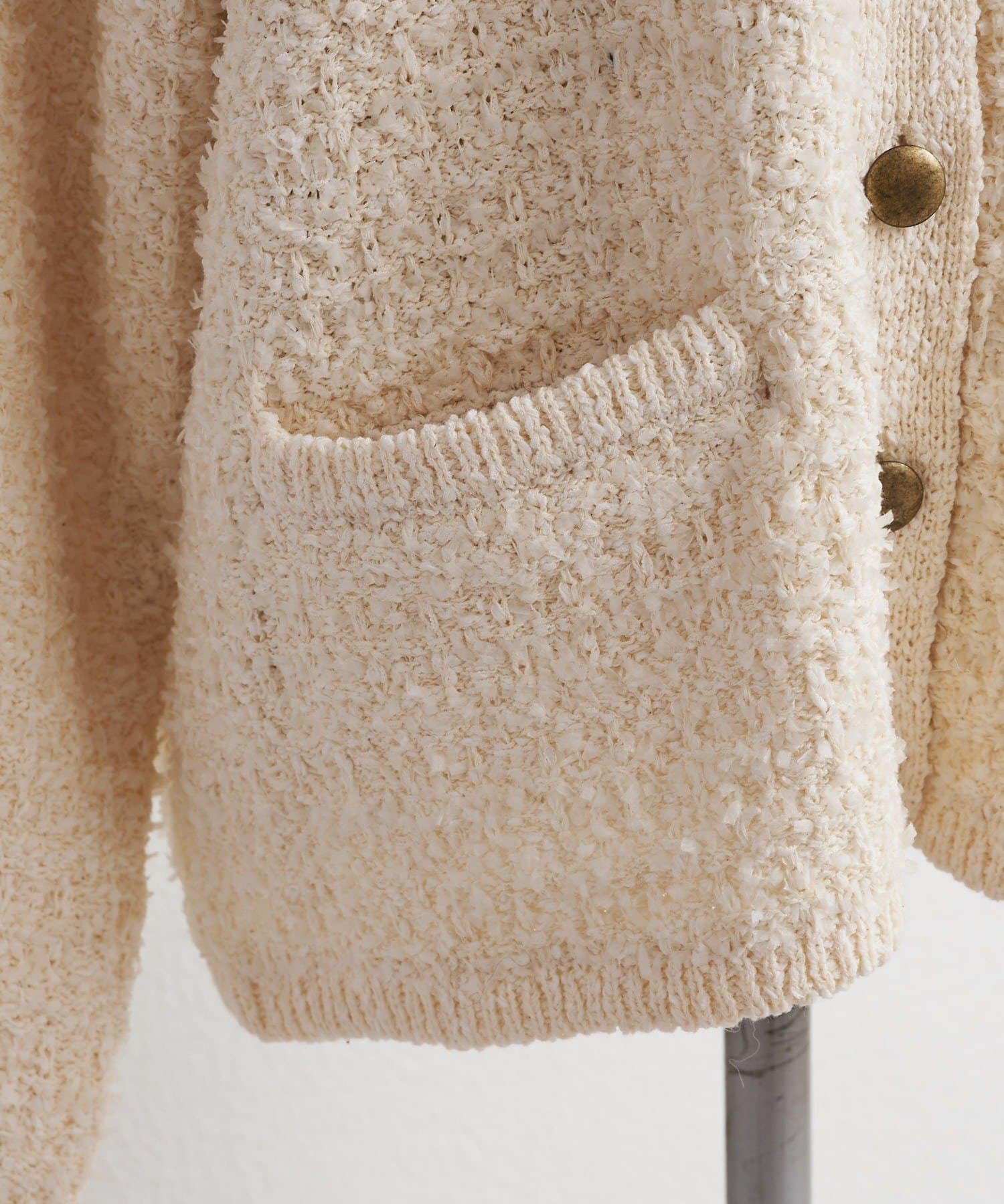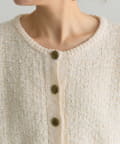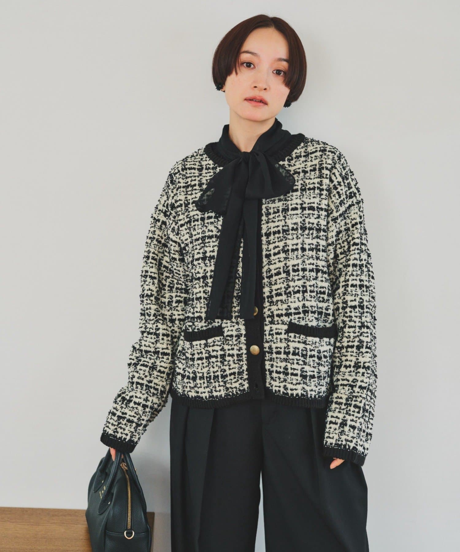 アンティーク調の真鍮ボタンが華やかな印象を与えてくれるツイード調ニットカーディガン。