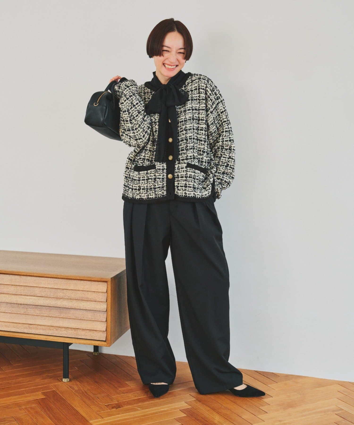 インにはボウタイやレースブラウスを合わせてレディなスタイリングや