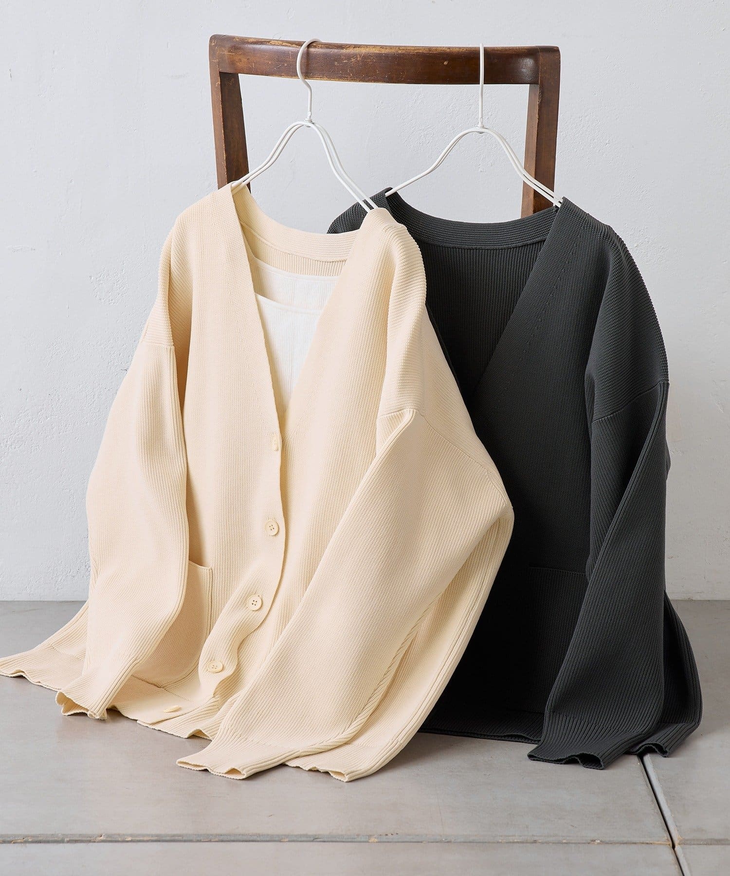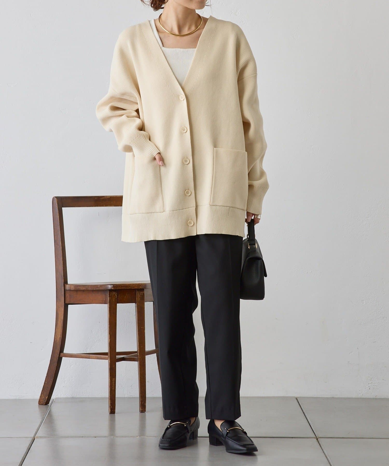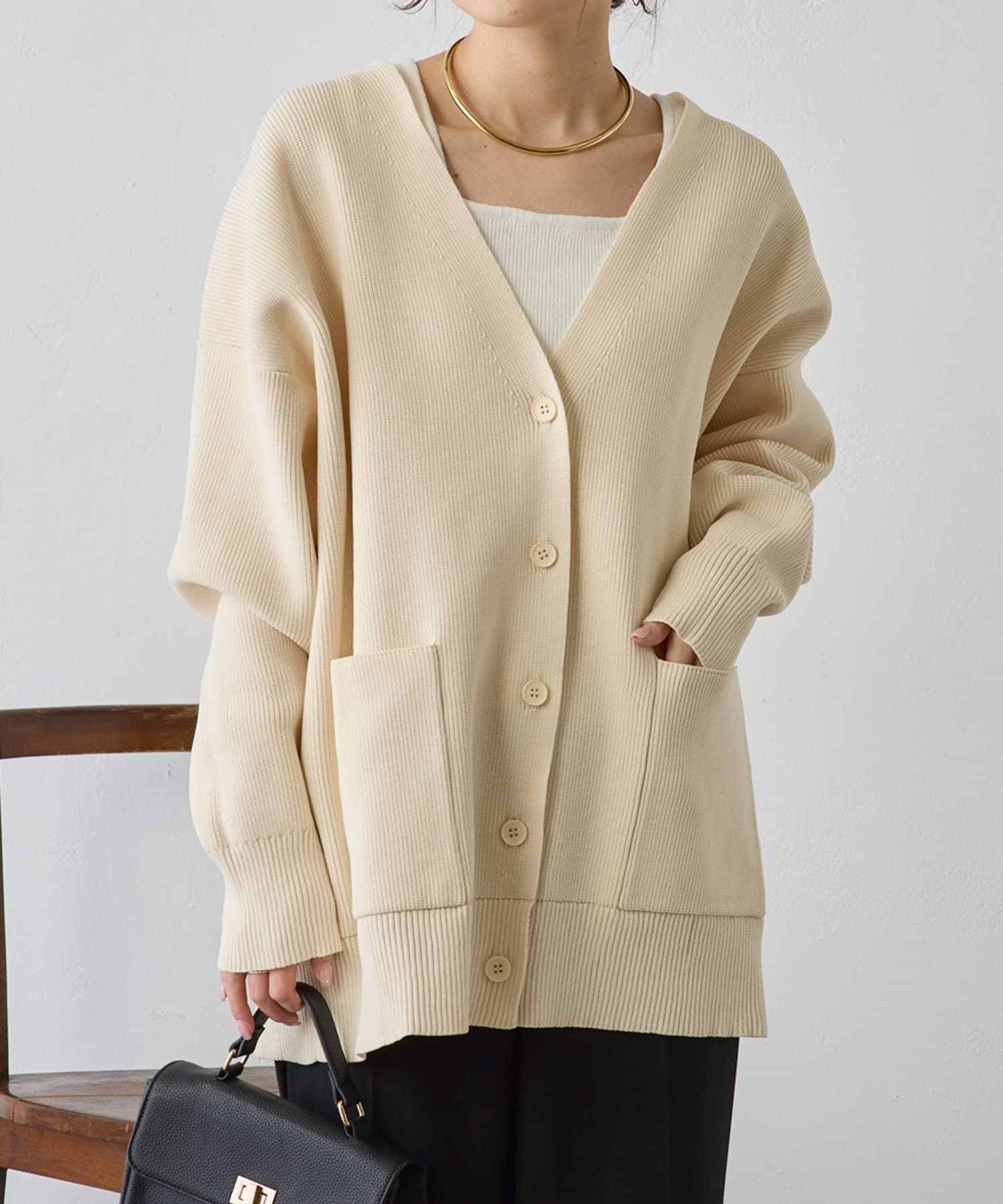 編み地にハリ感があり、フォルムがしっかりキープされるため着映えする主役級カーディガン。