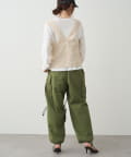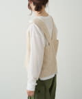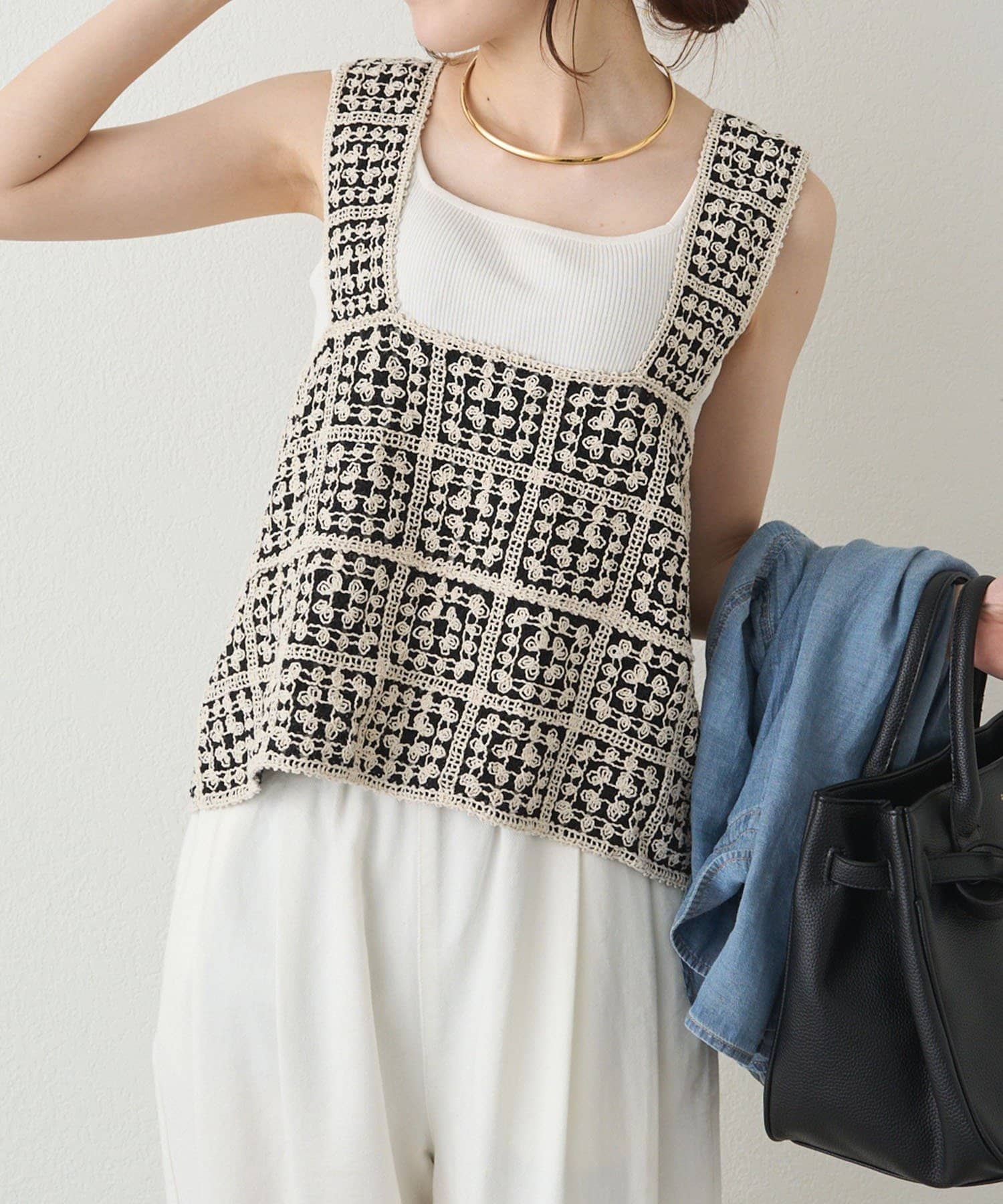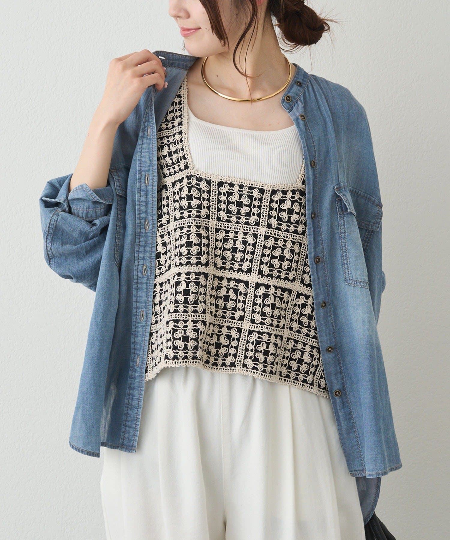 プラスワンで旬なレイヤードコーデが完成するかぎ針編み風ビスチェ。