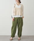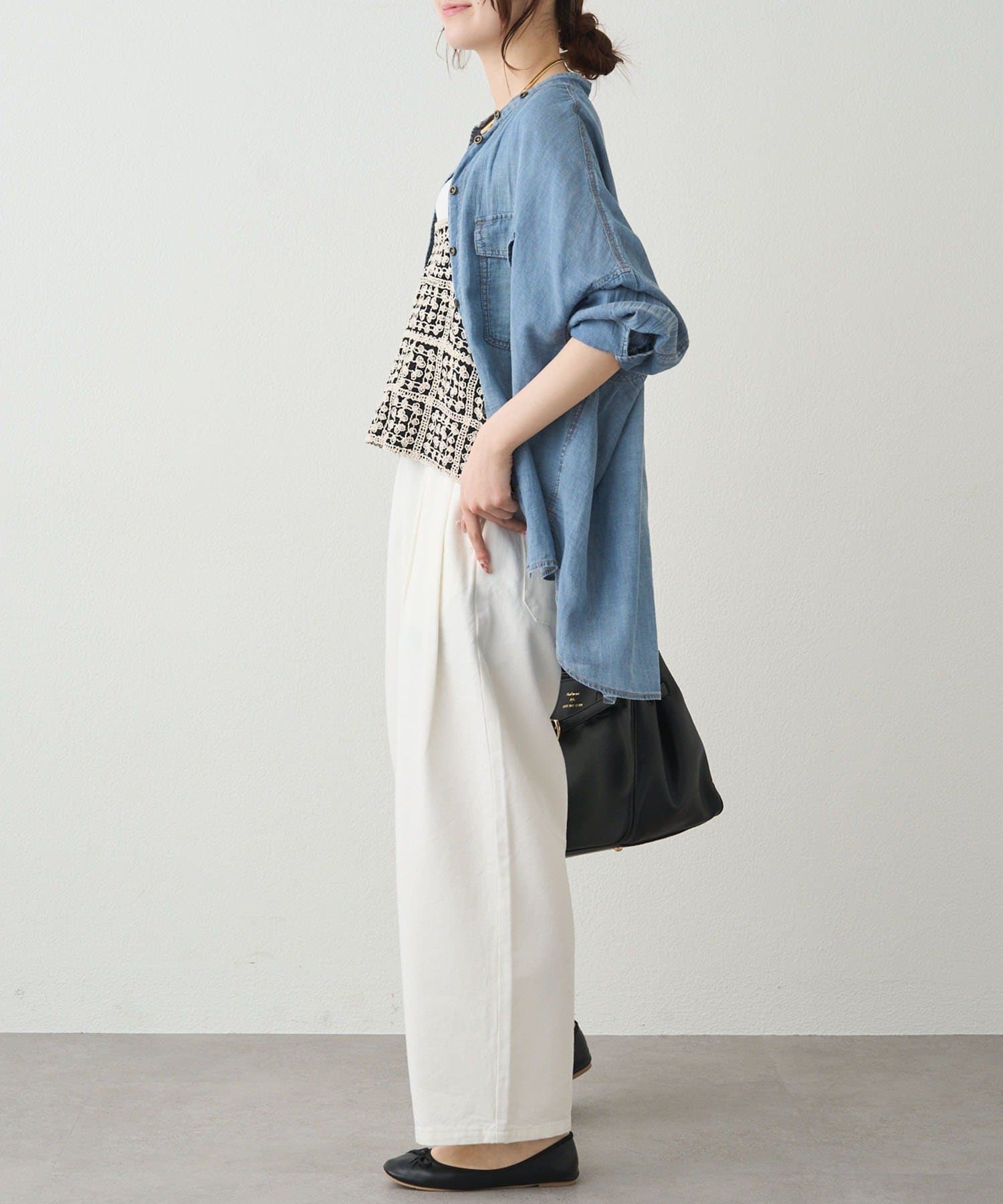 着用感:シャリ感のあるドライな素材感。軽やかでワイドなシルエットなので、インナーを選ばず着回せます。
