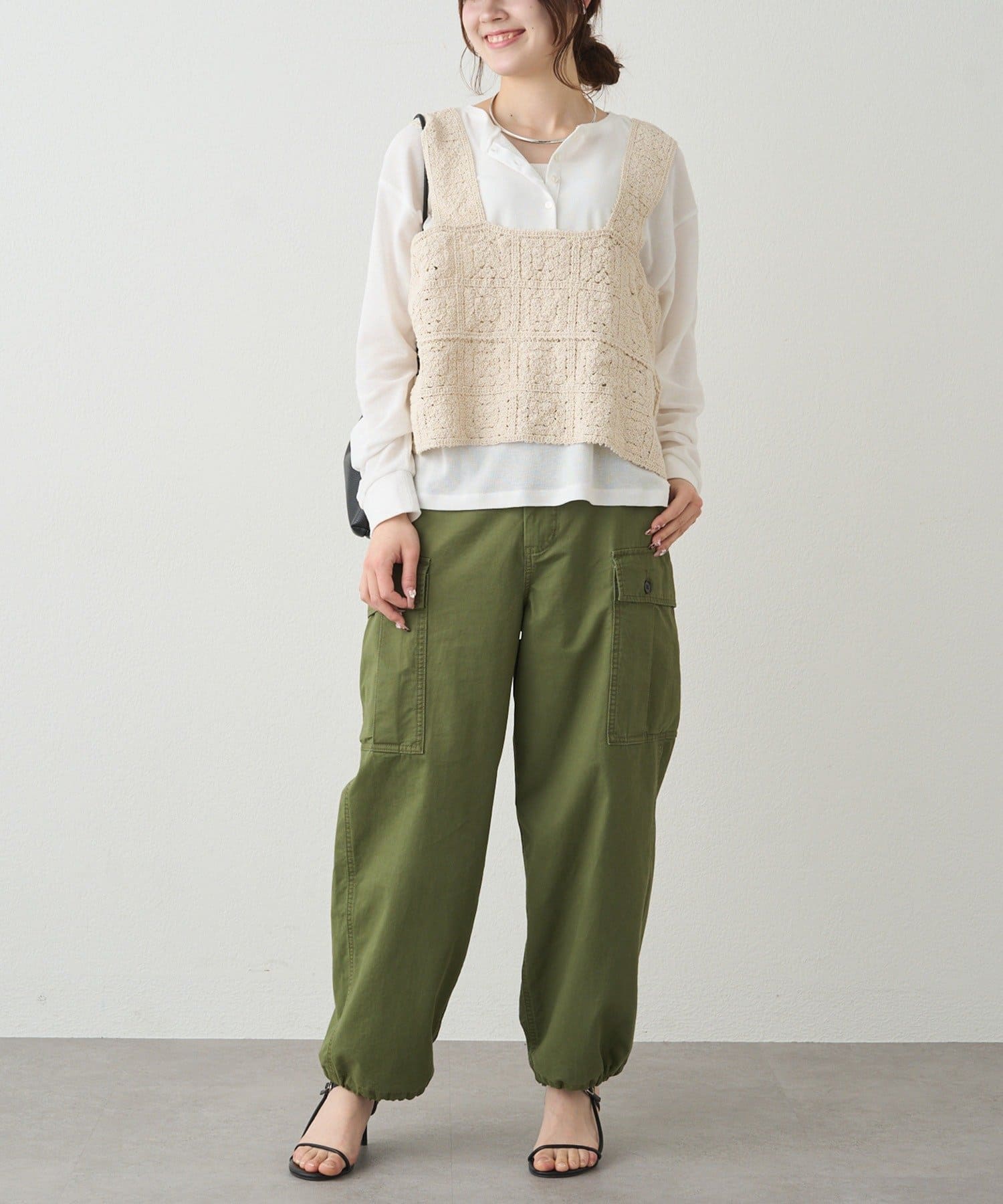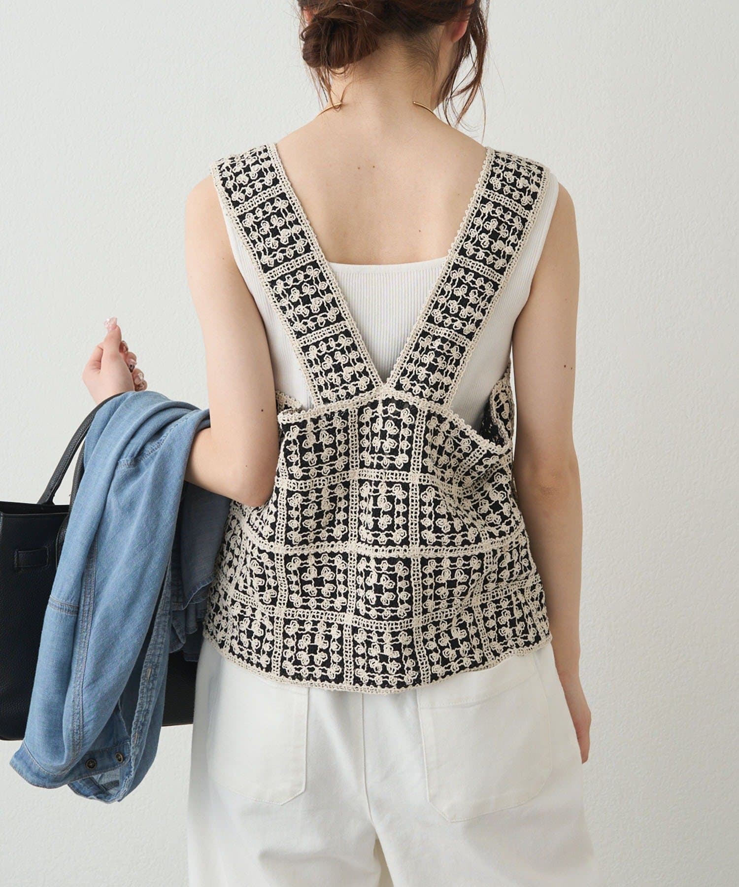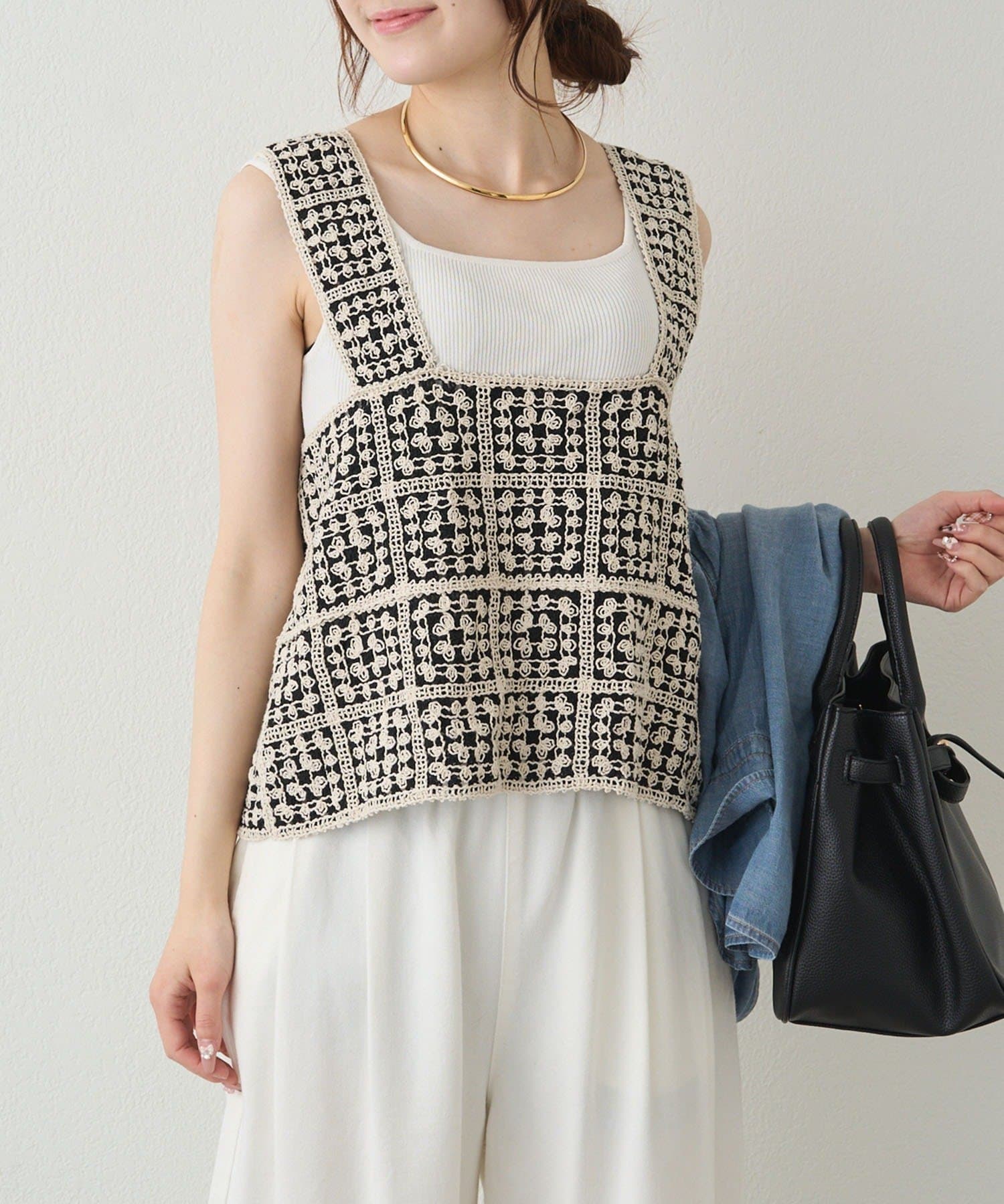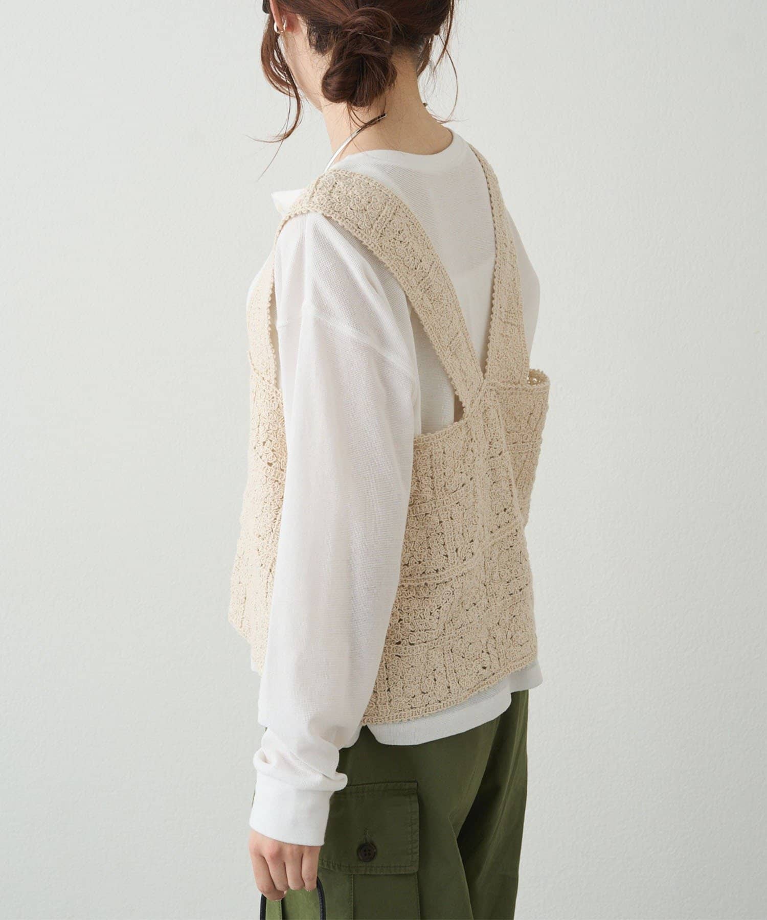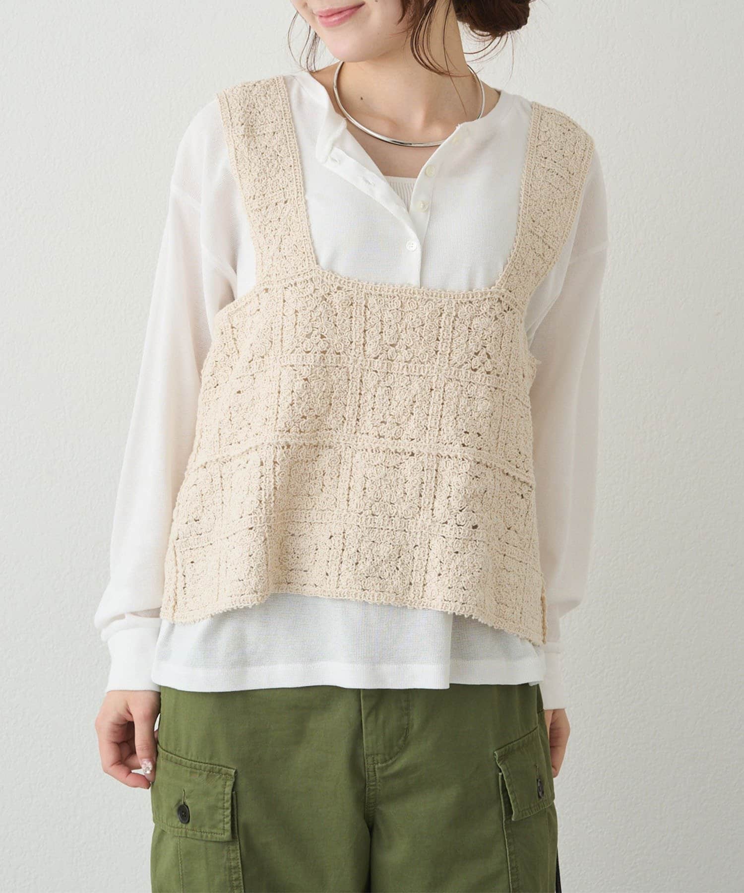 かぎ針編みのような華やかな編地は、Tシャツやブラウスとレイヤードするだけで簡単に抜け感のあるスタイリングが楽しめます。