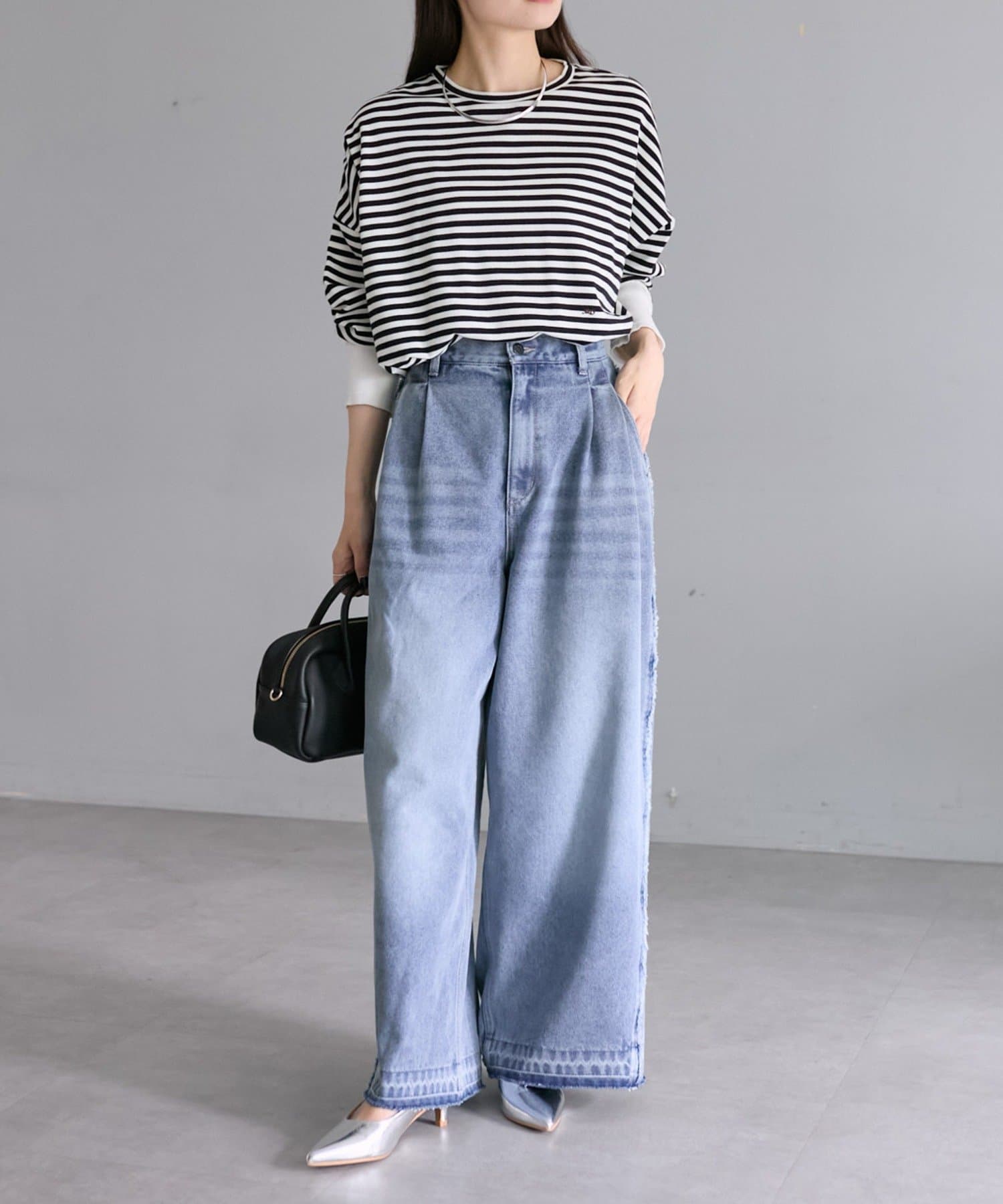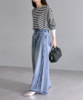 デニムパンツやスラックスを合わせたカジュアルな雰囲気や、すっきりとしたナロースカートなどボトムを選びません。