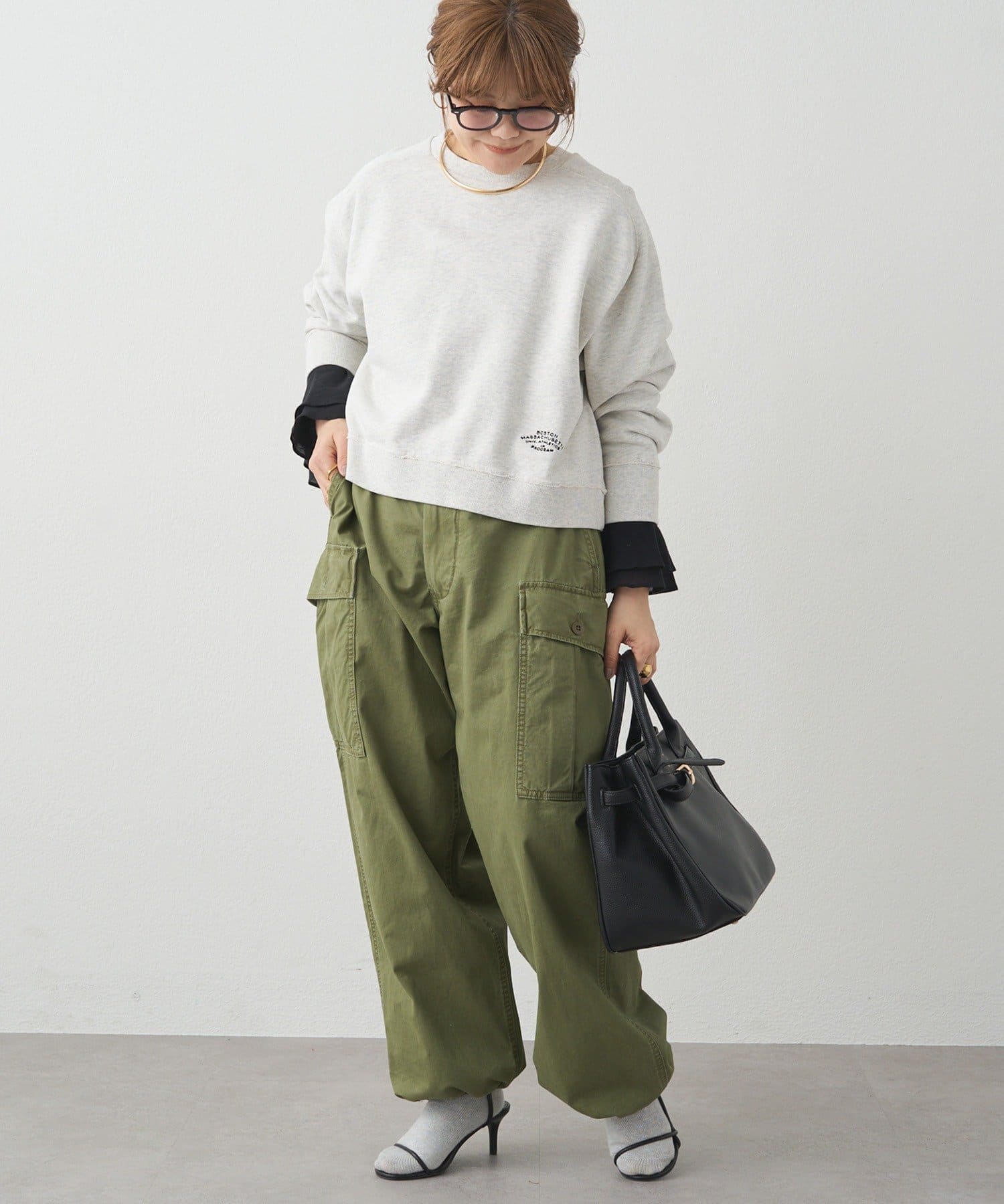 短めな着丈なので、ロンTやブラウスをインして襟元や裾から覗かせるレイヤードコーデも簡単に決まりオススメです。