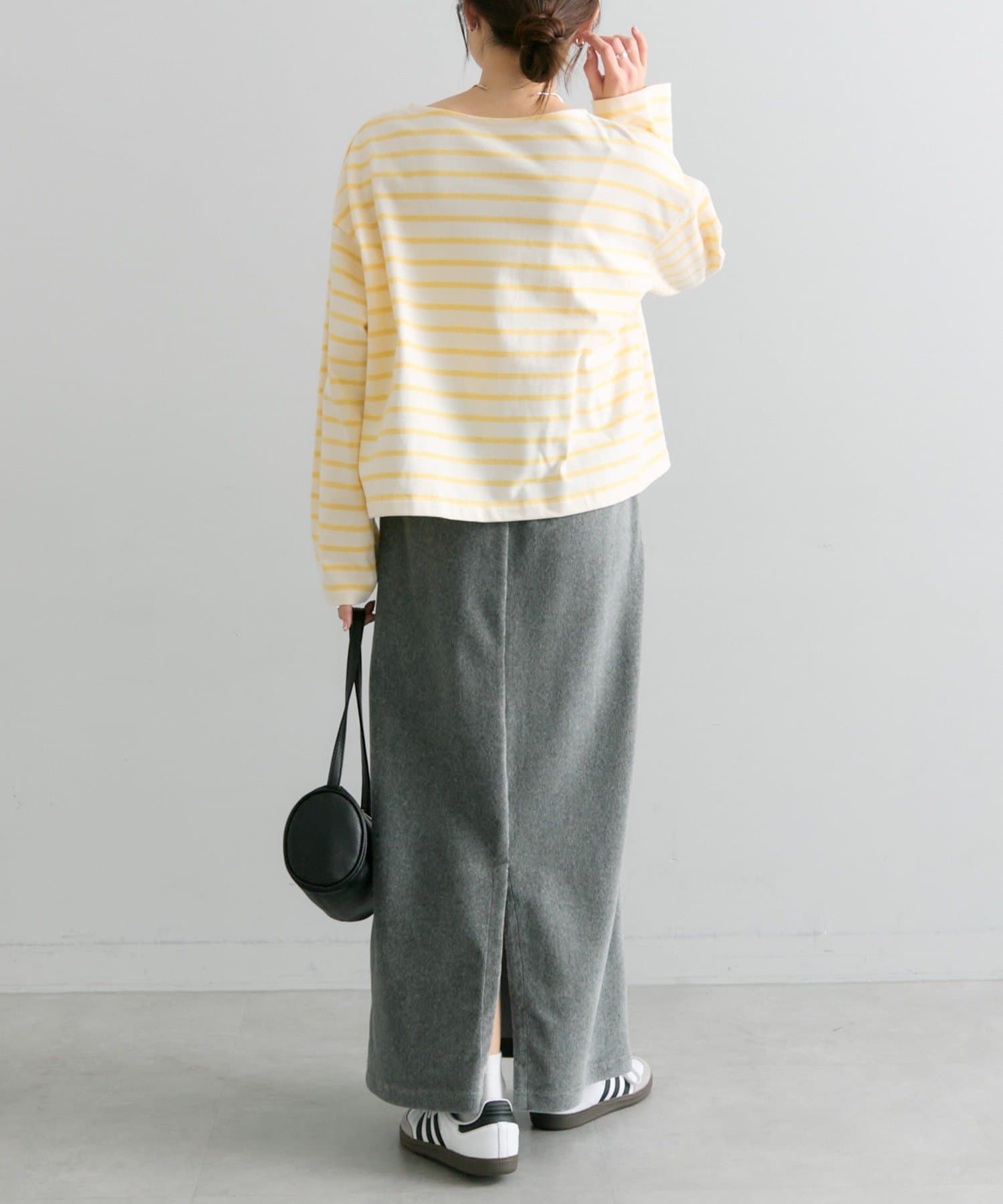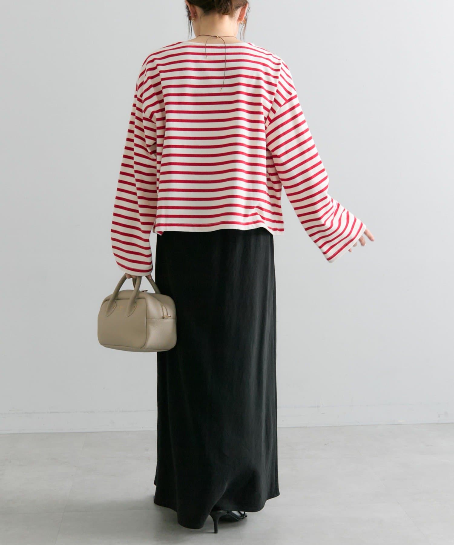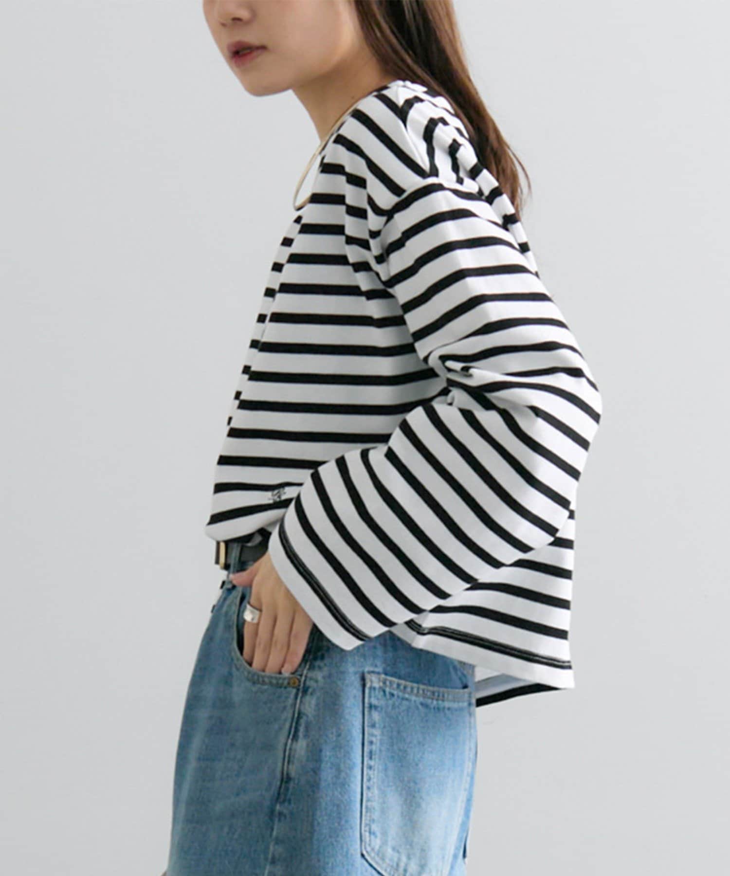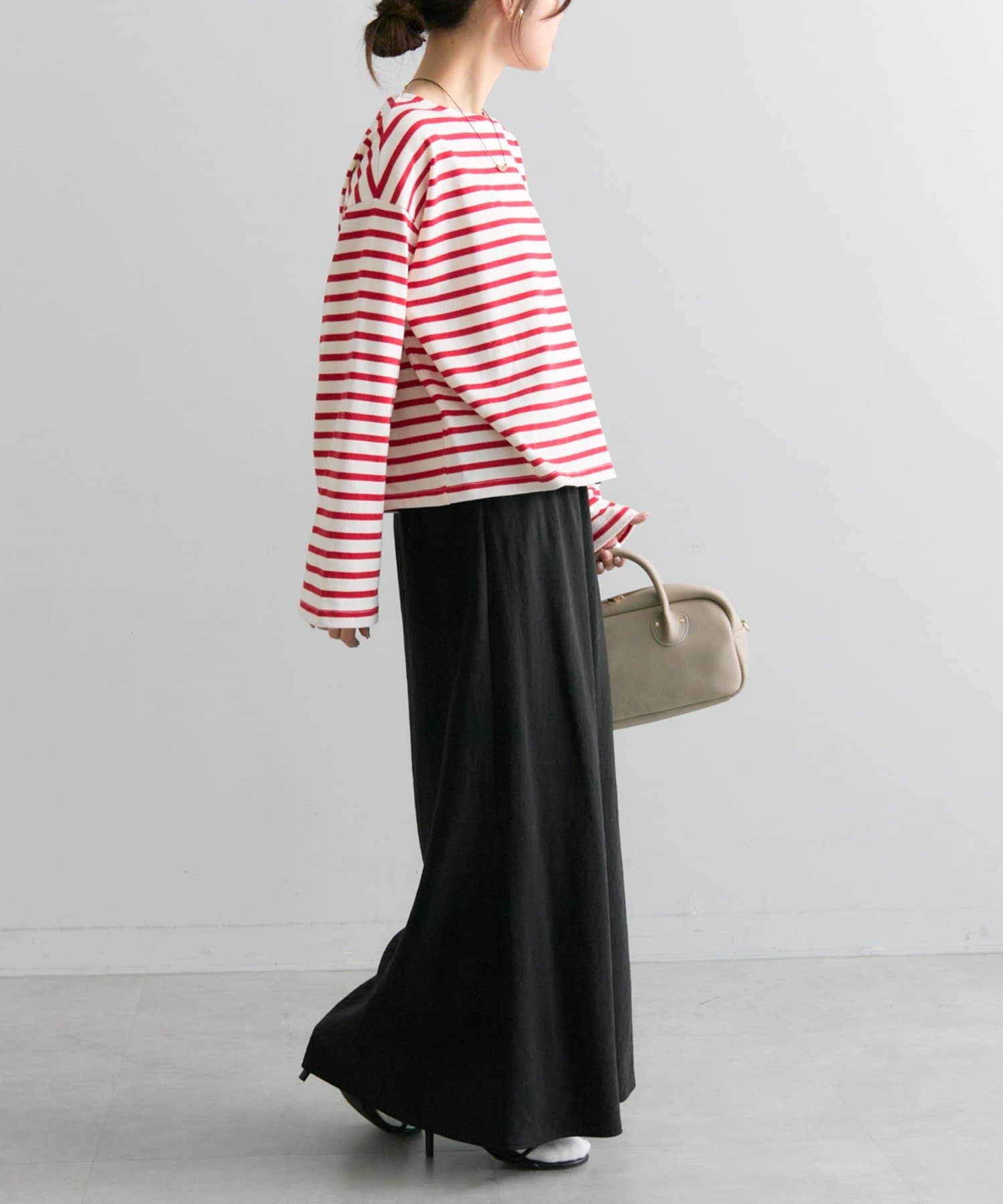 ショート丈のカットソーなので、ボリューム感のあるボトムスとのコーディネートがおすすめです。