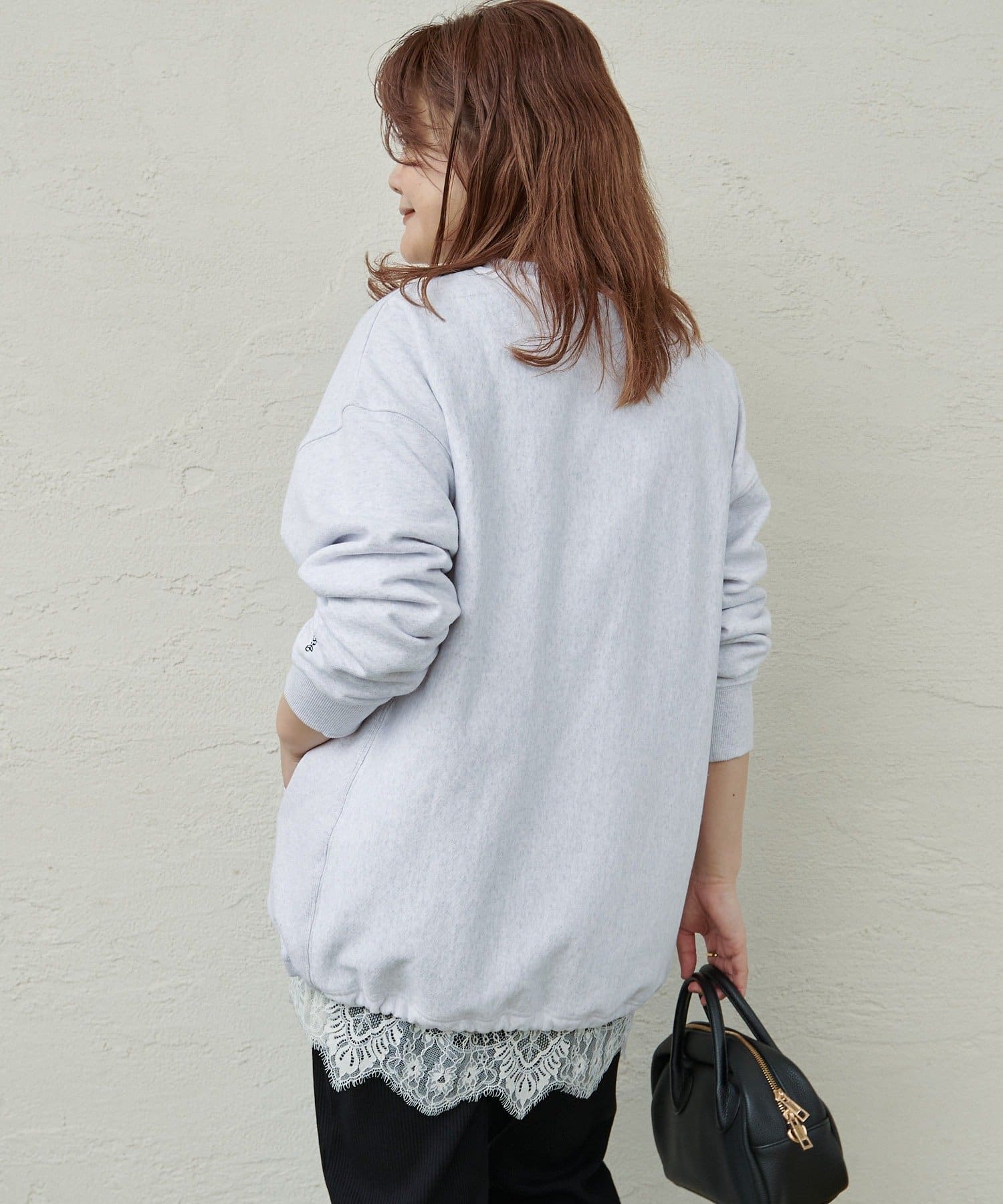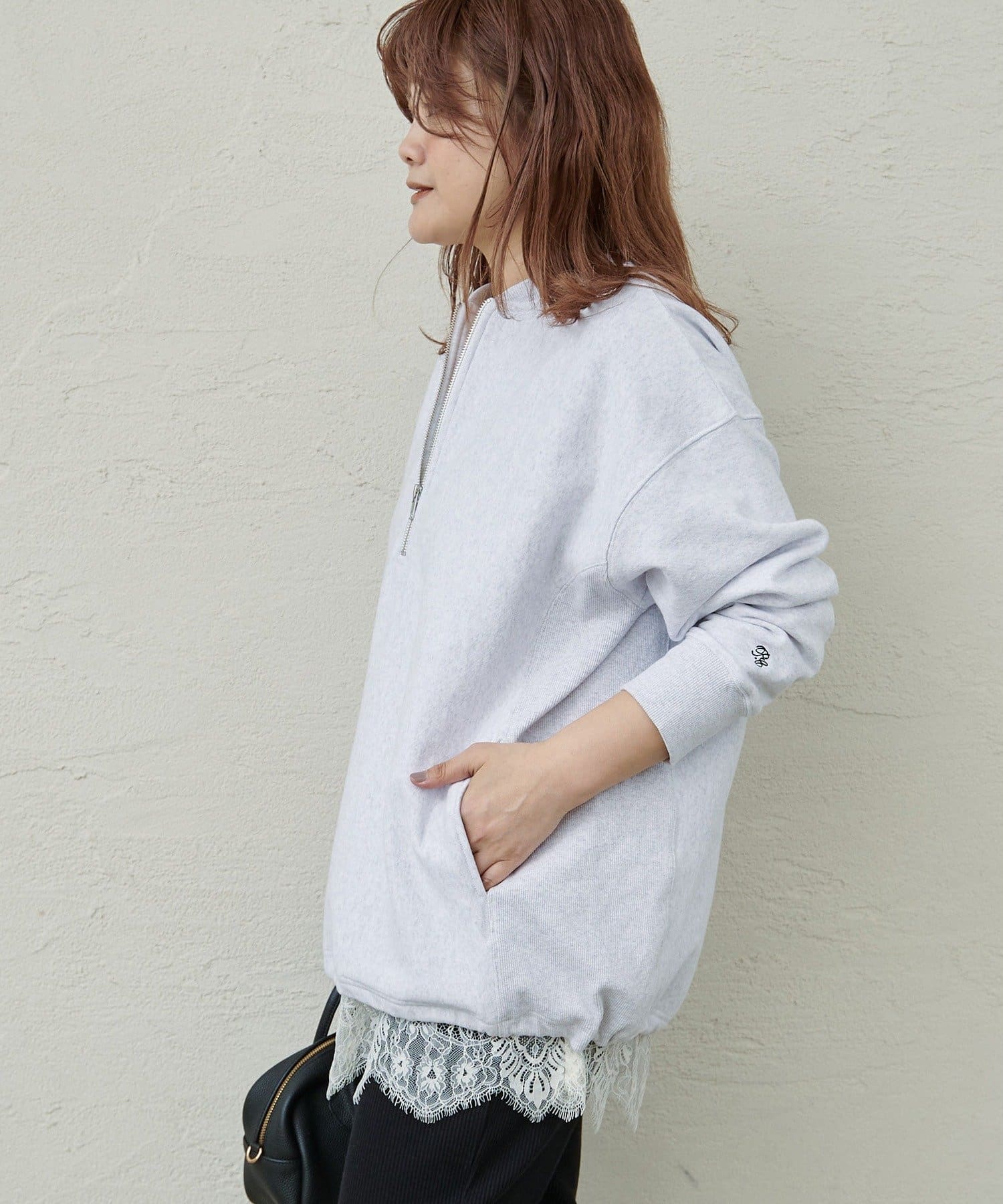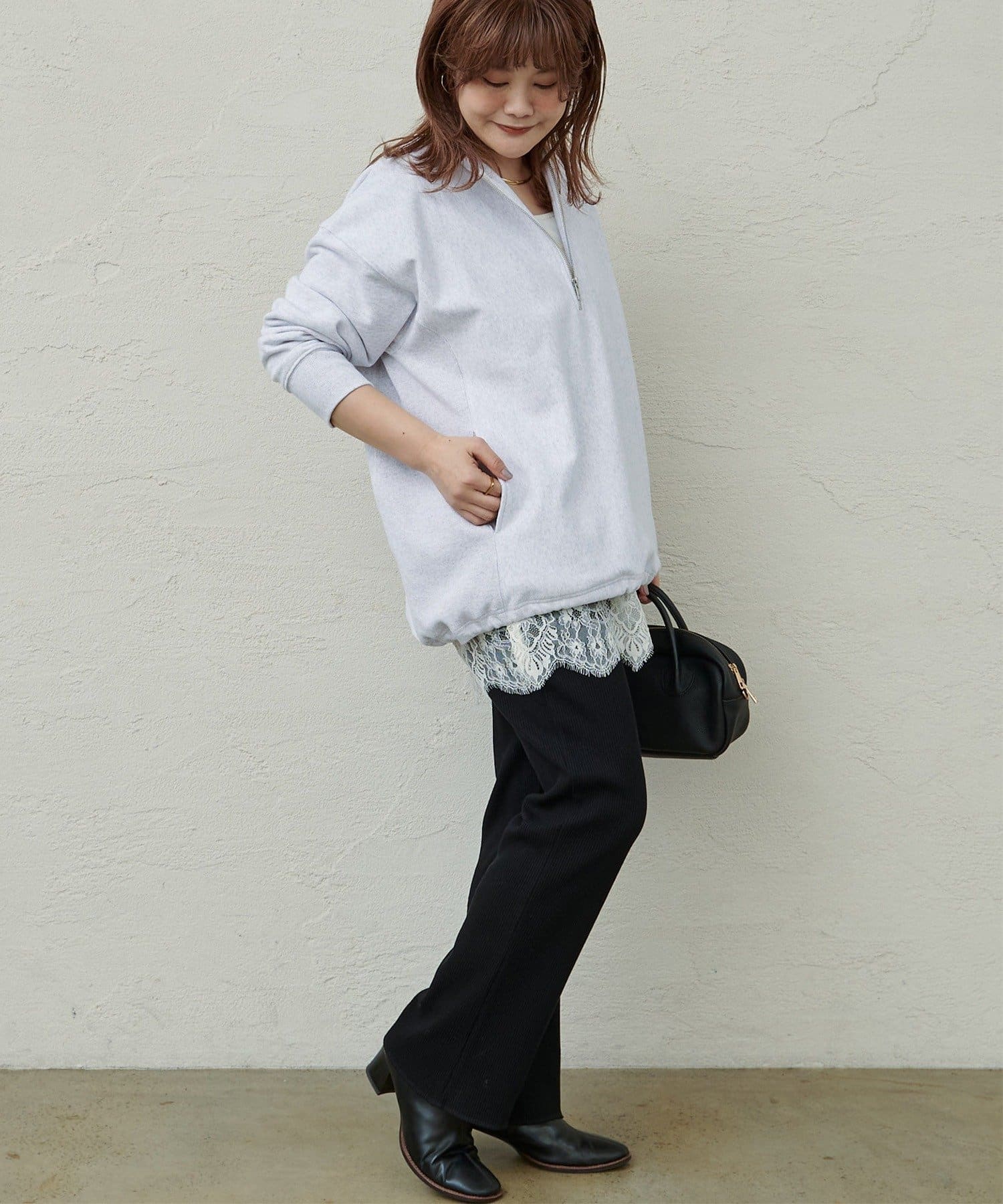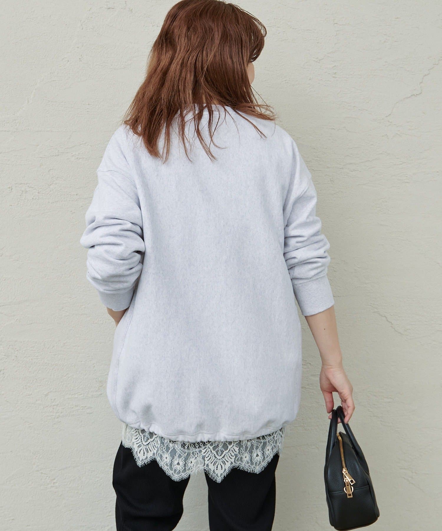 繊細なレースの軽やかさが、カジュアルなスウェットも華やかな雰囲気に。