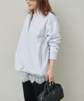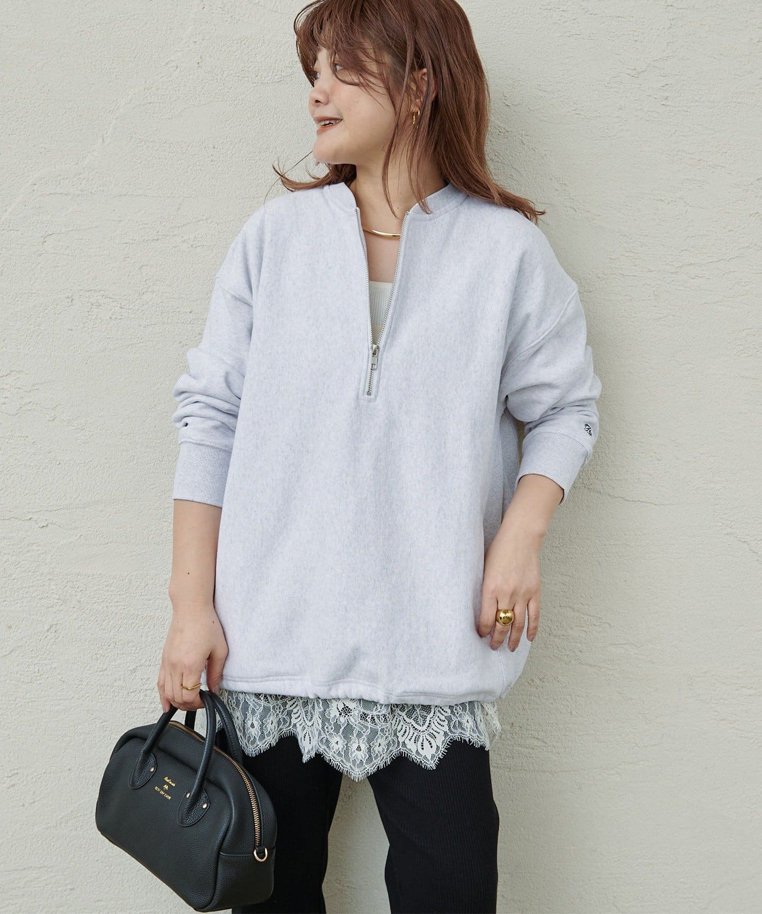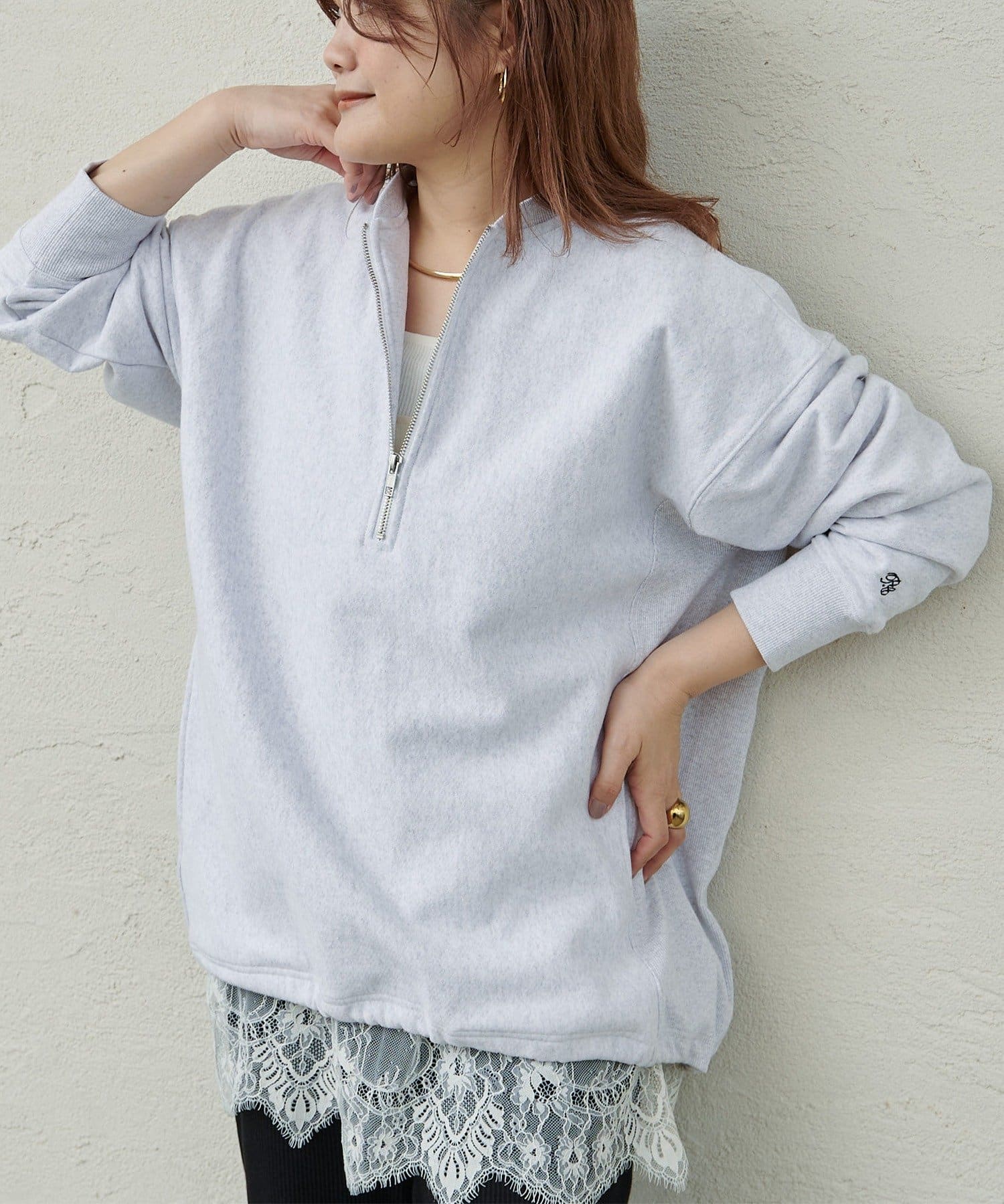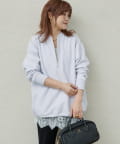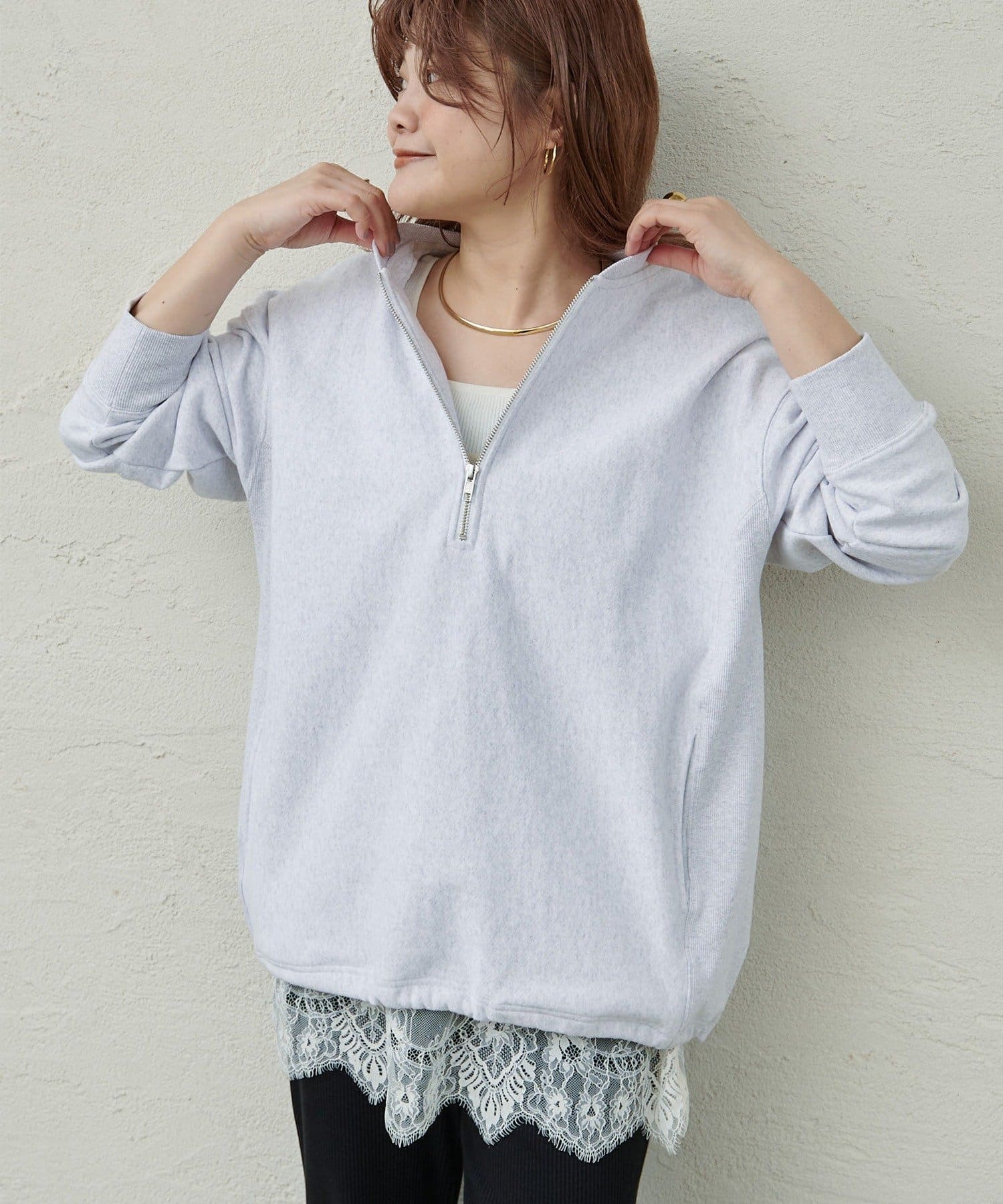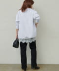 繊細なレースの軽やかさが、カジュアルなスウェットも華やかな雰囲気に。