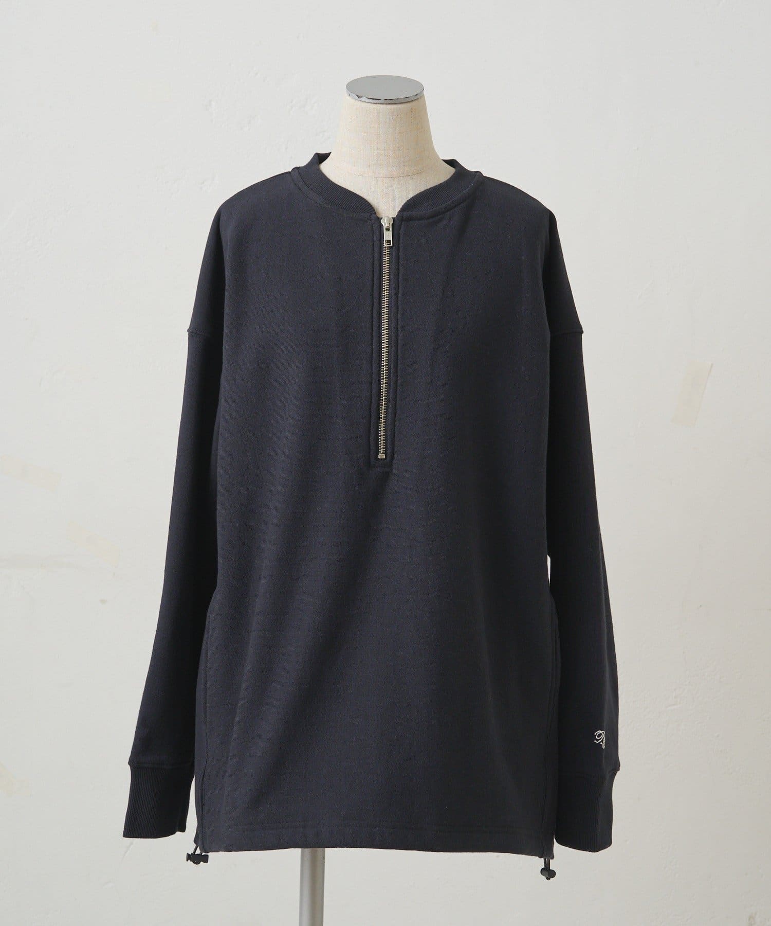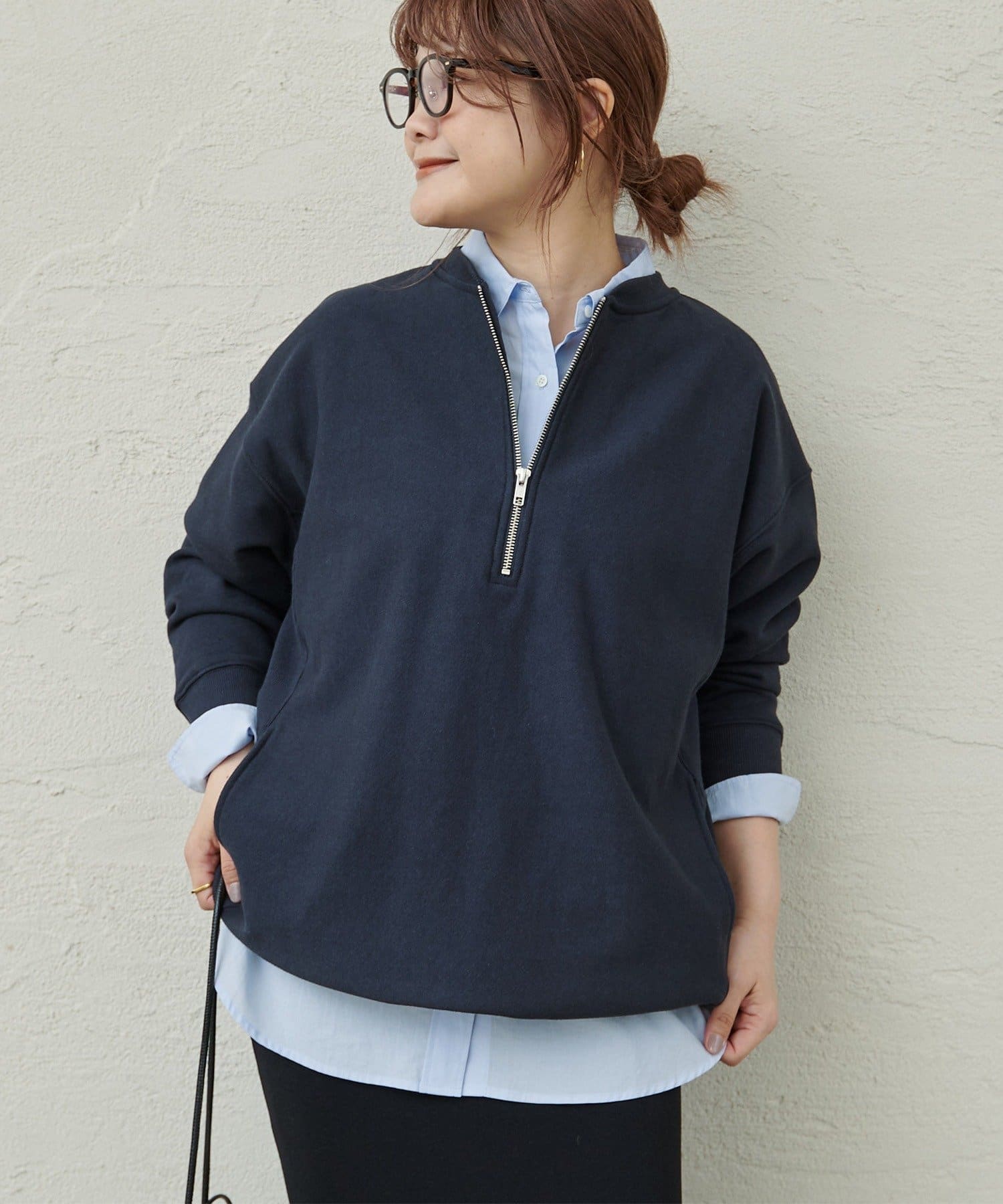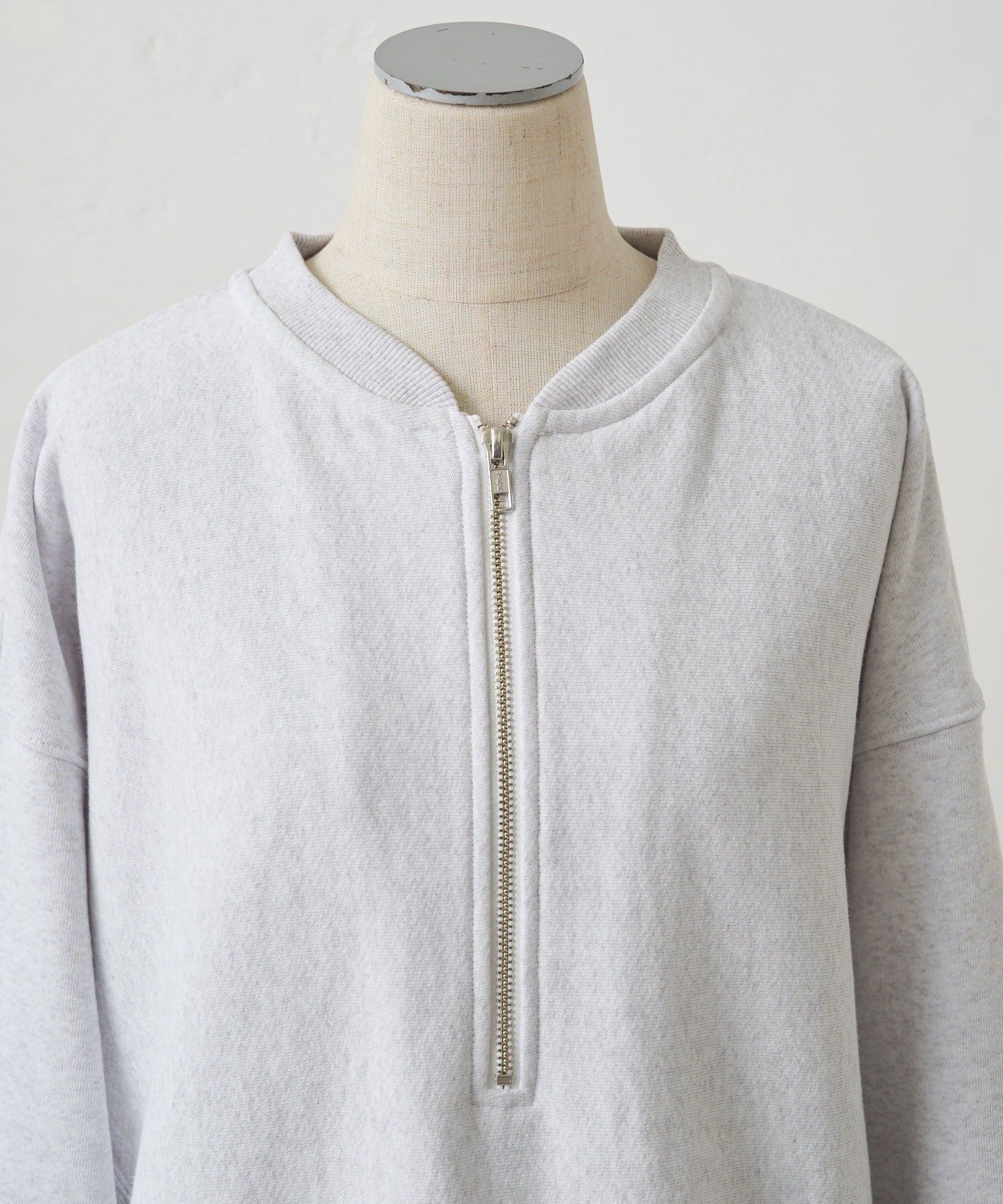 フロントのハーフジップが目を惹き、自然と抜け感を演出できるポイントに。