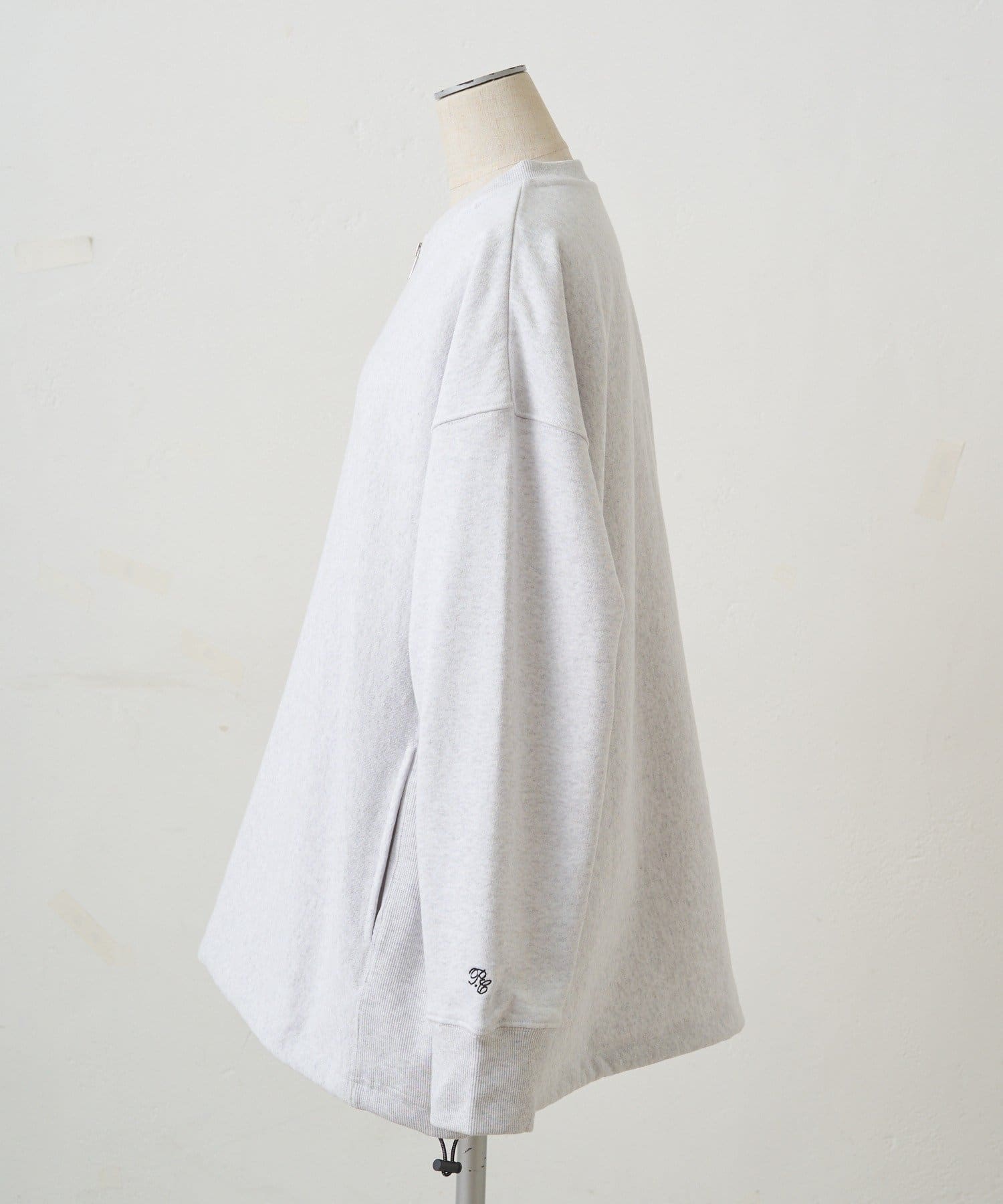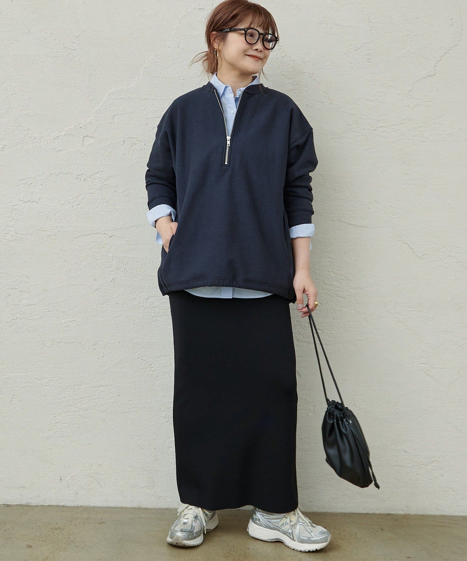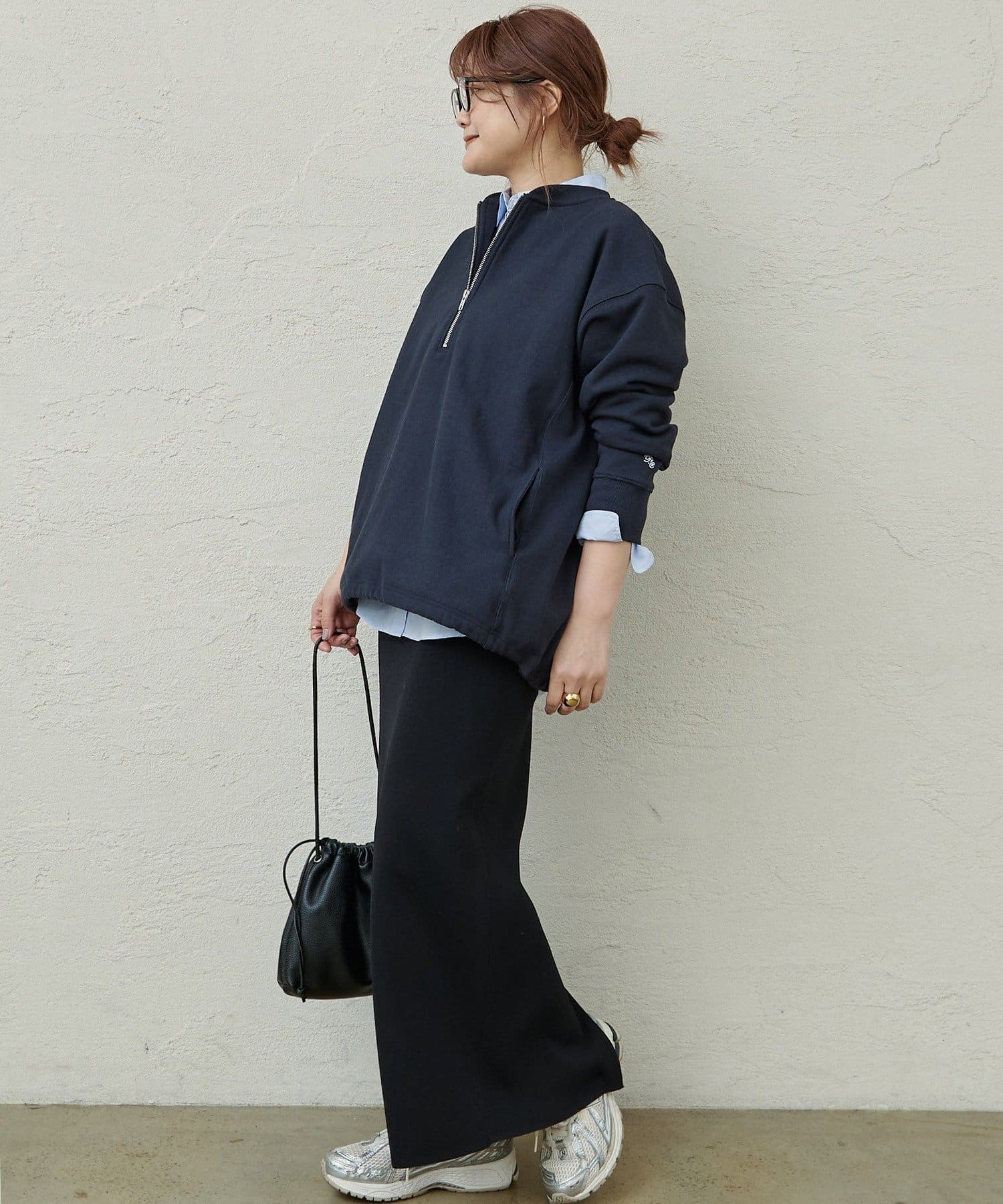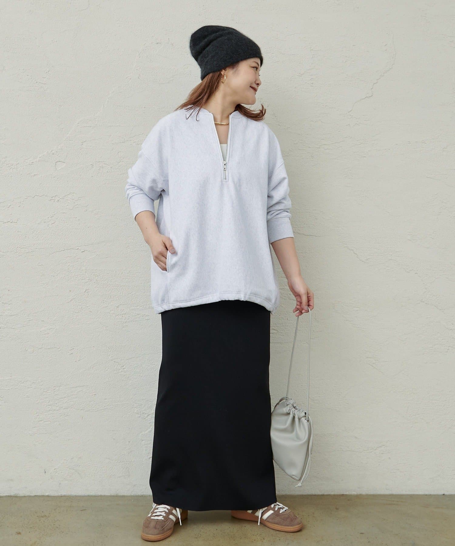 フロントのハーフジップが目を惹き、自然と抜け感を演出できるポイントに。