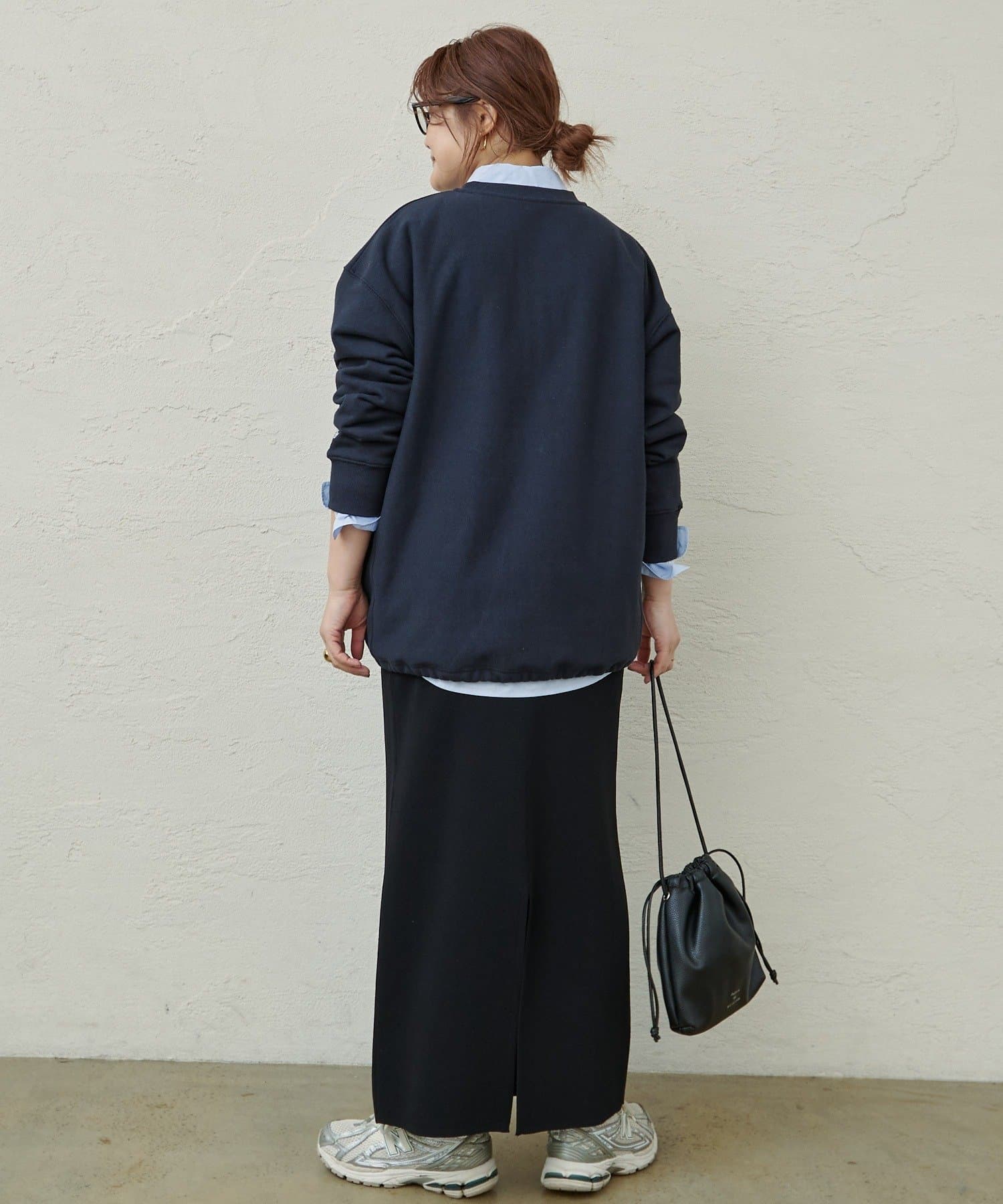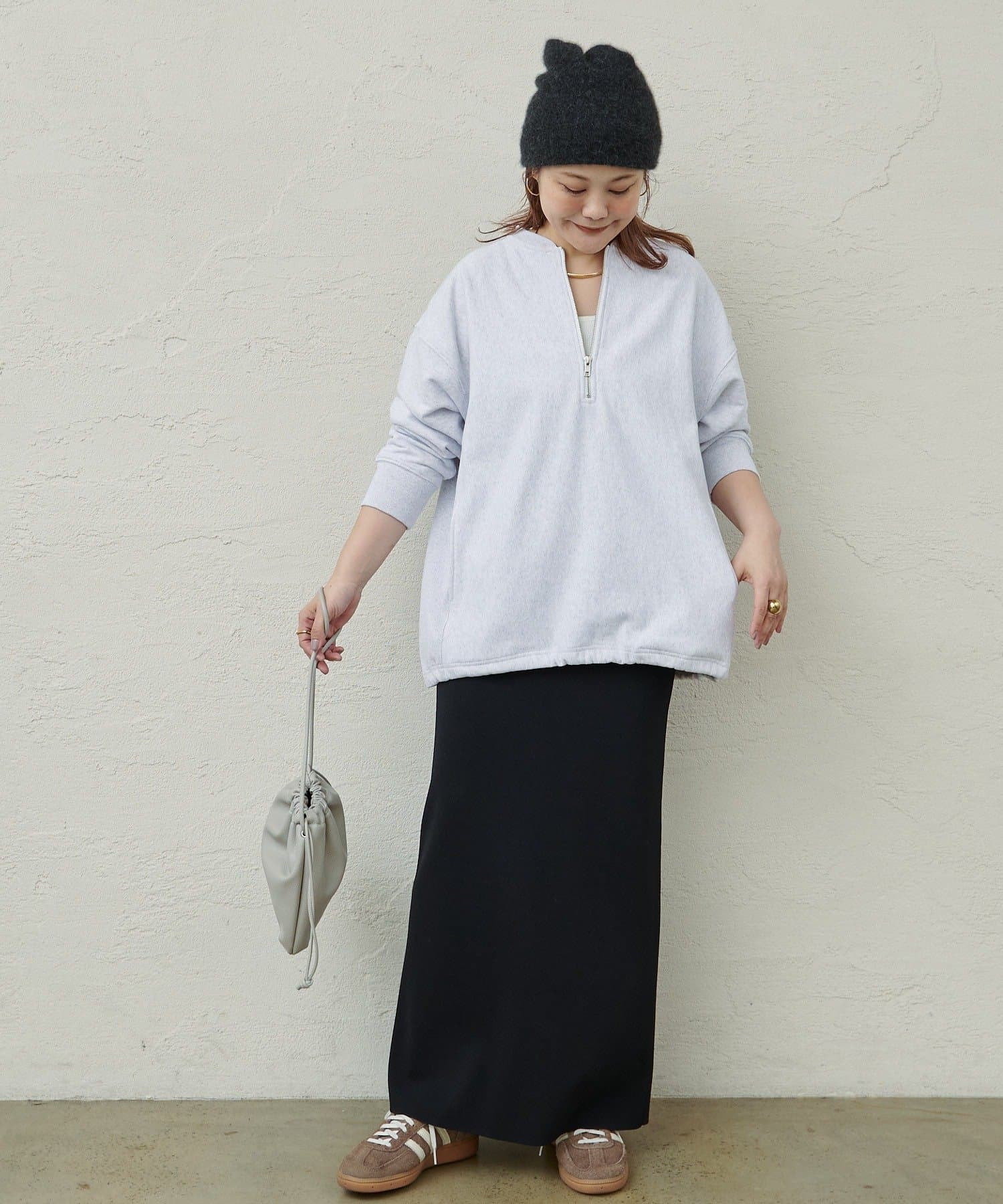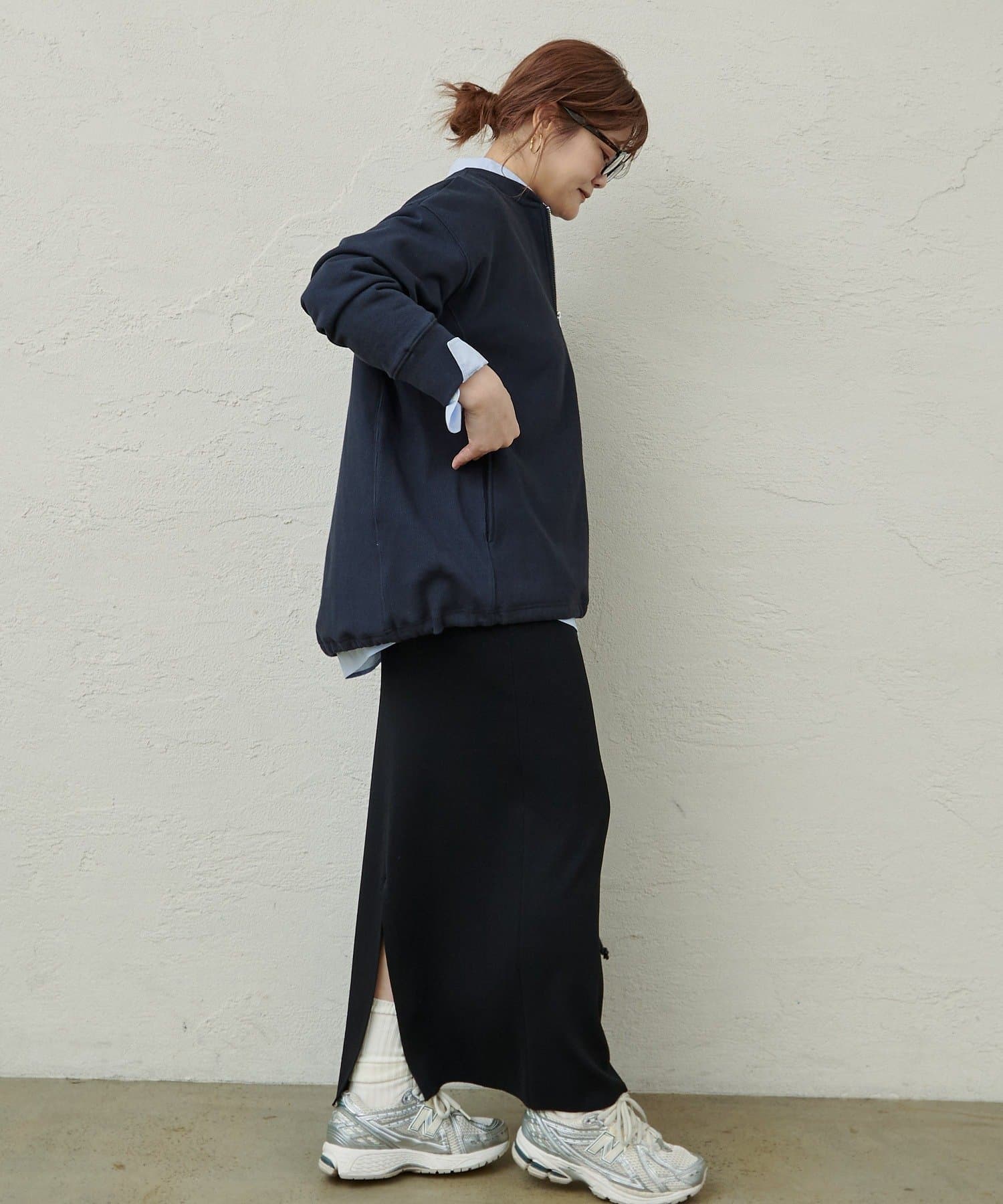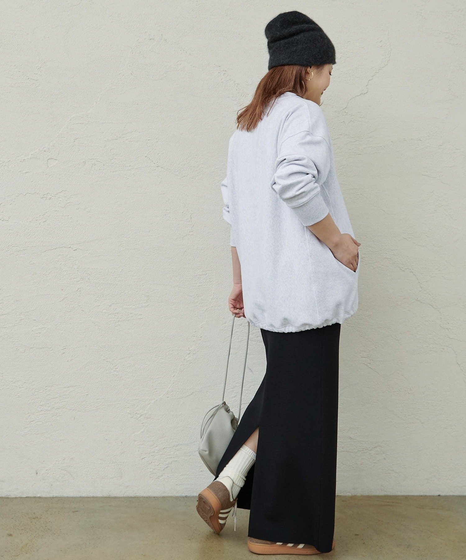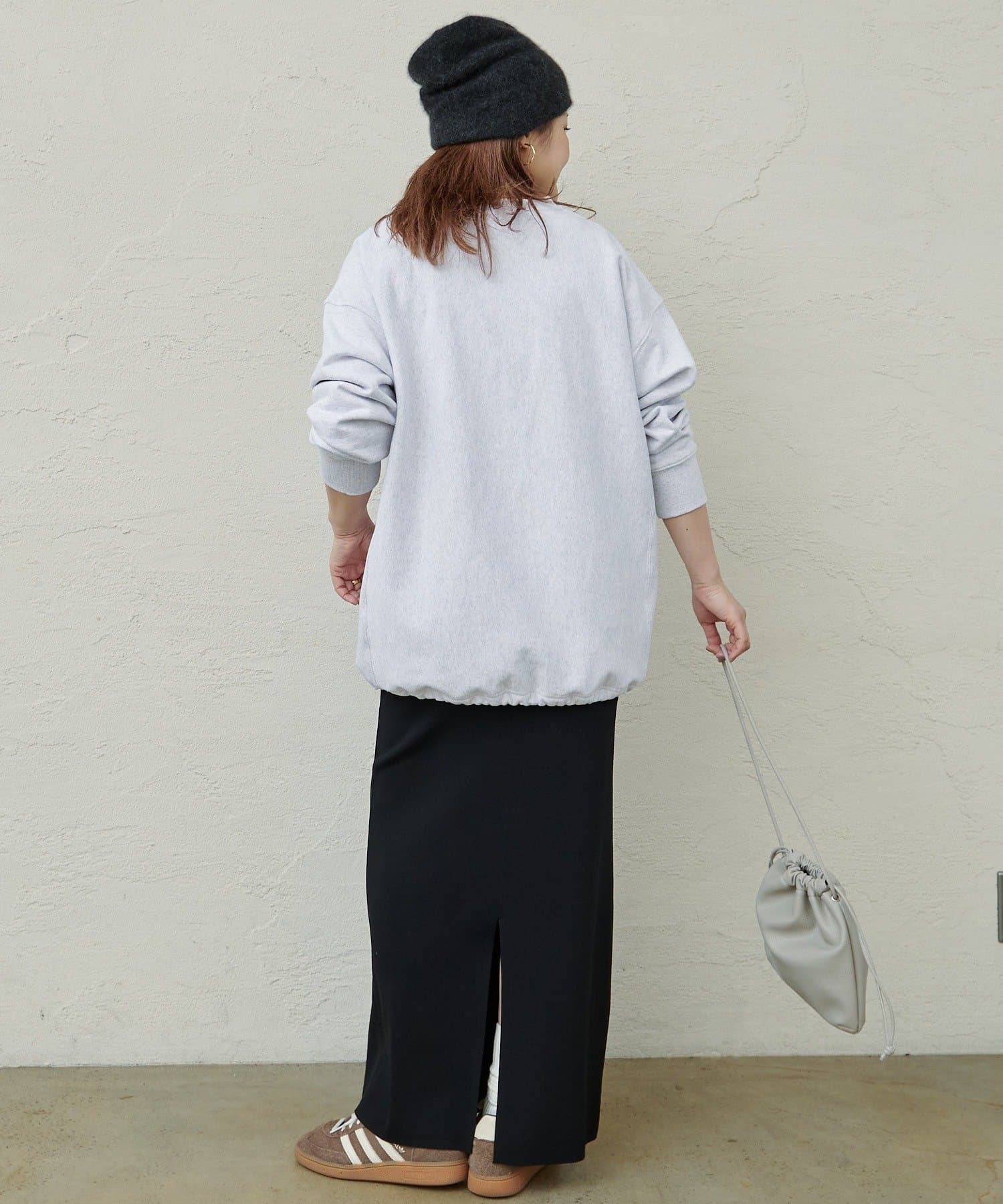スウェットの裾を絞り短めの丈にするとバランスの取れたスタイリングにまとまります。