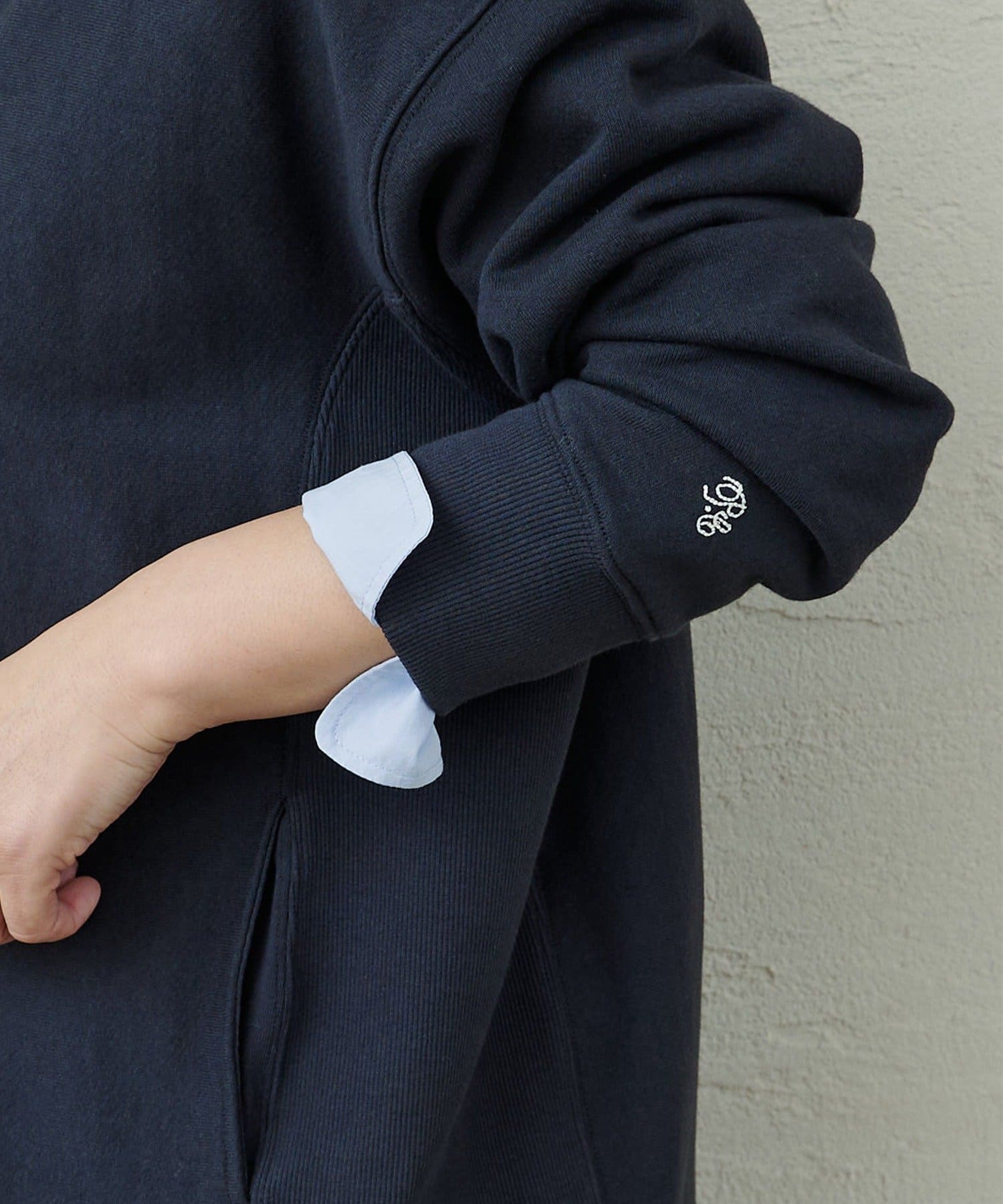 ドローコードは配色をチョイスし、袖元にはさりげなくチェーンステッチのロゴ刺繍を入れ、