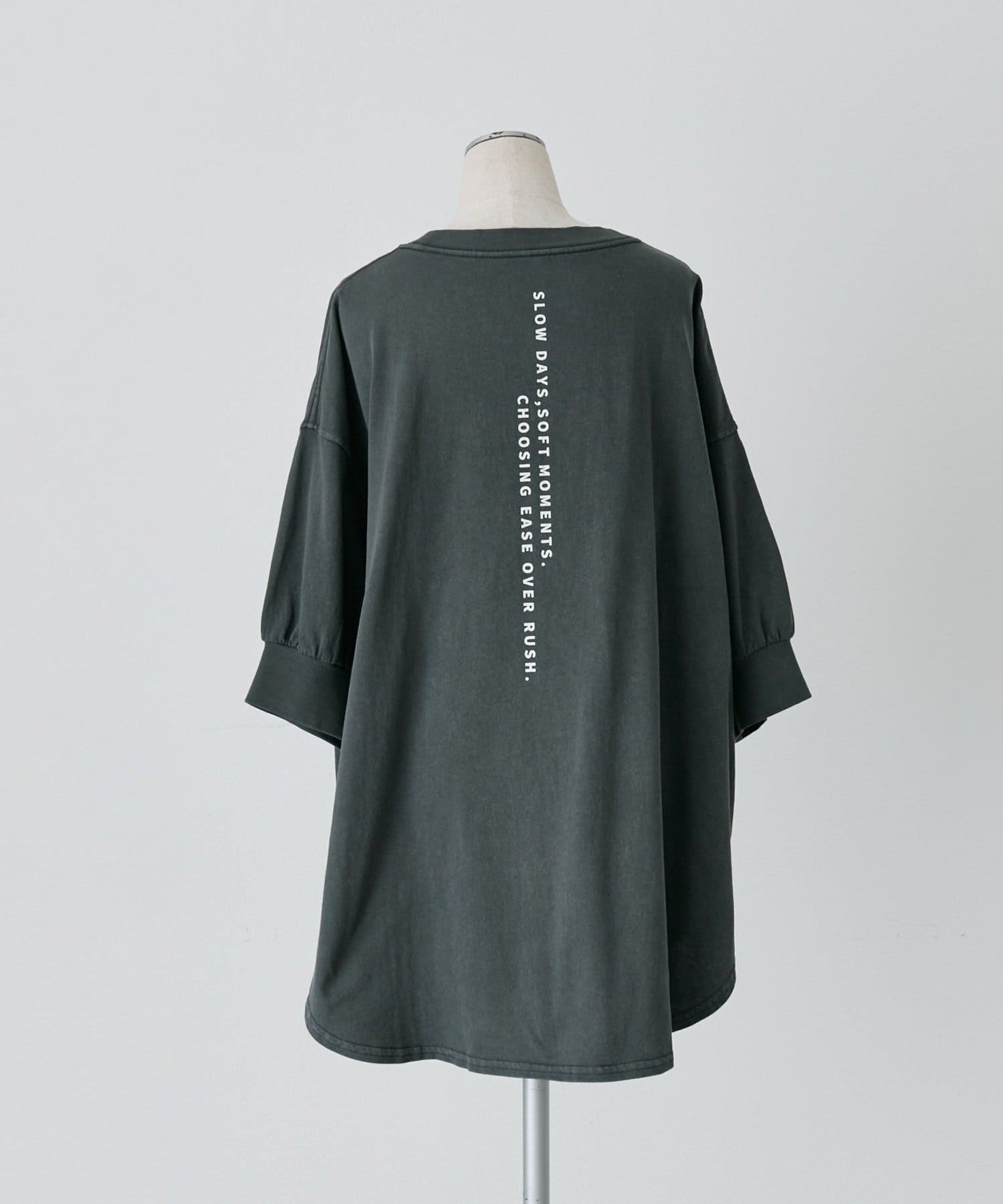 ドロップショルダーから伸びる袖口はゆとりを持たせたサイジングでラフな着心地。