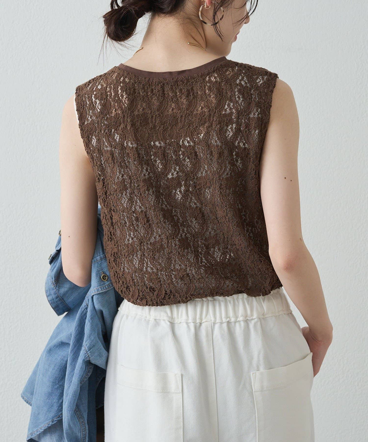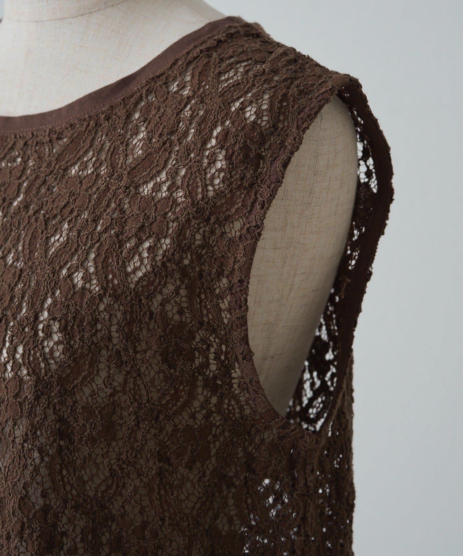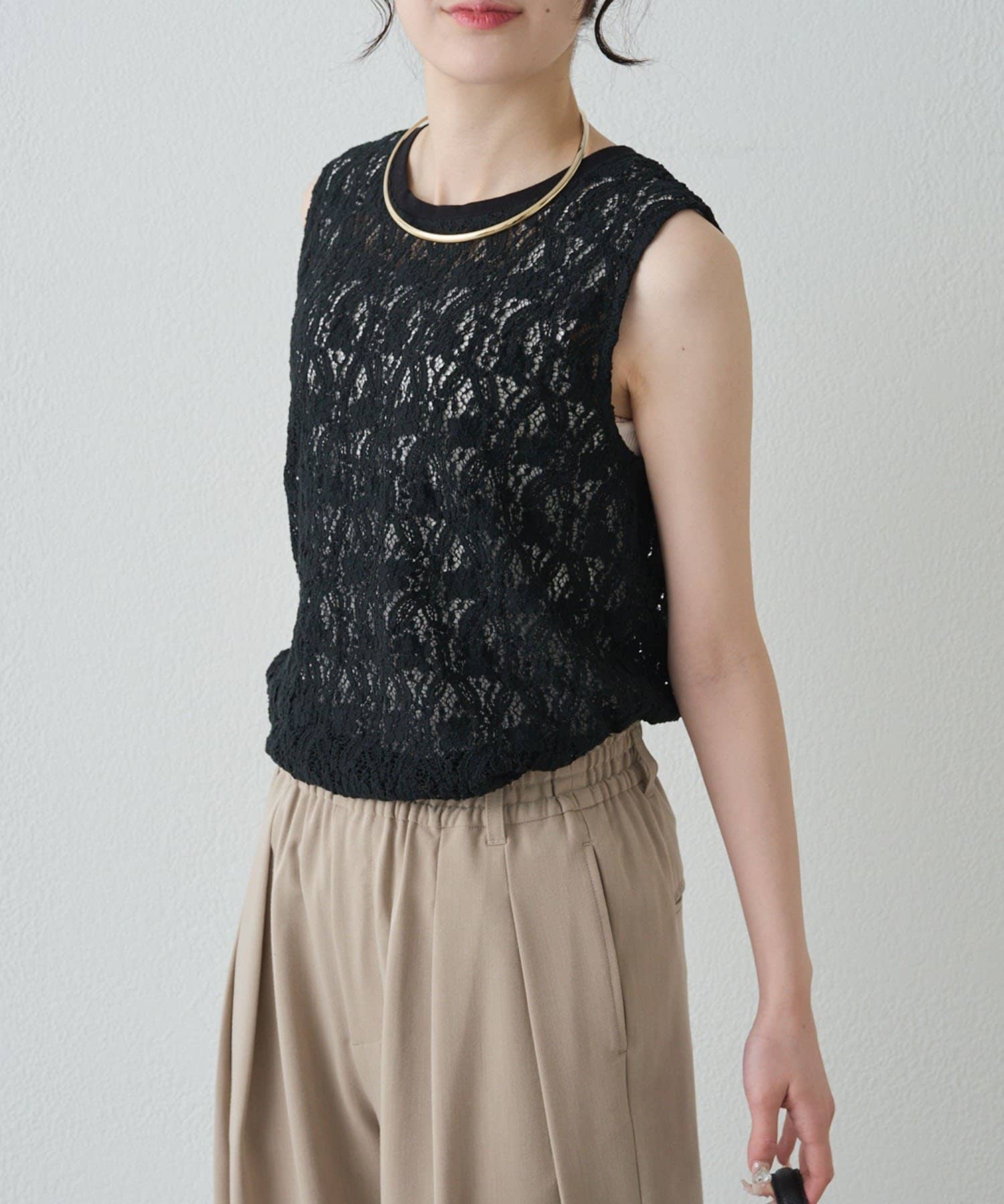 華やかなレースを贅沢に使用した、着映えするノースリーブレーストップス。