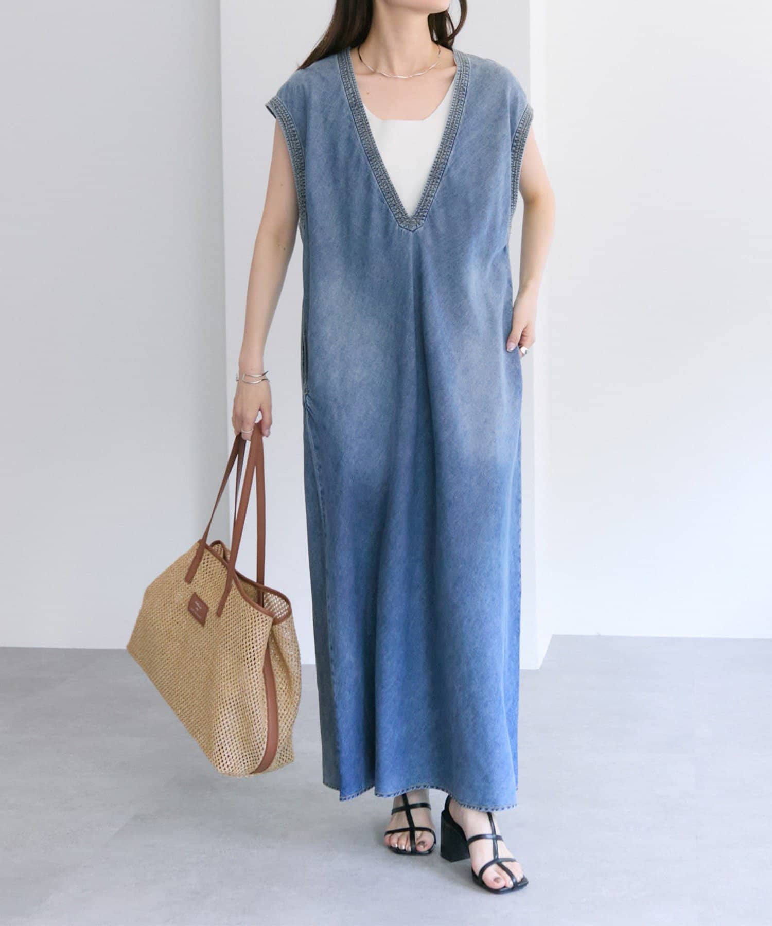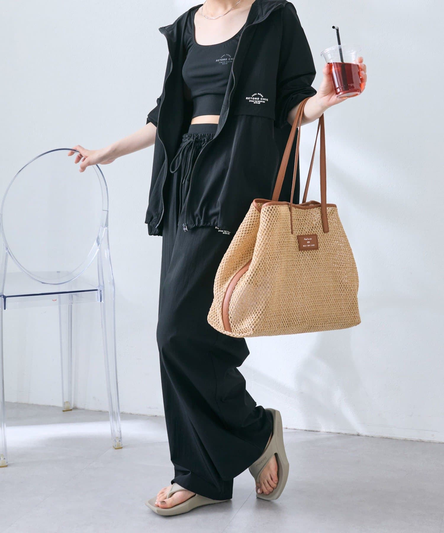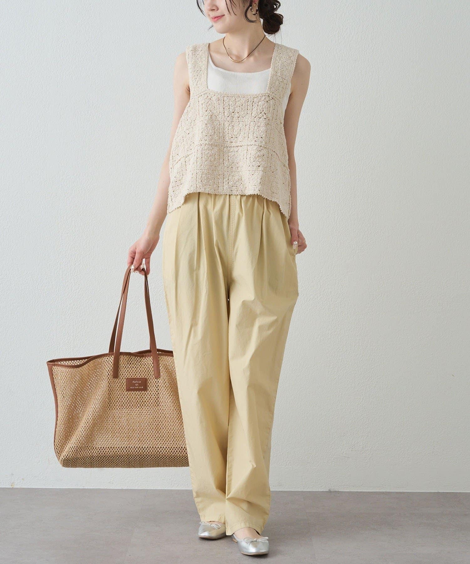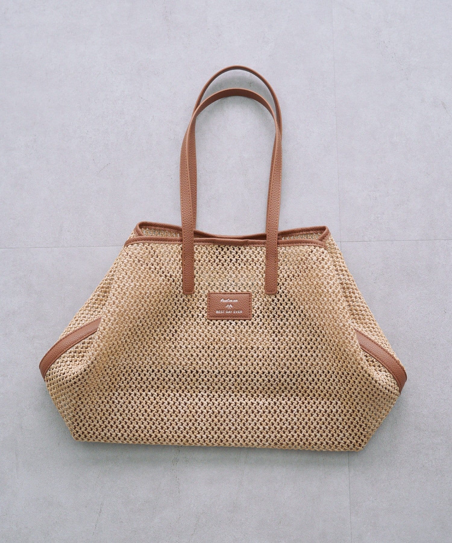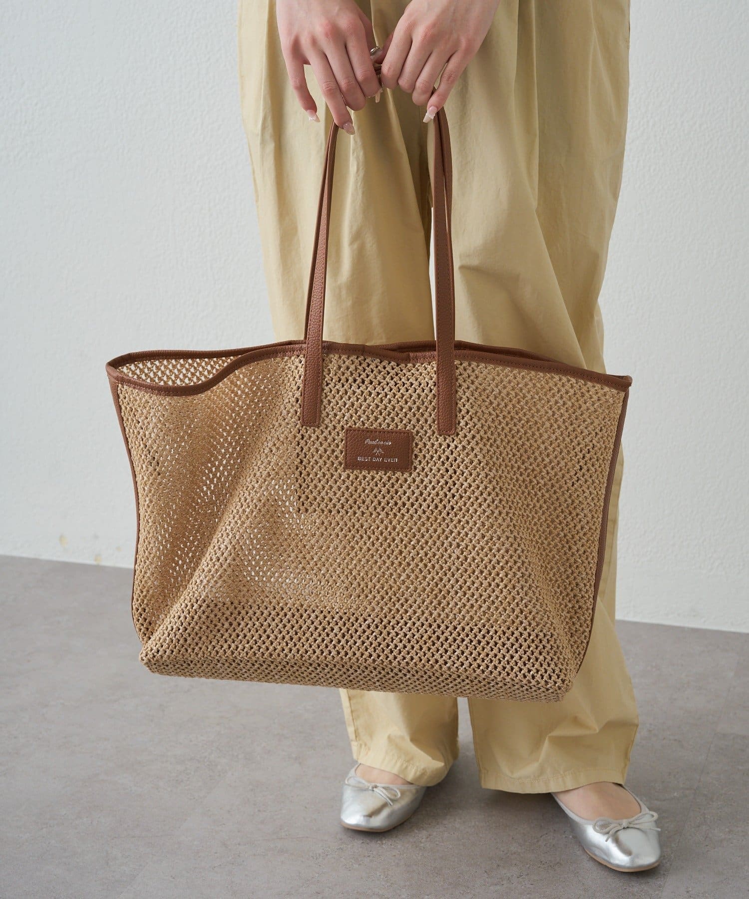 春夏シーズンにピッタリの涼し気な雑材トートバッグ。