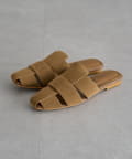 太目ベルトを編み込んで足の甲を包み込むグルカデザインのミュールサンダル。