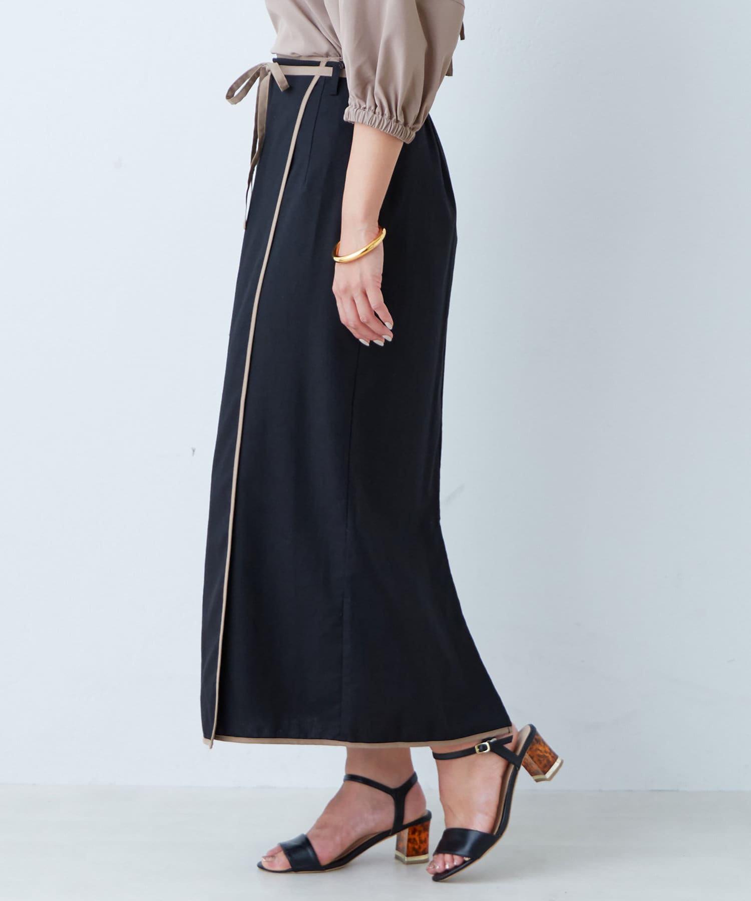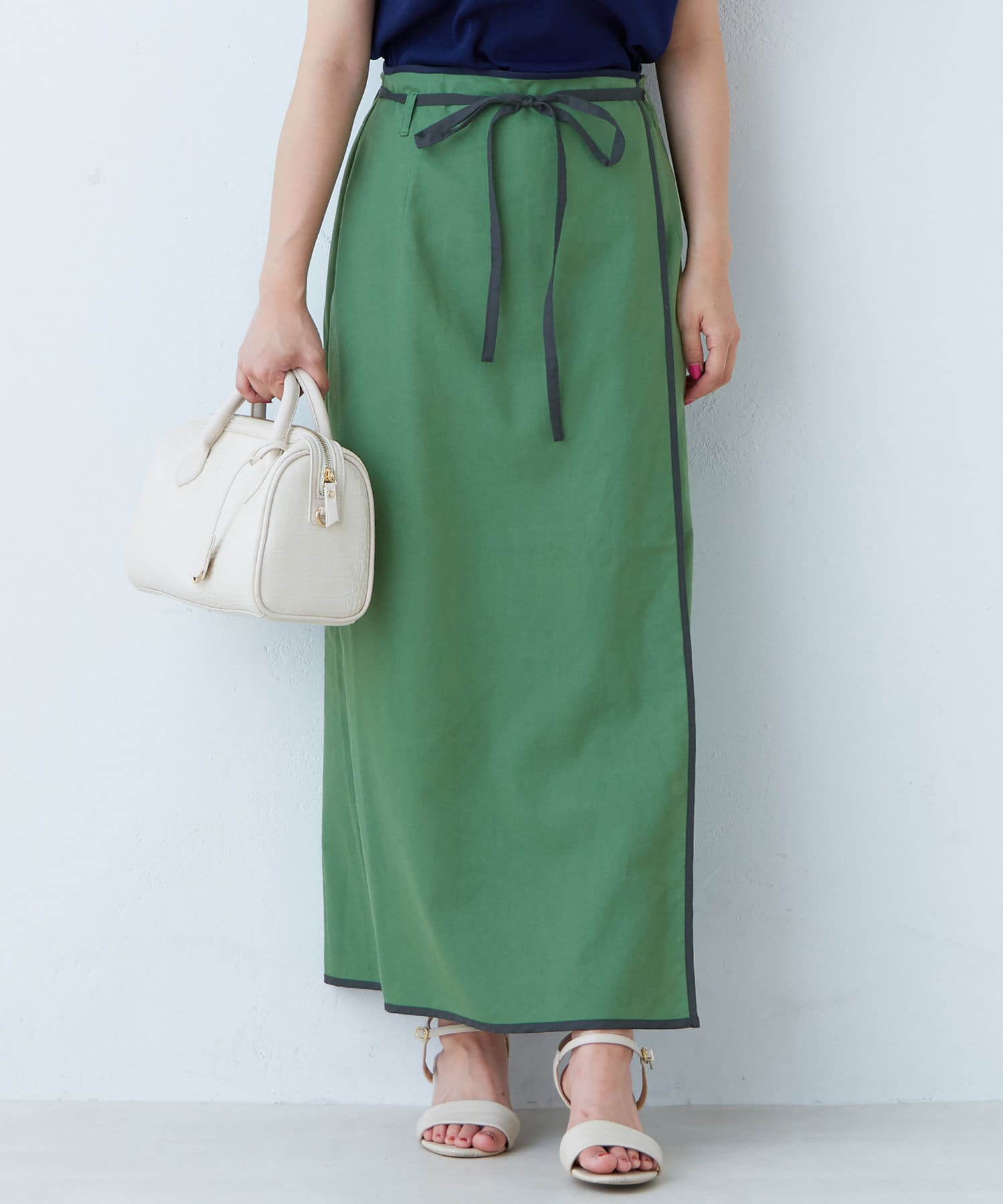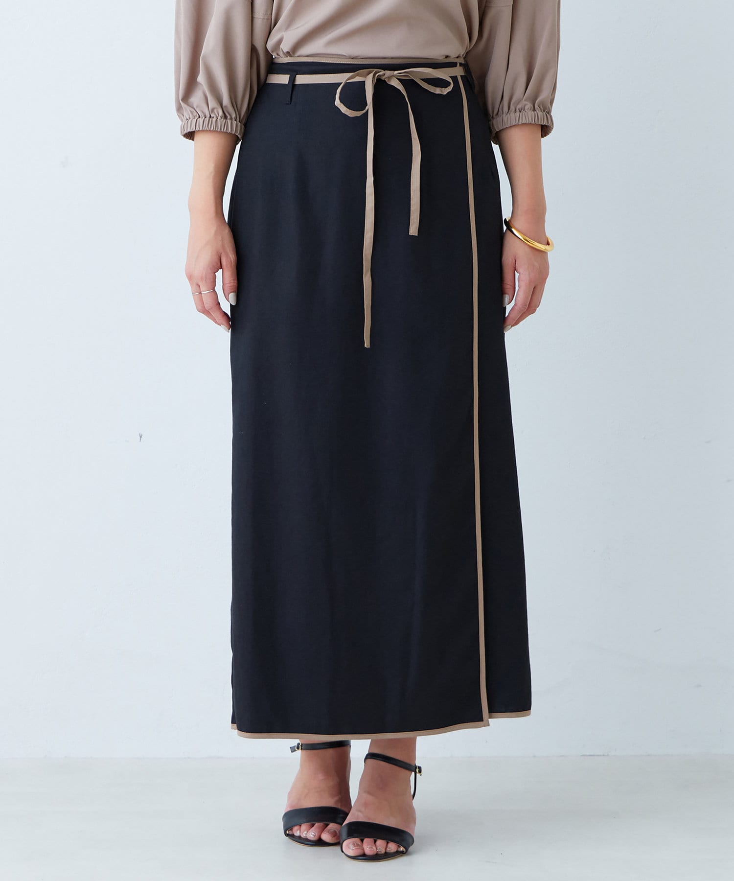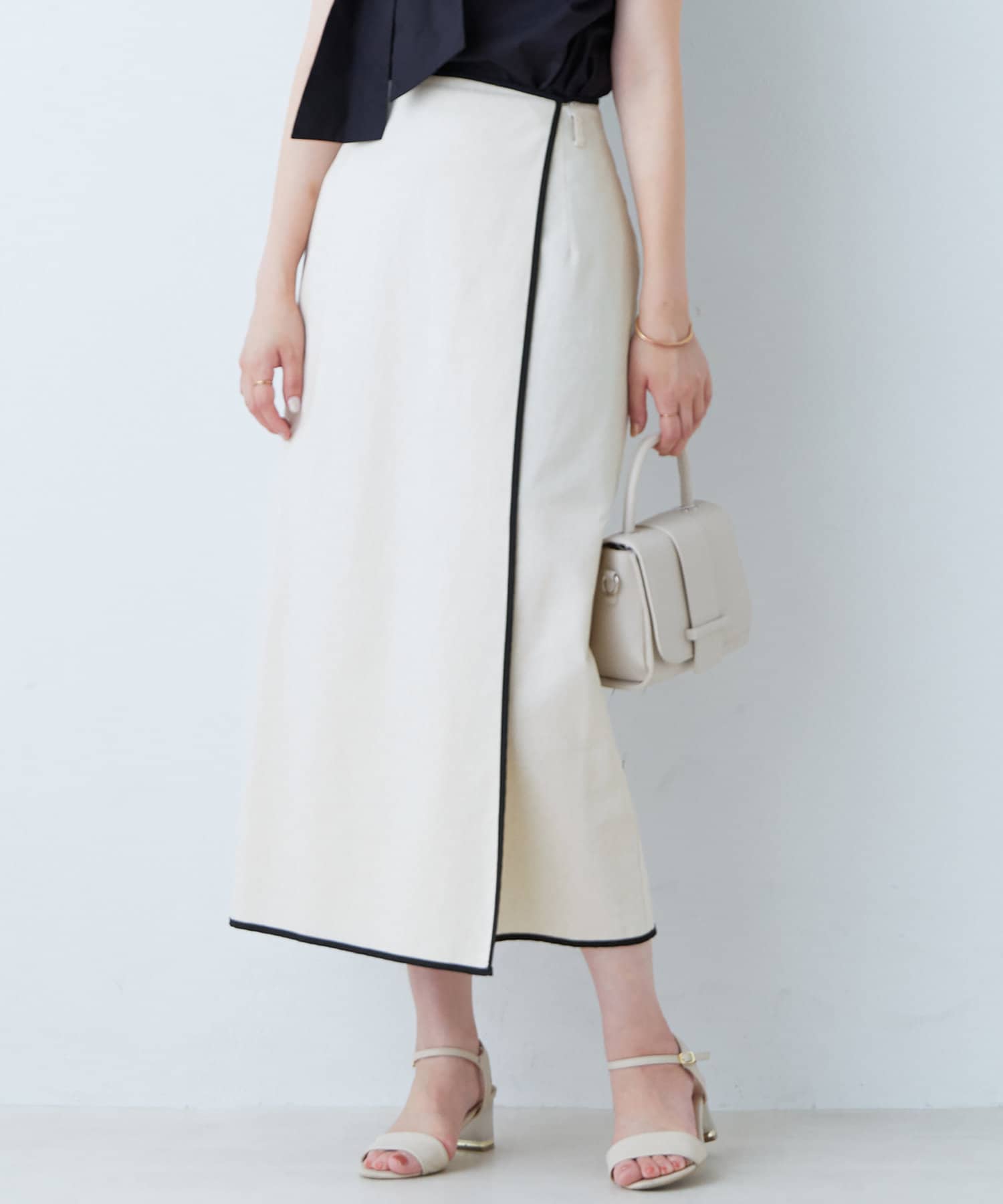 シンプルながらも配色パイピングデザインが目を惹くラップ風スカート。