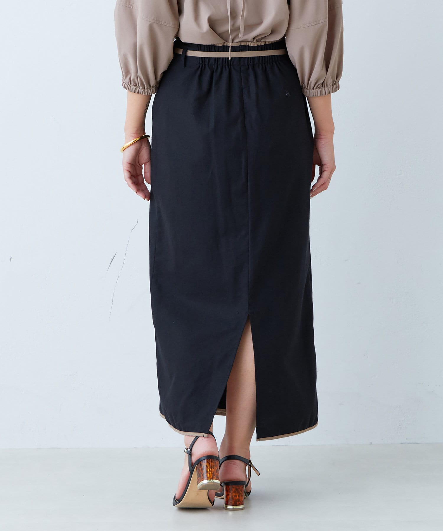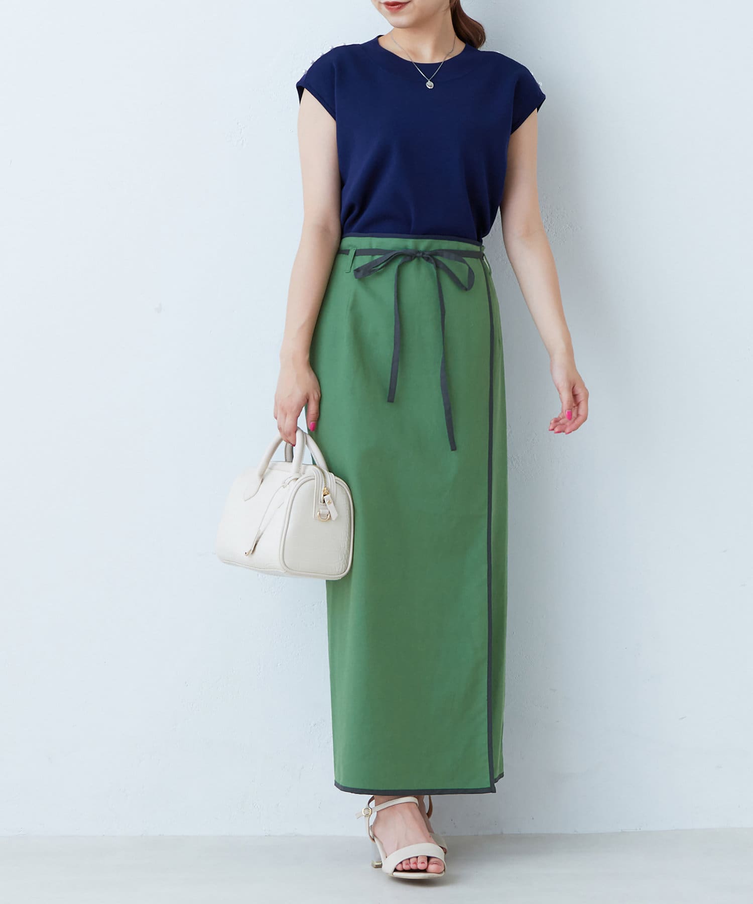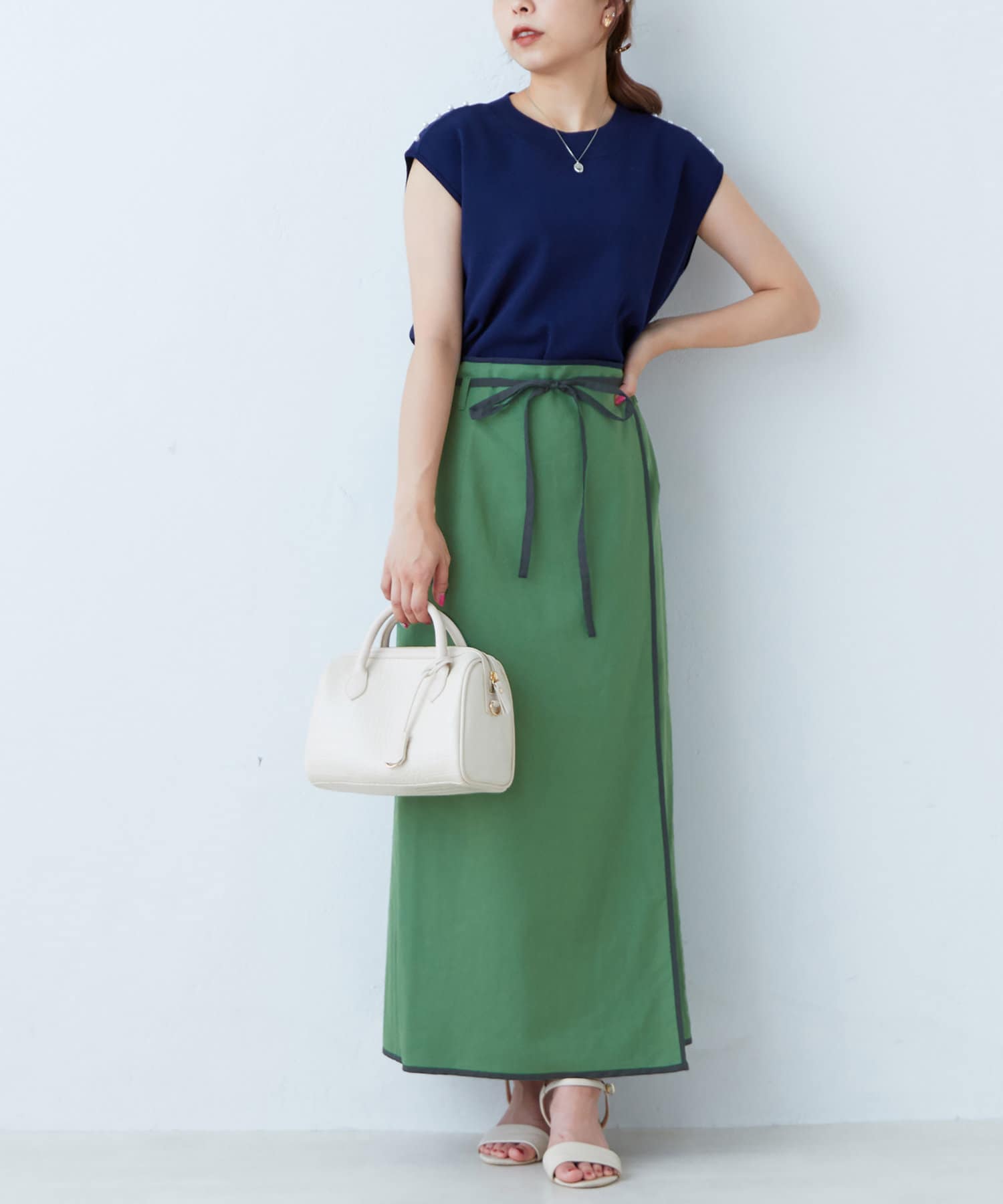 シンプルながらも配色パイピングデザインが目を惹くラップ風スカート。