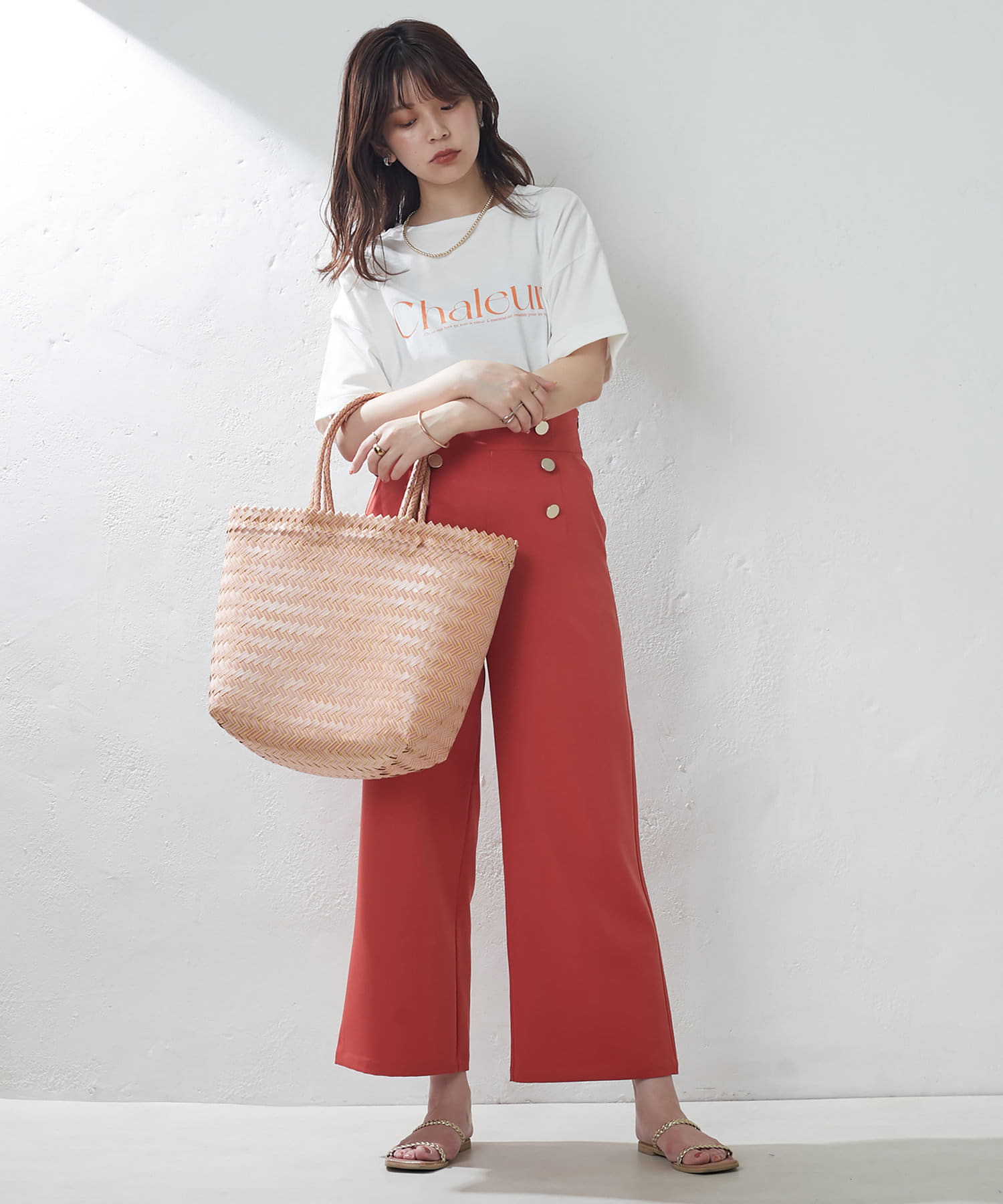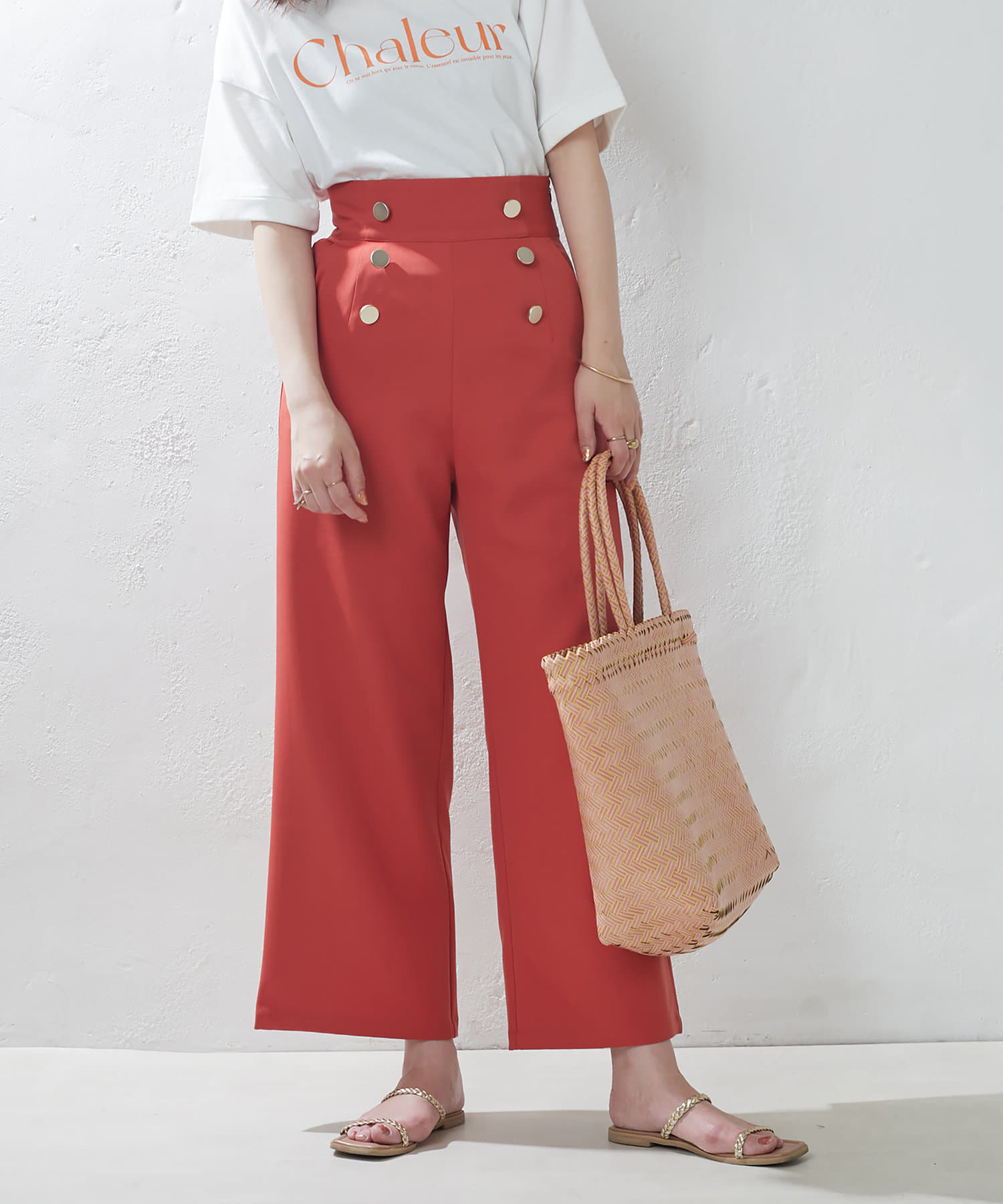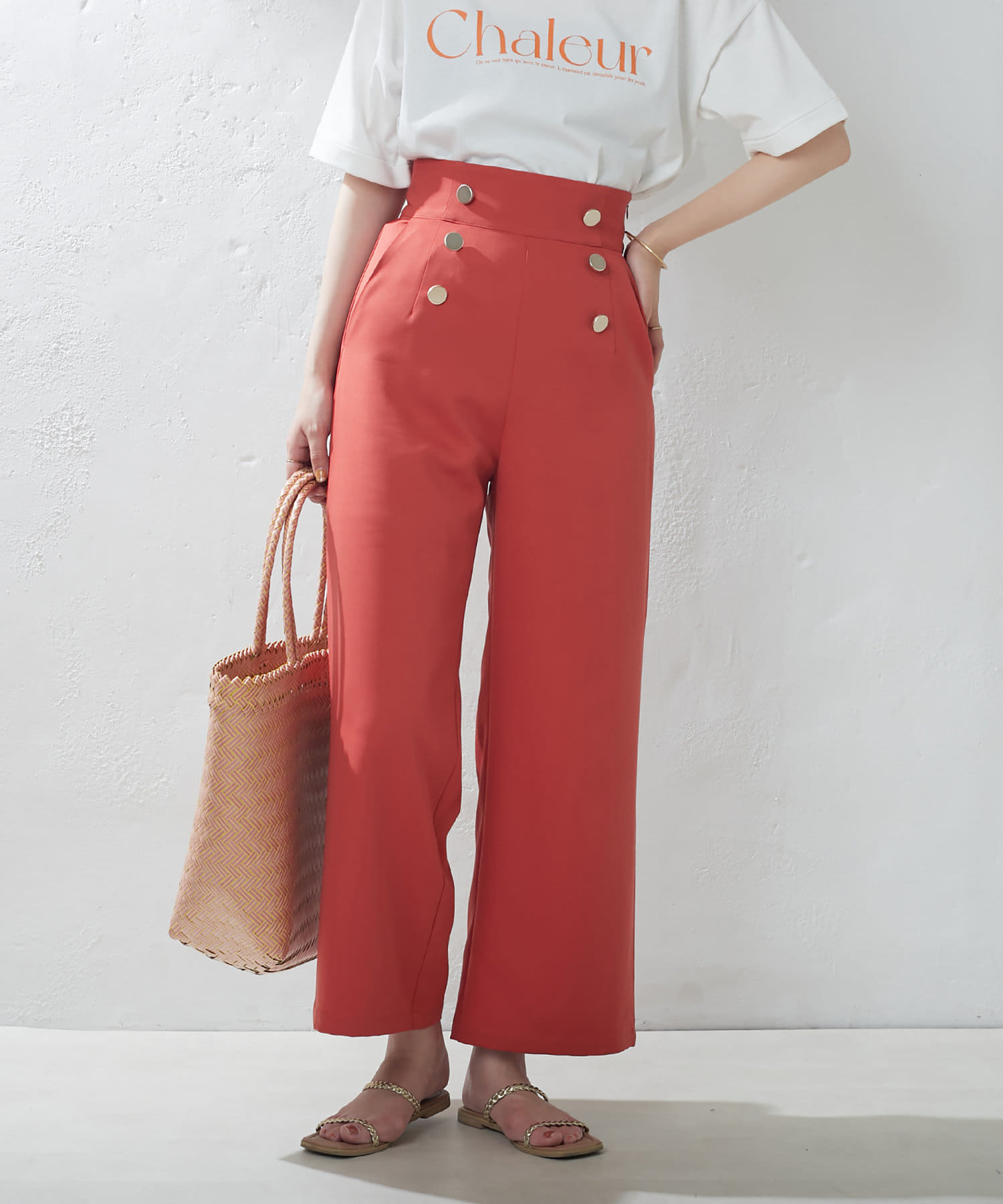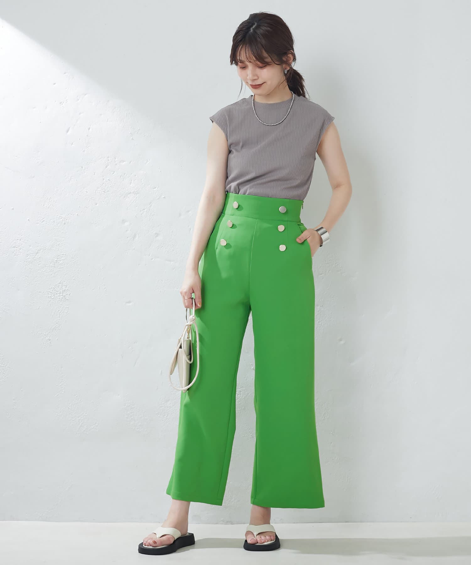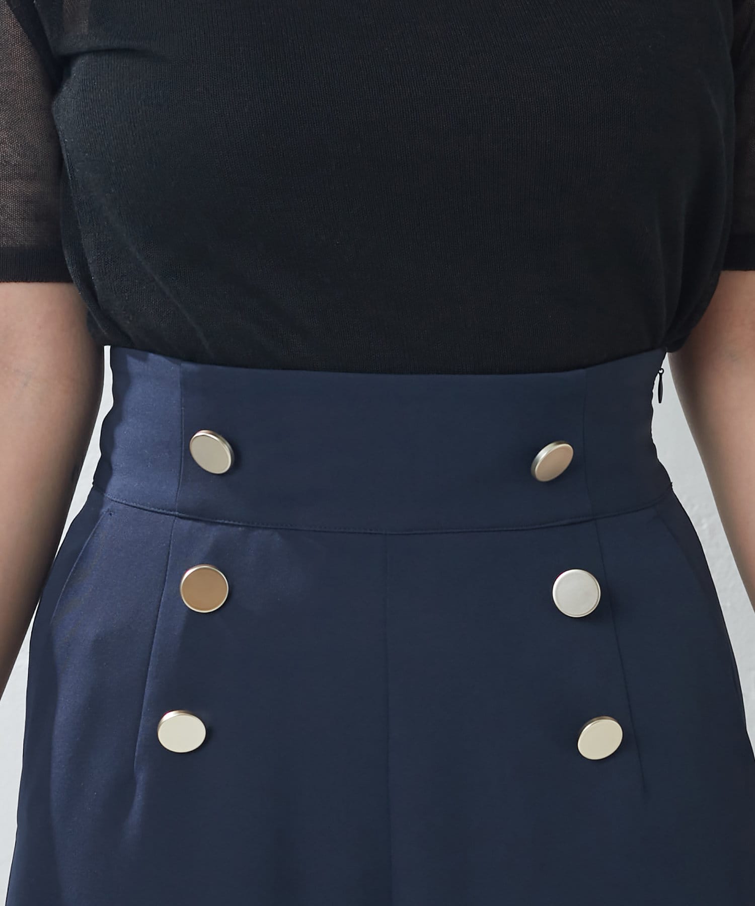 フロントに金ボタンがついているので、シンプルなトップスと合わせてもスタイリングが決まります。